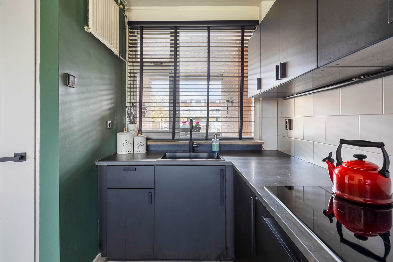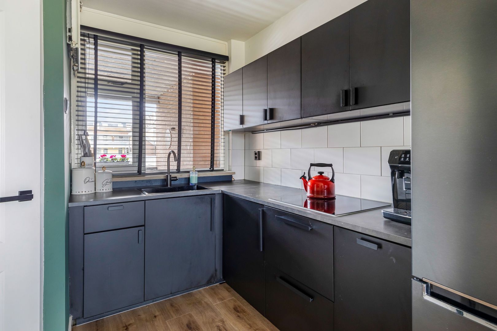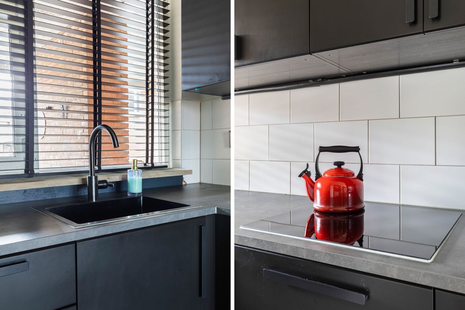 De keuken bevindt zich aan de voorzijde en heeft een keukenblok in L-opstelling. De keuken is voorzien van zwarte fronten, een gelamineerd werkblad, spoelbak en een inductie kookplaat. De losse koel-/vriescombi wordt ter overname aangeboden.