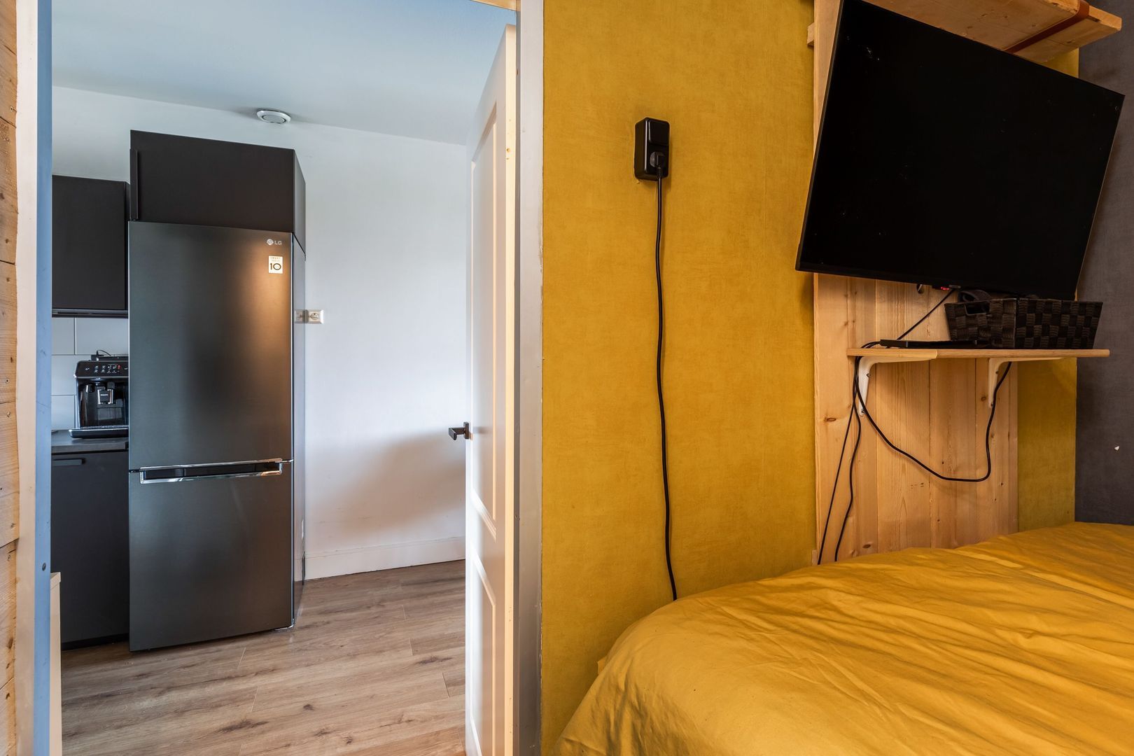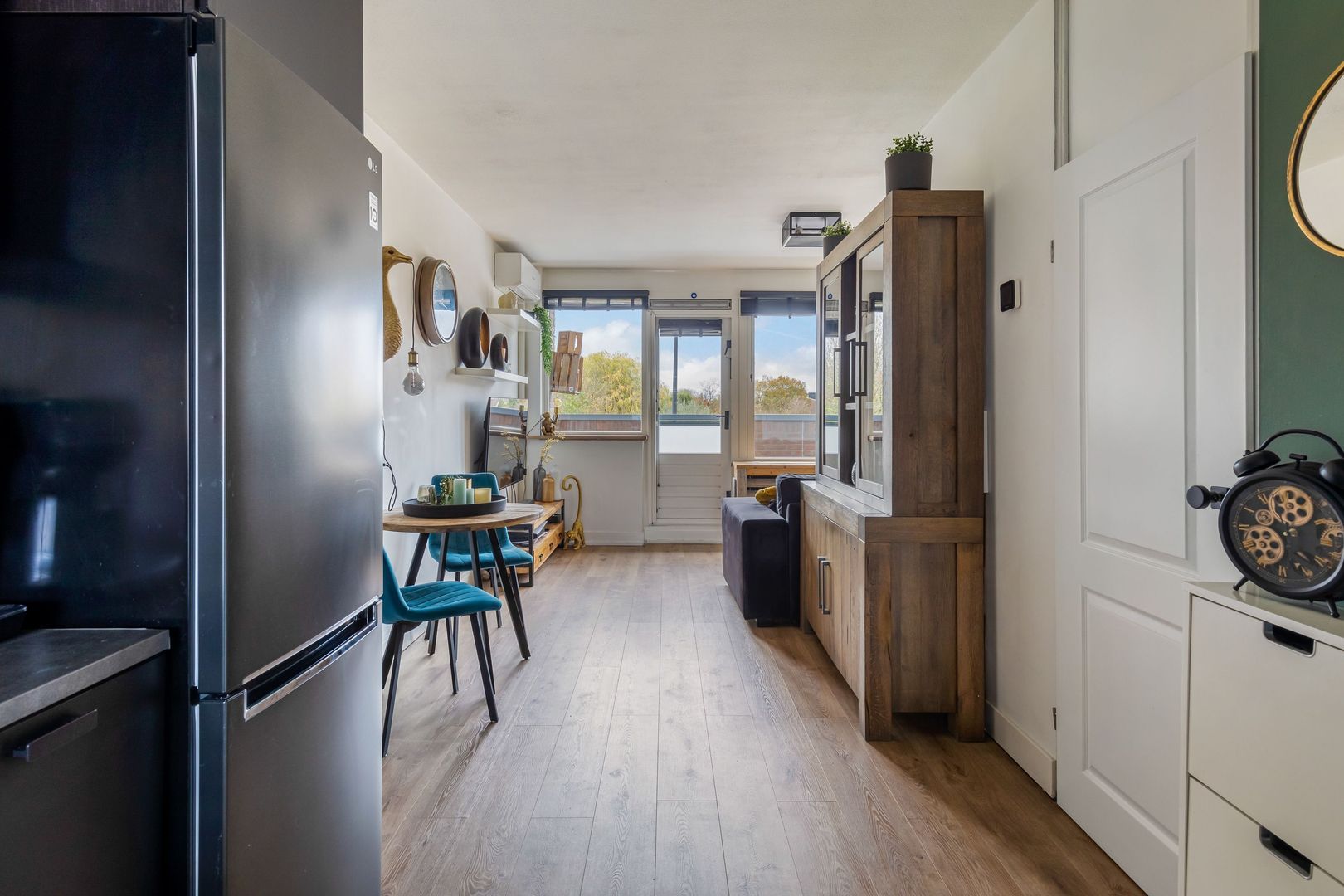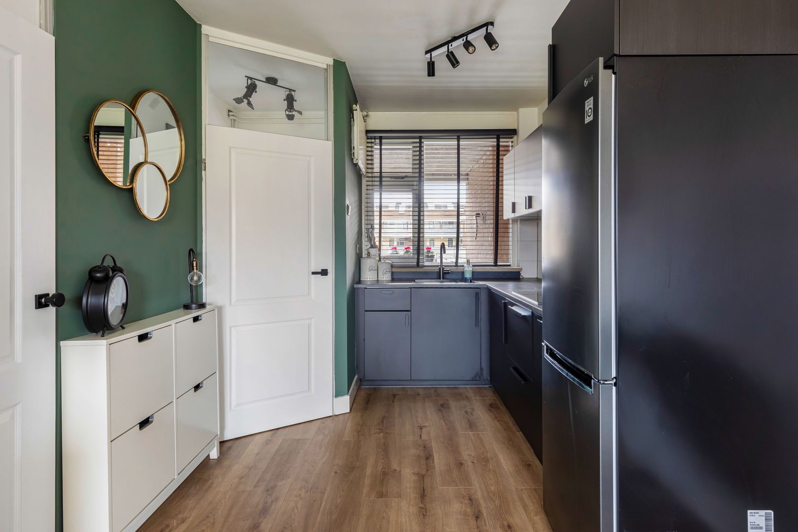 De keuken bevindt zich aan de voorzijde en heeft een keukenblok in L-opstelling. De keuken is voorzien van zwarte fronten, een gelamineerd werkblad, spoelbak en een inductie kookplaat. De losse koel-/vriescombi wordt ter overname aangeboden.