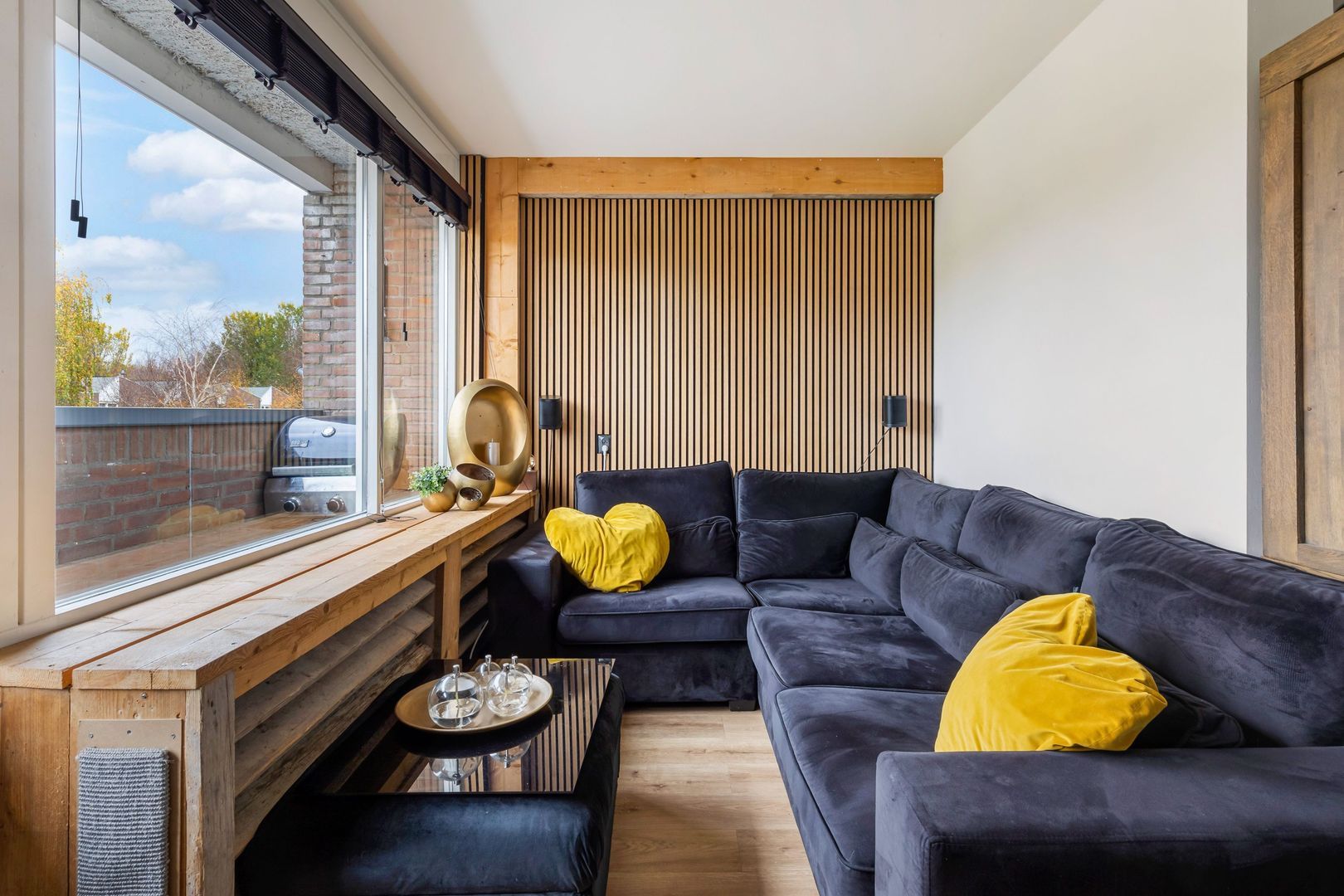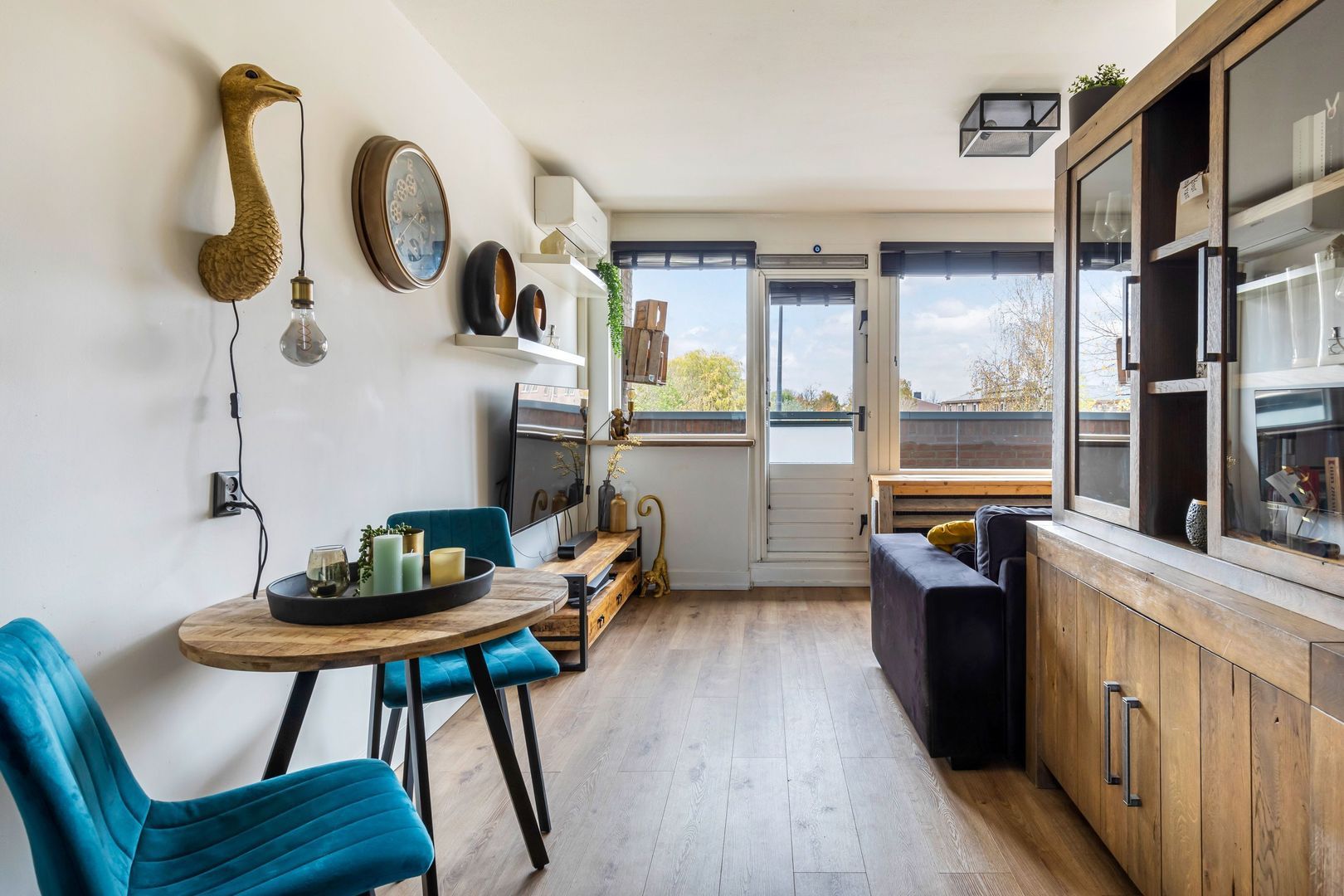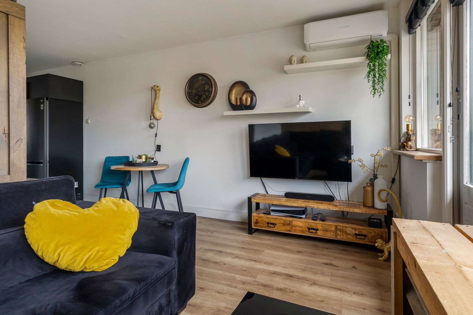 Woonkamer met open keuken van totaal 24 m2. De woonkamer is voorzien van gestuukte wanden, gestuukt plafond, houtlook laminaatvloer en een airco die zowel kan koelen als verwarmen.