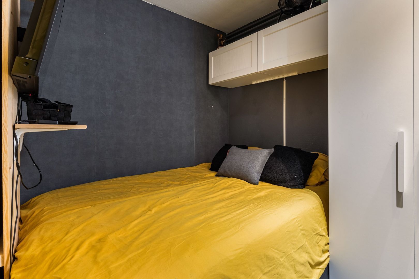 In het midden van de woning is een slaapkamer gerealiseerd met een kast op maat.