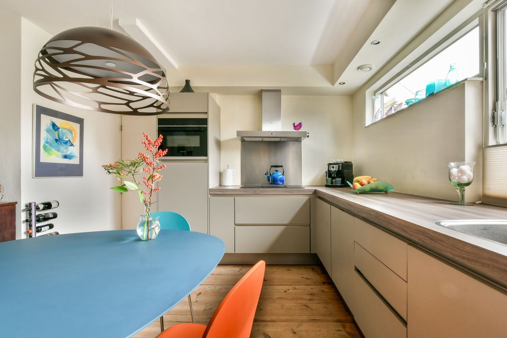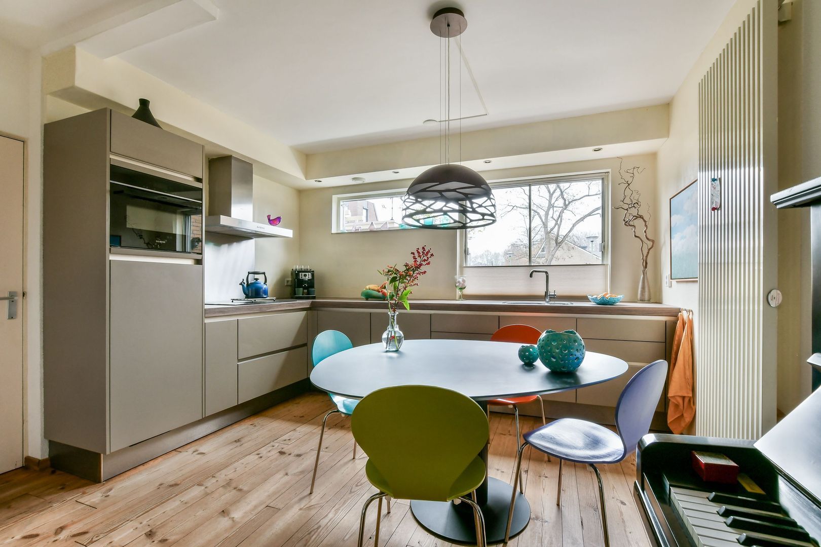 Mooie moderne, greeploze hoekkeuken met veel lades, ingebouwde verlichting en de volgende inbouwapparatuur: inductiekookplaat, afzuigkap, vaatwasser, heteluchtoven, koelkast en designradiator.