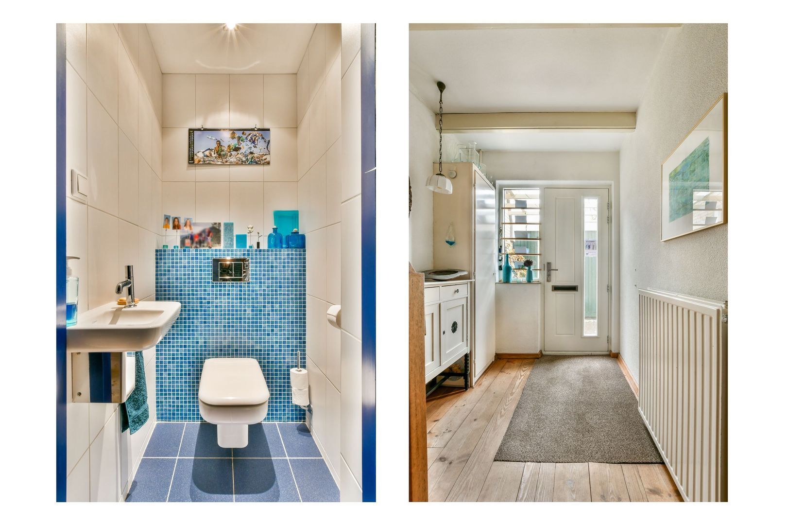 Entree, royale hal van 9 m² met vernieuwde voordeur, meterkast en moderne toiletruimte met zwevend toilet, fonteintje en ingebouwde plafondverlichting.