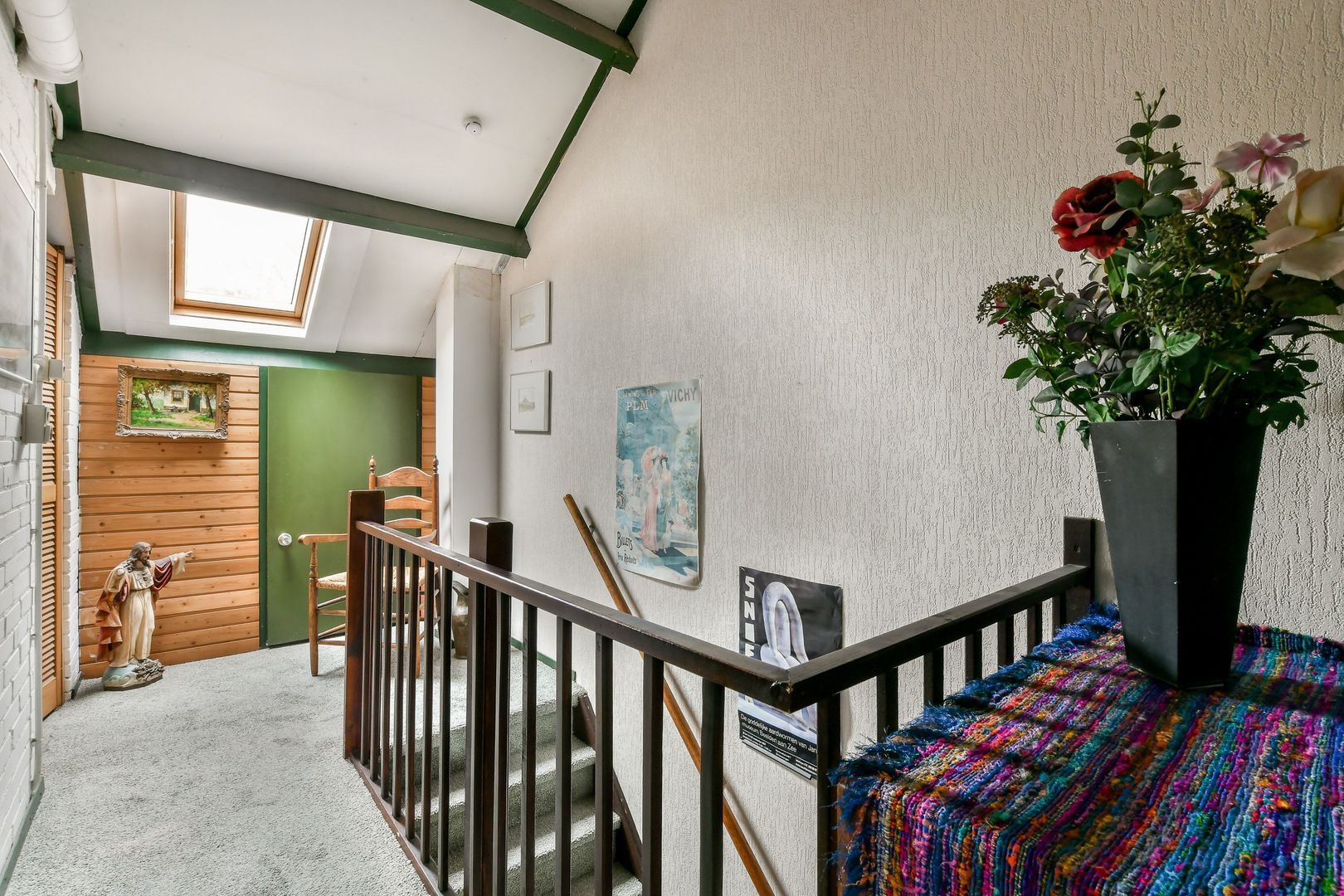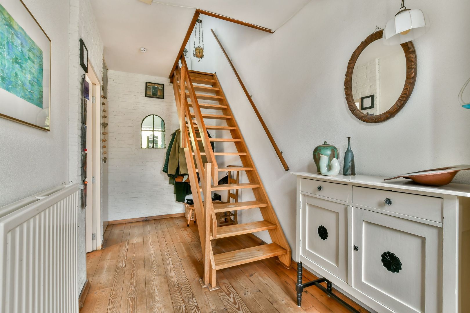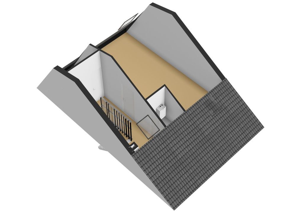 Ruime overloop/zolder, natte ruimte met aansluiting voor wasmachine en wasdroger en opstelling van de combi-cv-ketel. Bergruimte in de schuine dakvlakken, dakraam en mogelijkheid voor een bergvliering.