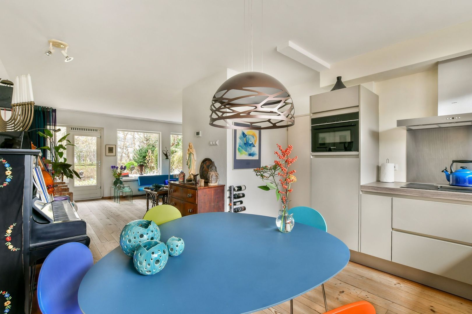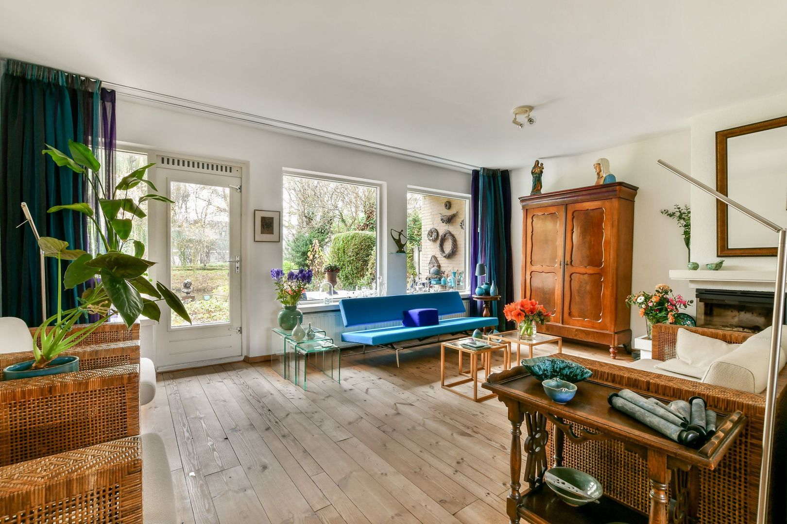 Royale woonkamer van ca. 43 m² met grenen vloer, moderne open haard met hoog rendement, strak gestukt plafond en spachtelputzwanden. Vanuit de woonkamer heb je heerlijk vrij uitzicht op het groen en de waterpartij.