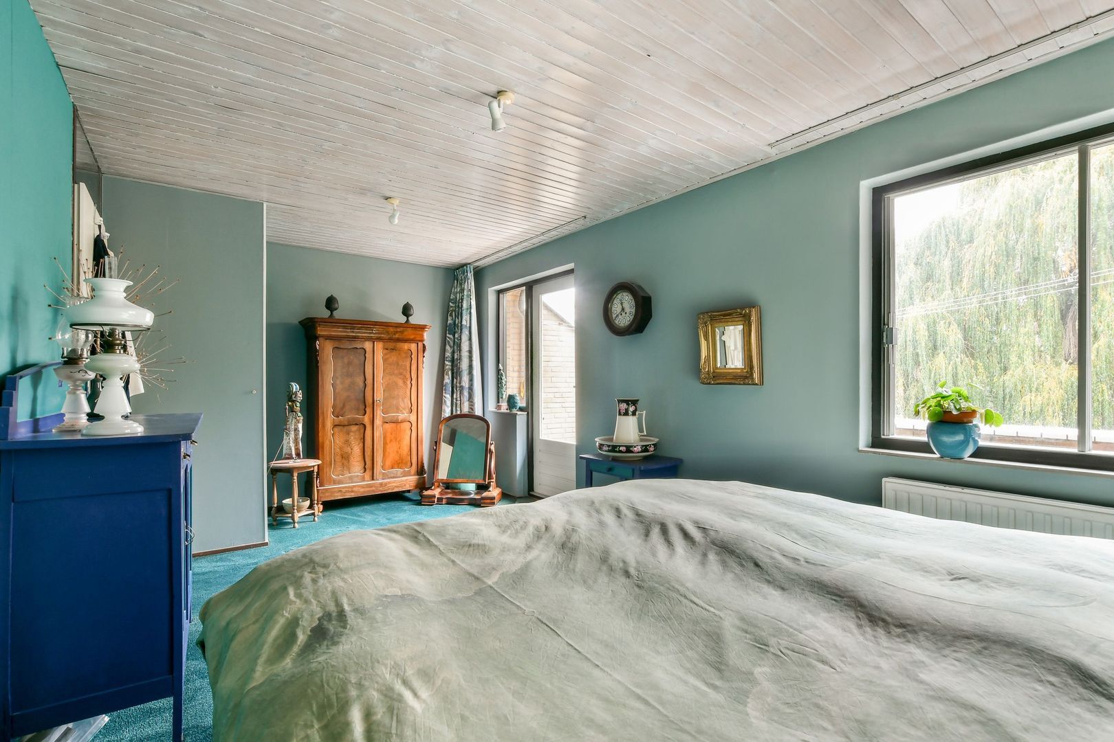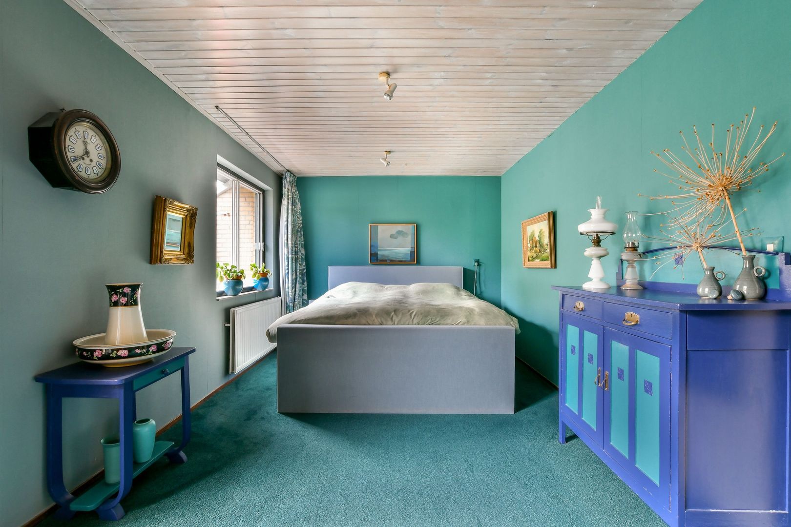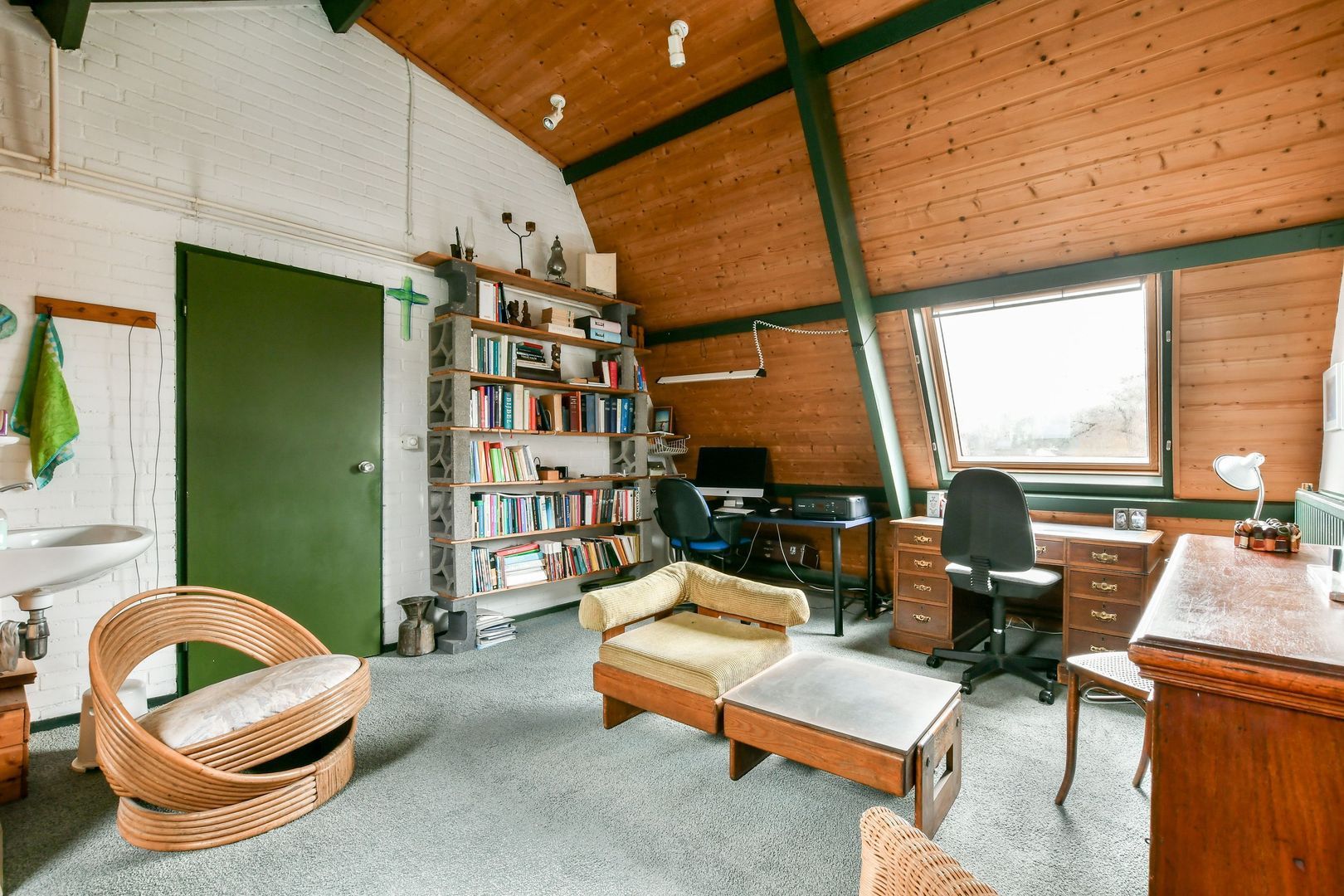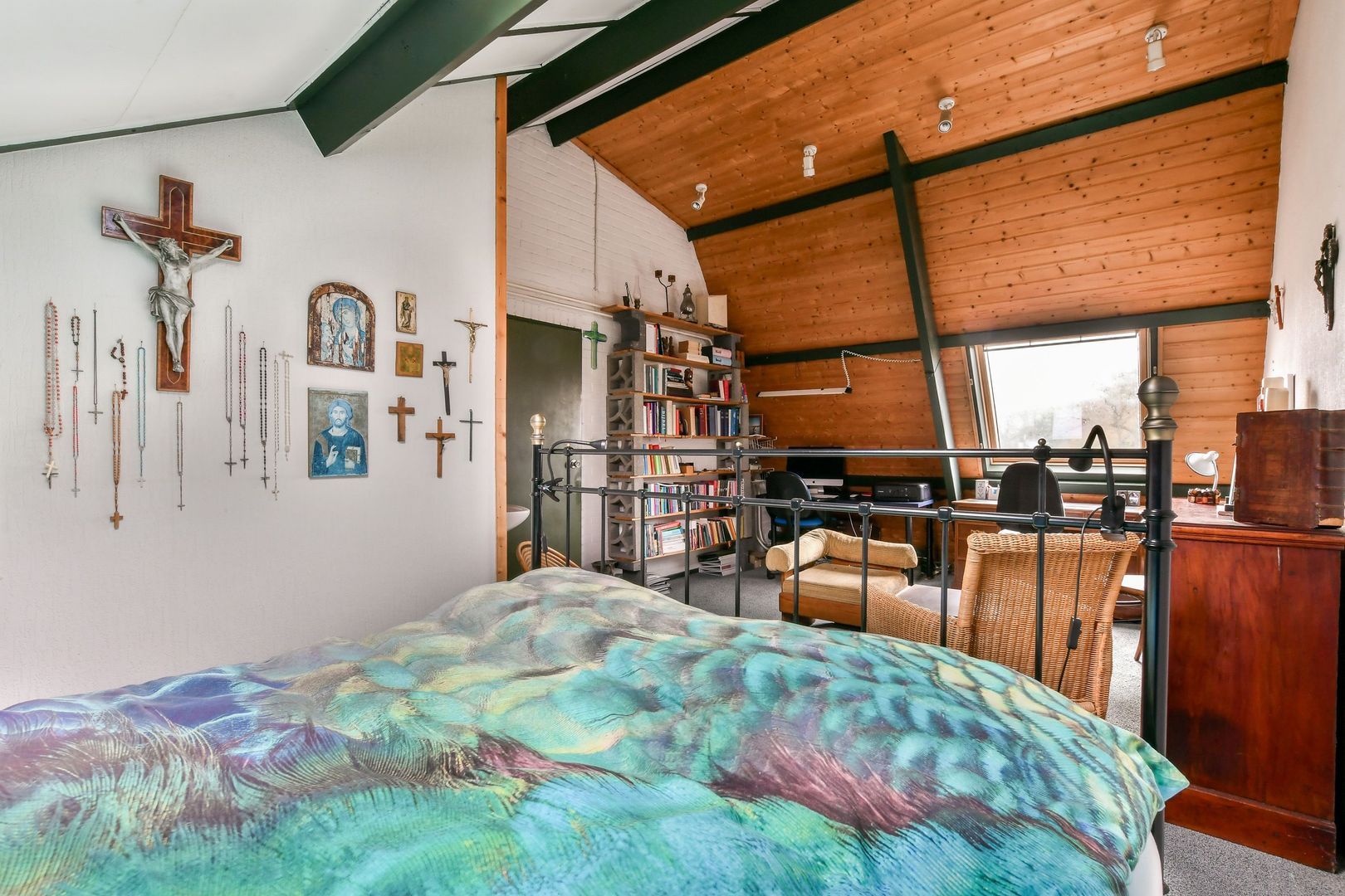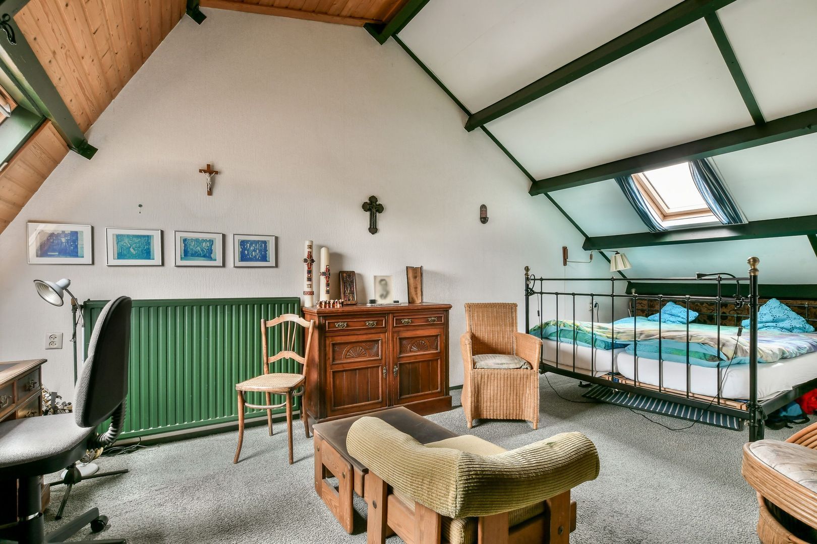 Royale, gezellige zolderkamer van 26 m² met dubbel dakraam, wastafel, hoog plafond met 3,5 meter nokhoogte en bergruimte in de schuine dakvlakken.