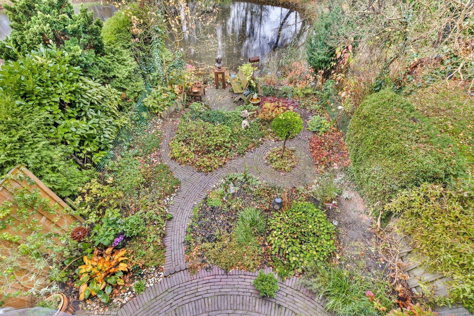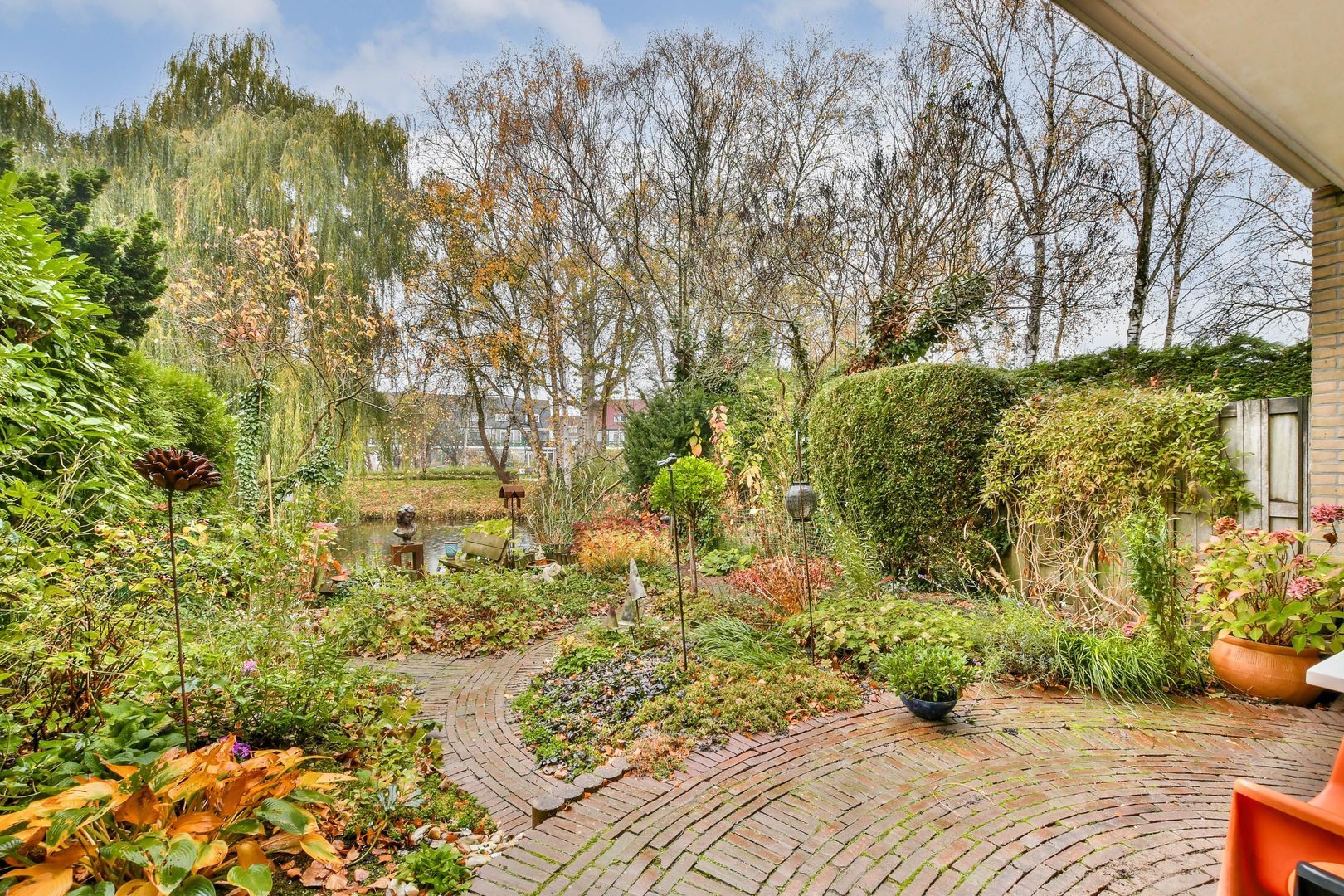 Zonnige achtertuin op het westen, ca. 10 meter diep en 6 meter breed, sfeervol aangelegd met terrassen, sierbestrating, veel gevarieerd groen en een heerlijk terras aan het water.