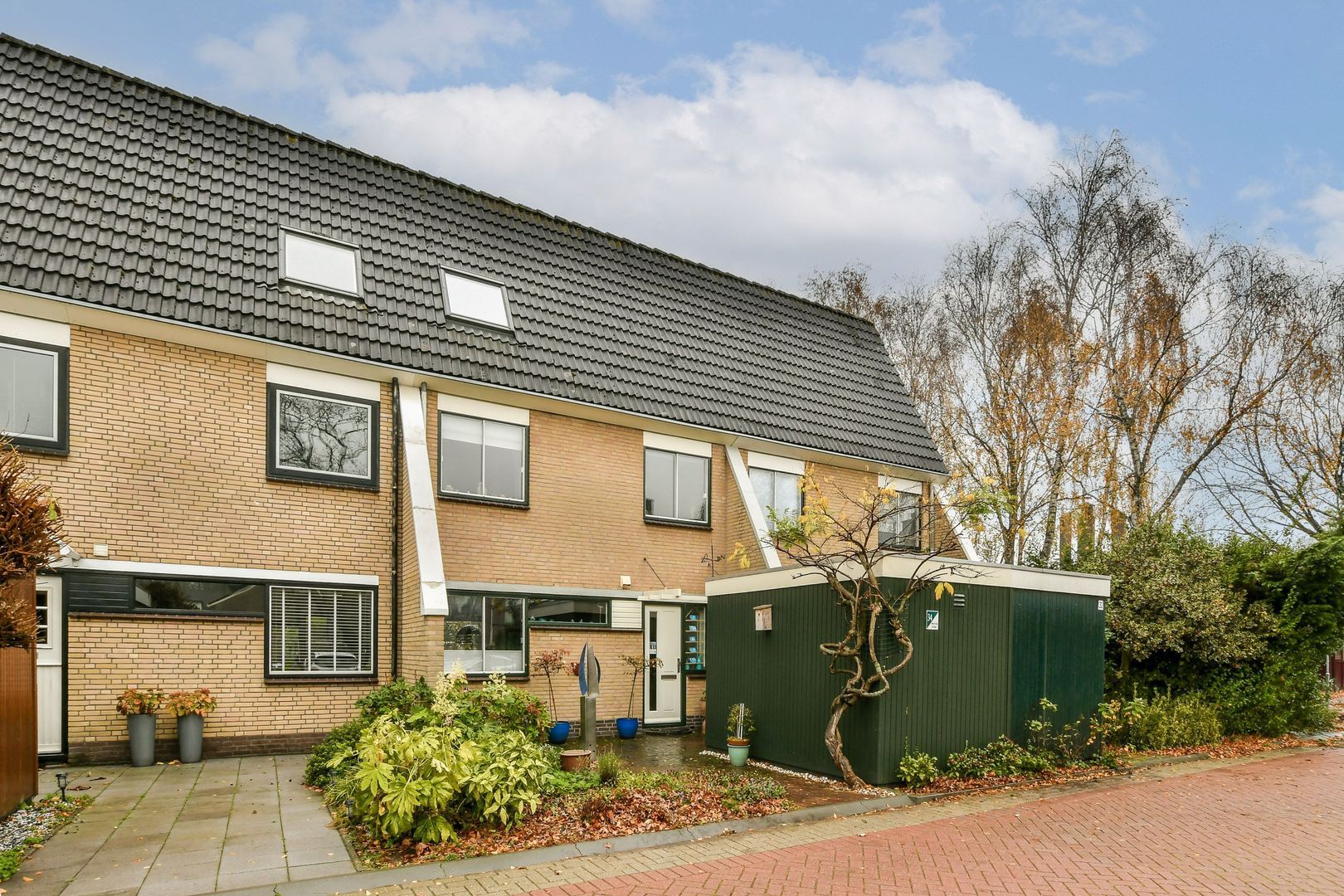 Mooi aangelegde voortuin met ochtendzon, ca. 6 meter diep, met ruime berging van 7 m² voorzien van elektra.