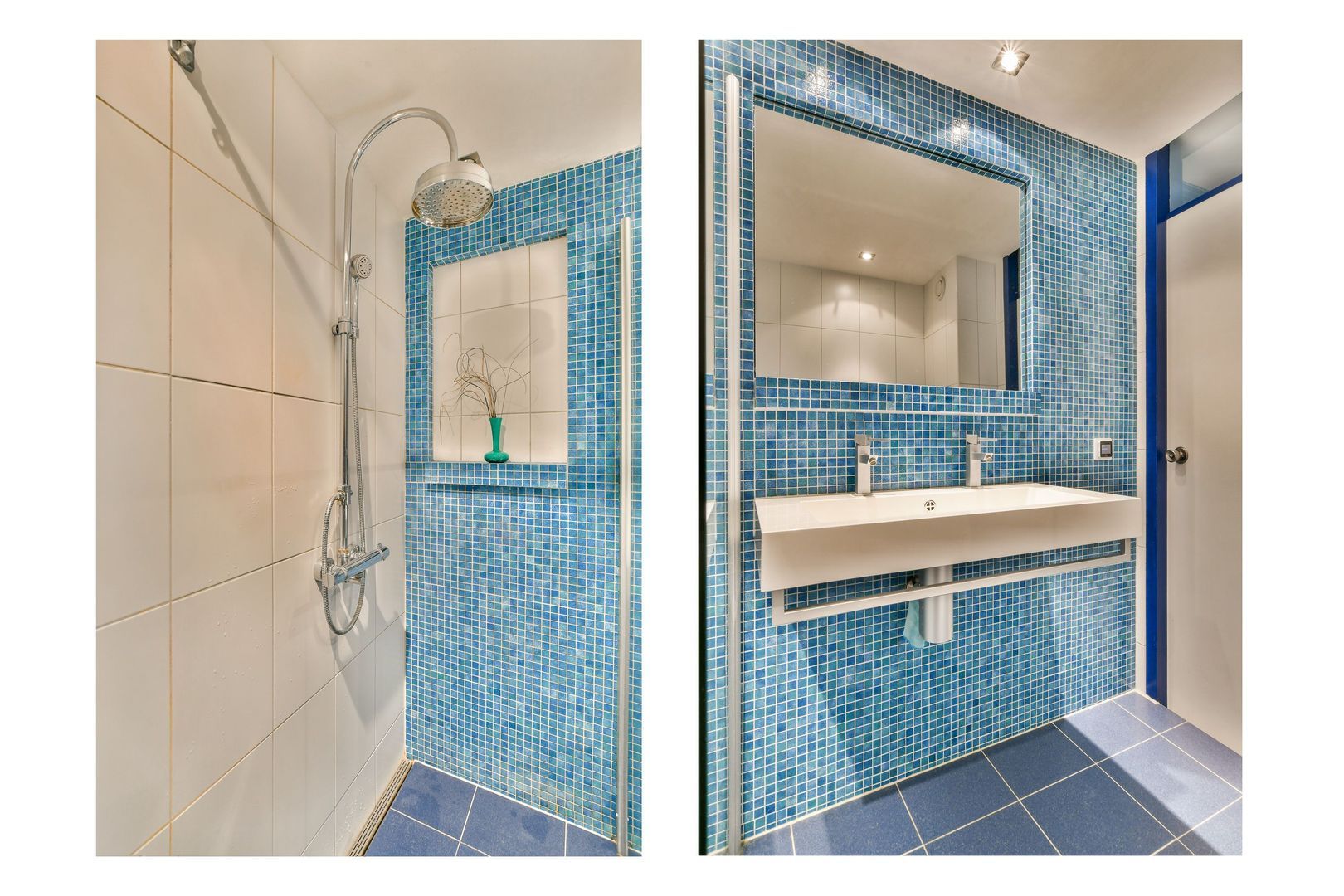 Moderne badkamer met witte betegeling en blauwe mozaïekaccenten, voorzien van ruime inloopdouche met stortdouche en thermostaatkraan, zwevend 2e toilet, brede dubbele wastafel, verwarmde spiegels en elektrische vloerverwarming.
