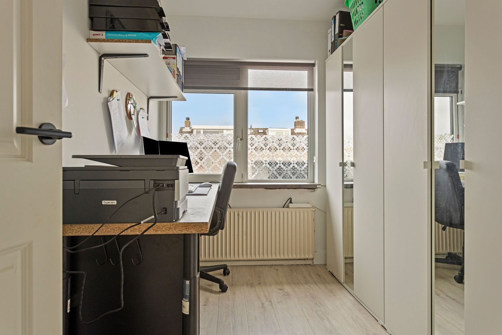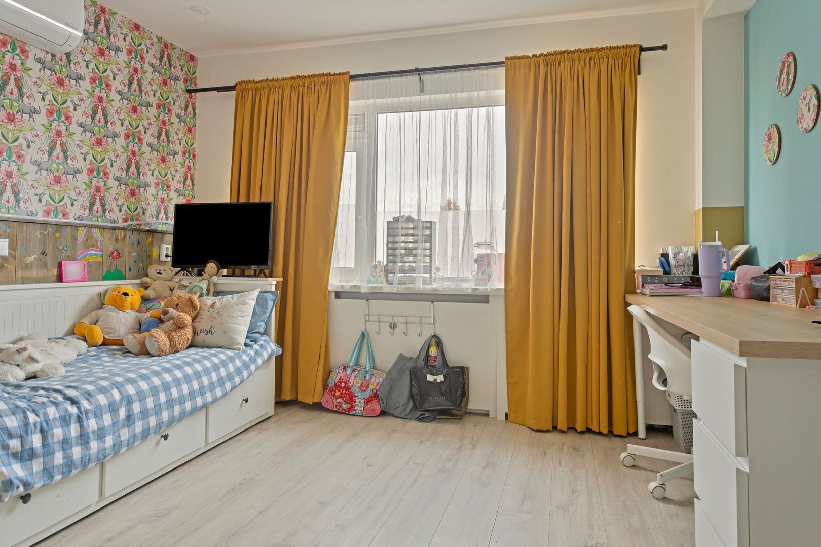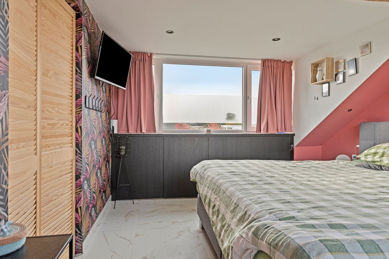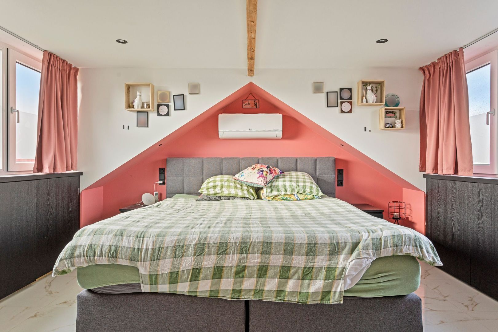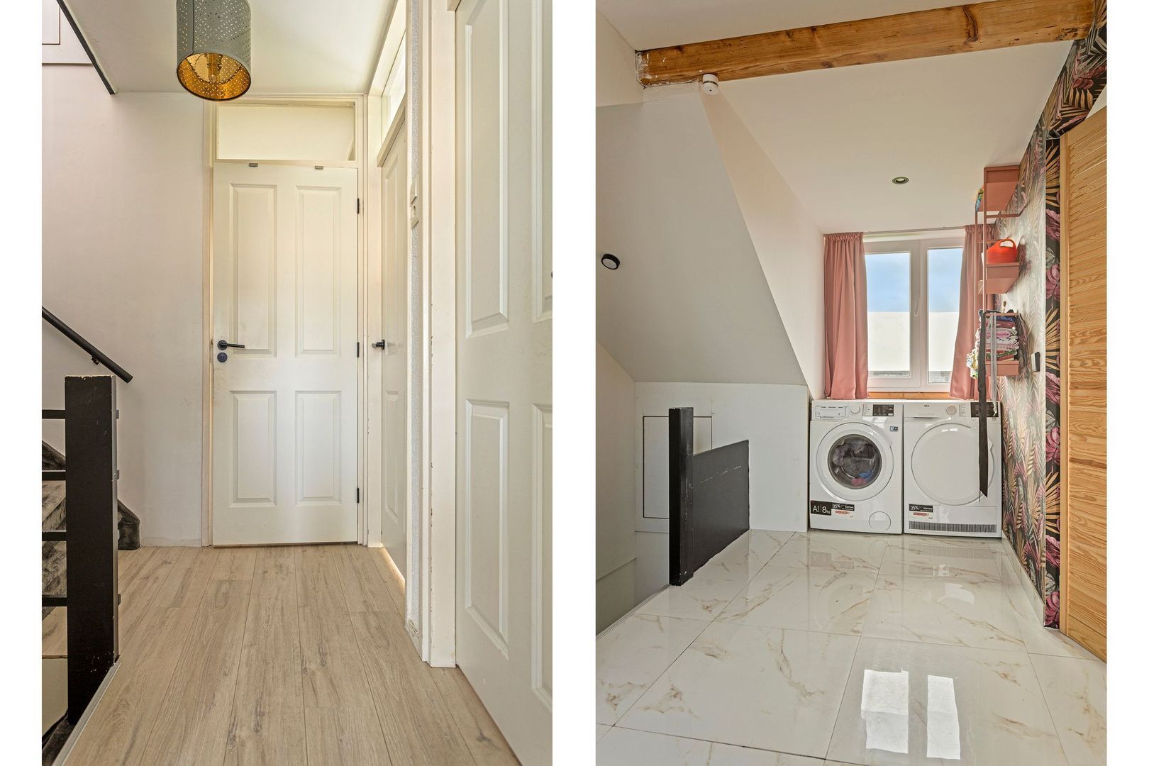 Overloop met marmerlook tegel, met aansluiting wasmachine en bergruimte, grote dakkapel over de nok heen, zolderkamer van ca. 13 m2 met geïsoleerde voorzetwanden, plafond met ingebouwde verlichting, dakisolatie, airco en veel licht. Bergruimte in de schuine dakvlakken.