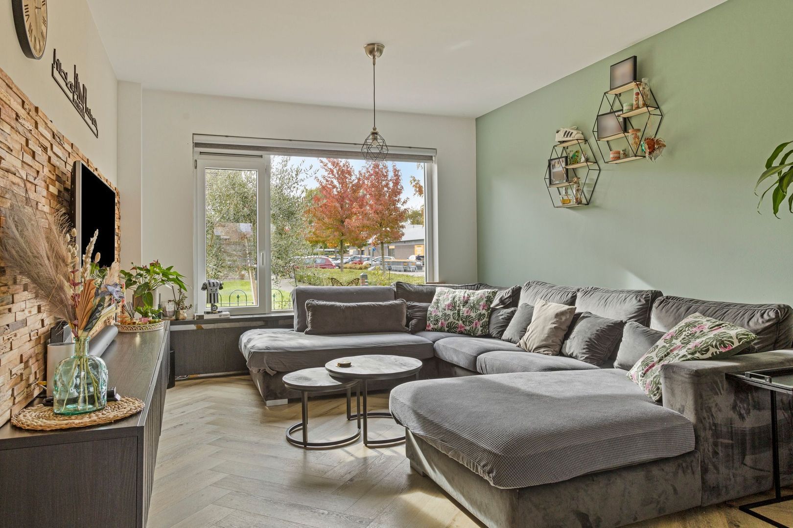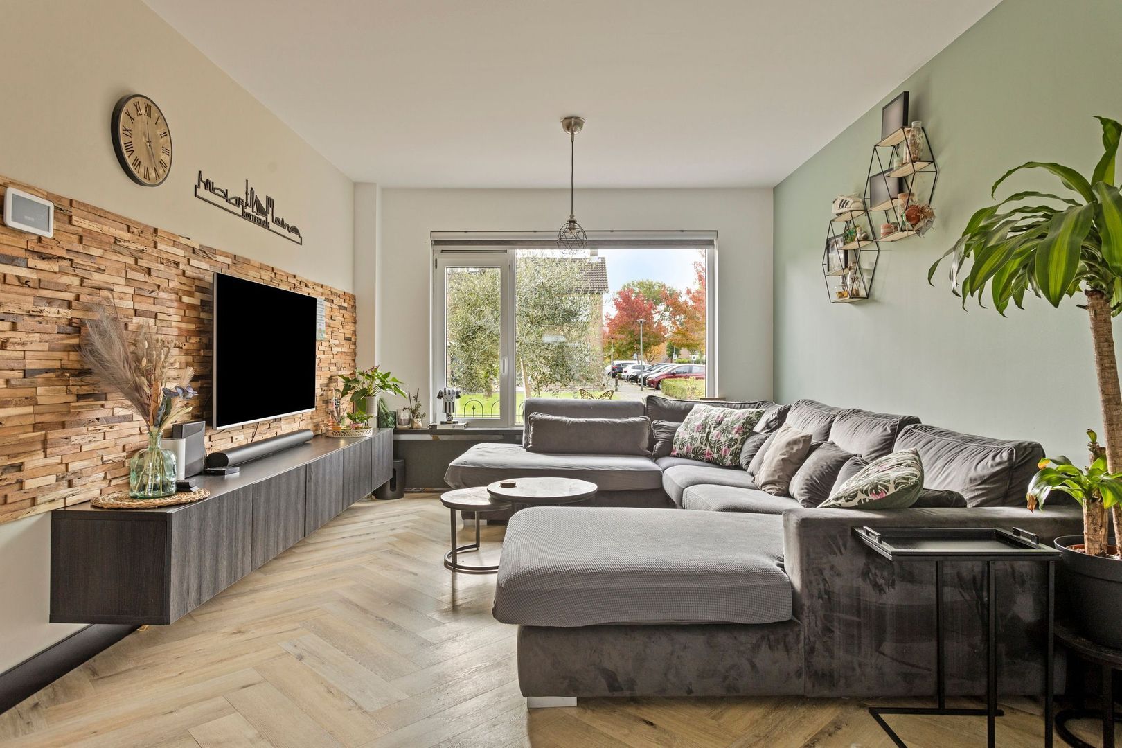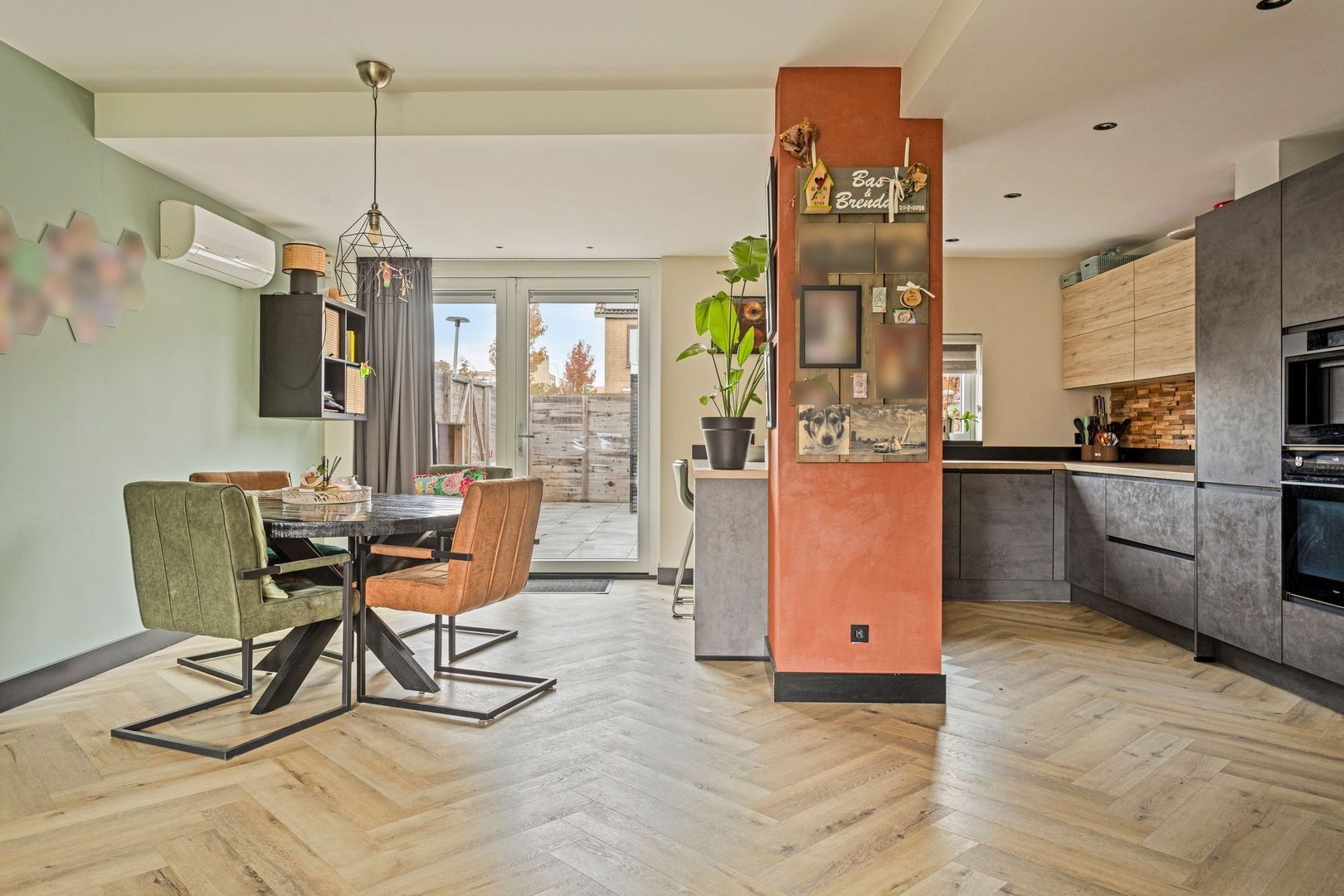 Vergrote woonkamer met open keuken van totaal 45 m2 en vrij uitzicht op groen plein, voorzien van vloerverwarming en mooie in visgraat gelegde pvc-vloer, gladstuc wanden en plafond. Er is een airco, openslaande deuren naar de tuin en een mooie stalen deur naar de hal.
