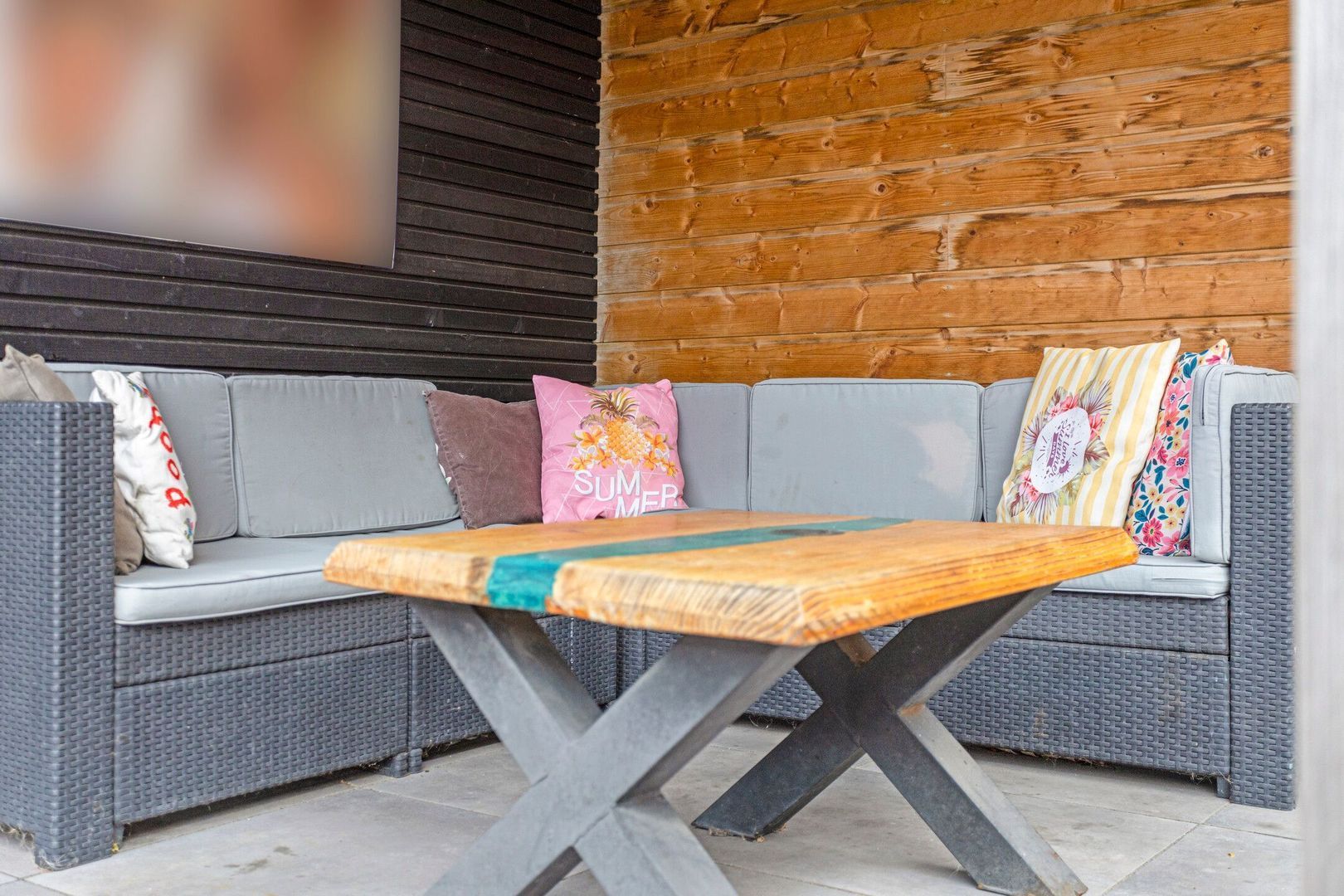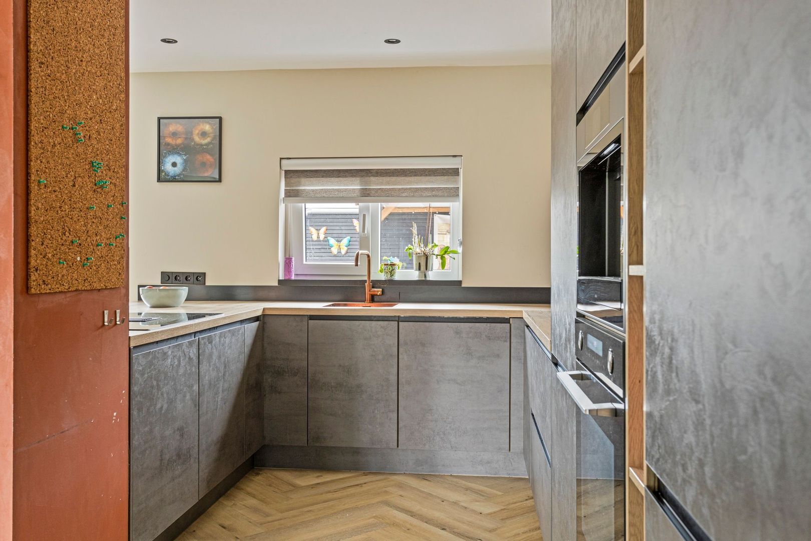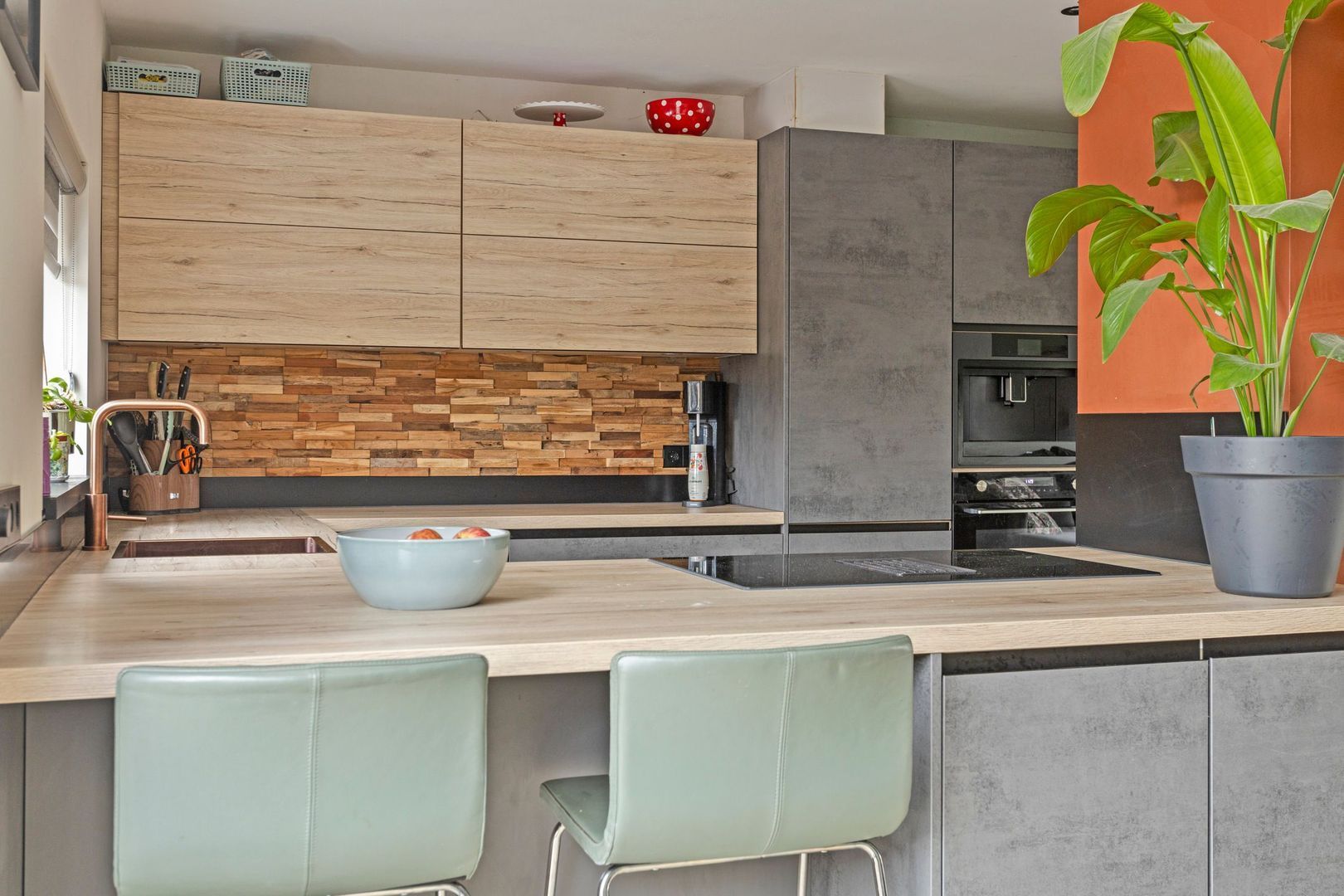 Vergrote woonkamer met open keuken van totaal 45 m2 en vrij uitzicht op groen plein, voorzien van vloerverwarming en mooie in visgraat gelegde pvc-vloer, gladstuc wanden en plafond. Er is een airco, openslaande deuren naar de tuin en een mooie stalen deur naar de hal.