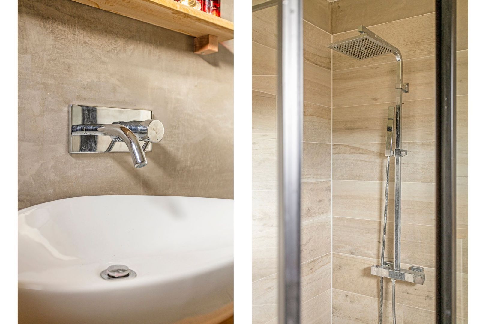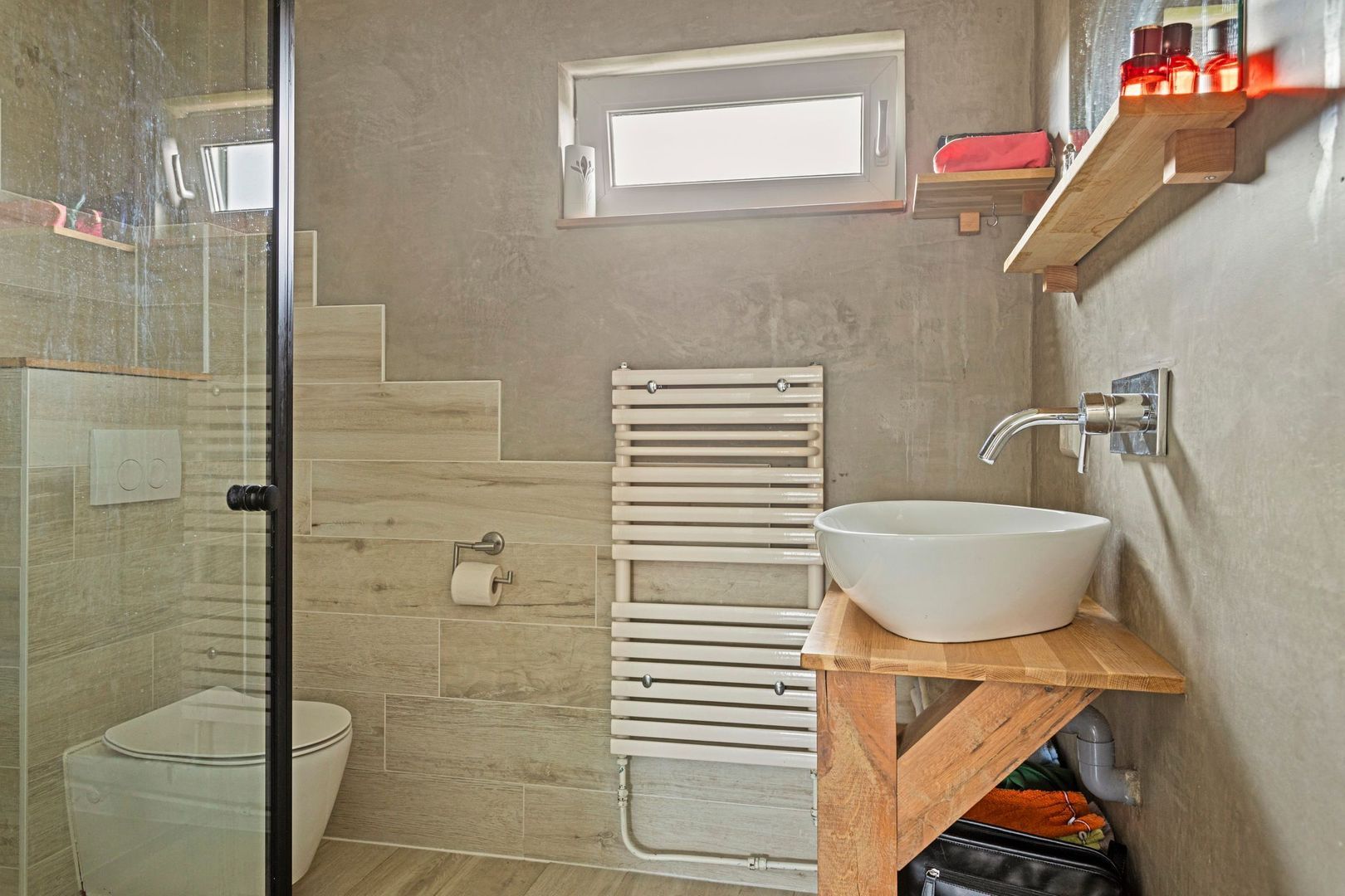 Luxe nieuwe badkamer met betonciree en houtlook vloertegel, douchecabine met watergoot, wastafelmeubel, handdoekradiator, raam met daglicht.
