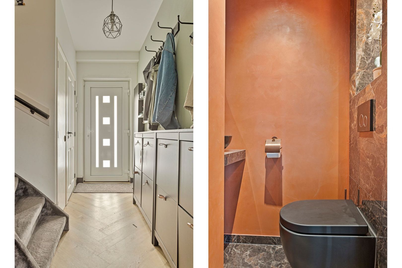 Entree, hal, luxe uitgevoerde toiletruimte met zwevend toilet en fonteintje, trapkast en meterkast.
