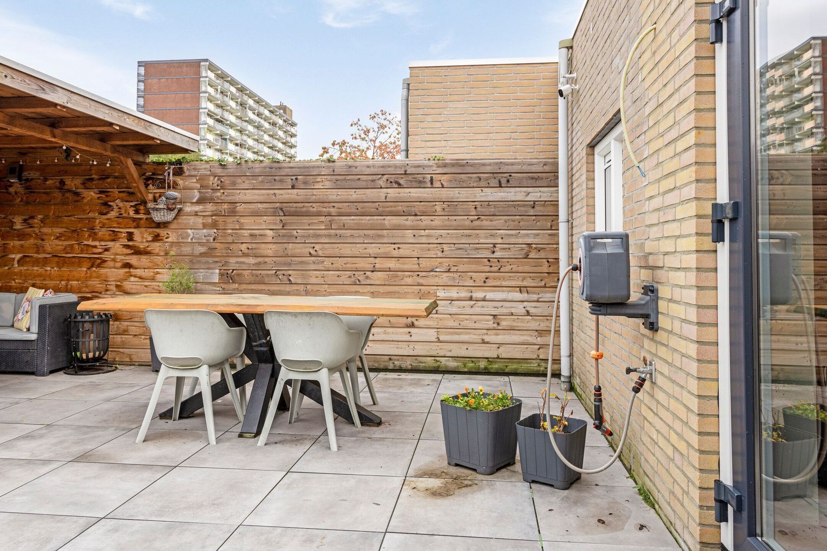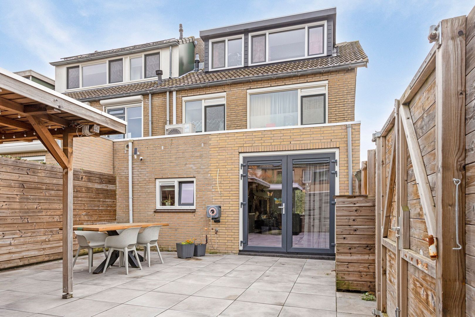 Zonnige achtertuin ca. 9,3 meter diep en ca. 6,14 meter breed op het noordwesten gelegen met terrassen van strakke grote betontegels, terrasoverkapping, buitenkraan. Grote stenen berging van 10 m2, betegeld, met kastenwand en voorzien van elektra. De achtertuin heeft een achterom.