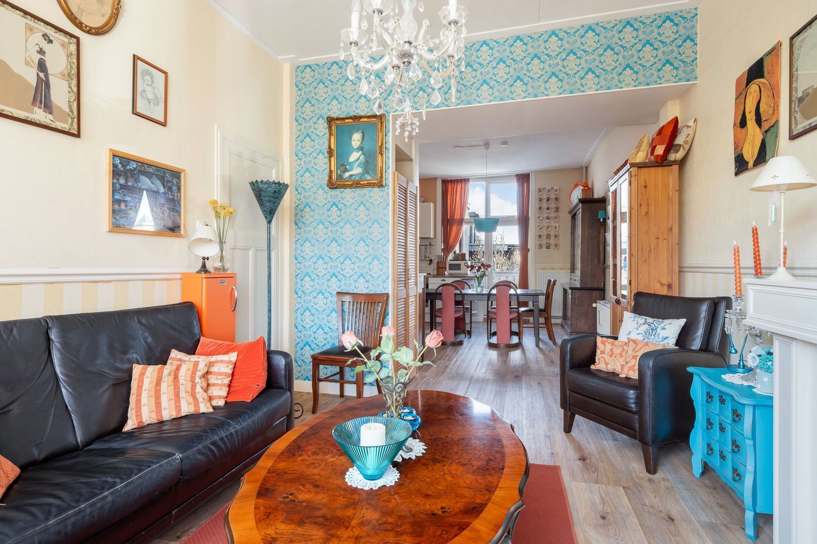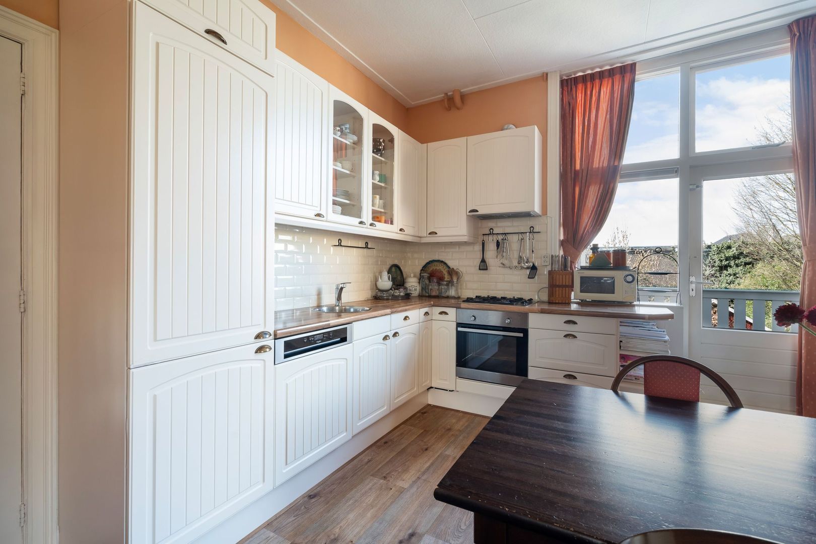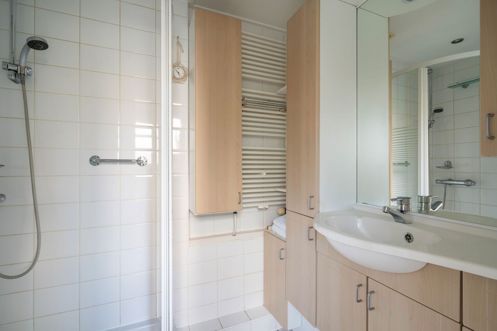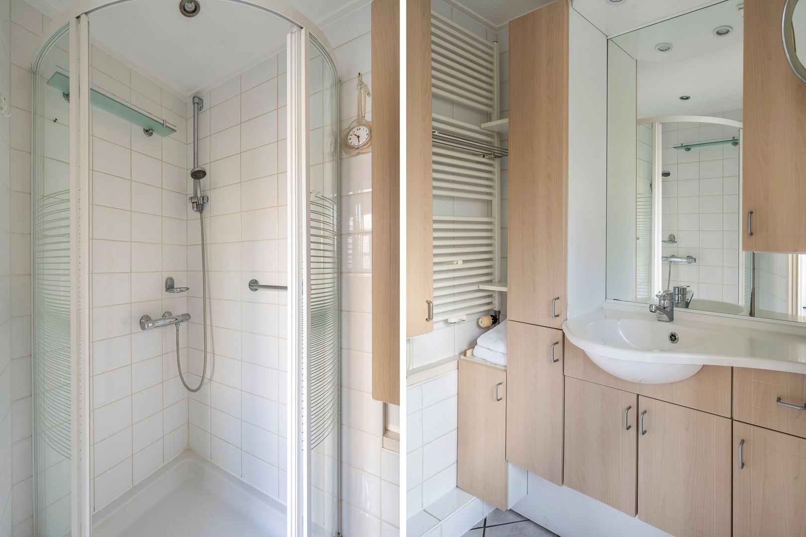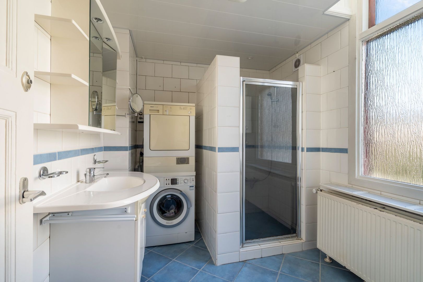 Ruime overloop met raam, vervolgens de tweede badkamer, bestaande uit douche, wastafelmeubel, systeemplafond, aansluiting voor wasmachine en een combinatie van wit en blauw tegelwerk. Daarna een toilet in witte uitvoering met fonteintje. Woonkamer met open keuken van in totaal 36 m². De Ikea-hoekkeuken is voorzien van de volgende apparatuur: vaatwasser, oven, 4-pits gaskookplaat, afzuigkap en koel-vriescombinatie. De woonkamer is lekker licht door de grote ramen en het zijraam. Op de vloer ligt een marmoleumvloer met eikenmotief. Openslaande deuren naar het achterterras van ca. 9 m² met westenligging en aan de voorzijde ook openslaande deuren naar het voorbalkon met vrij uitzicht over het plein en de singel. Voorslaapkamer van ruim 6 m² voorzien van het enige raam met enkel glas in de woning. Trapopgang naar de tweede verdieping.