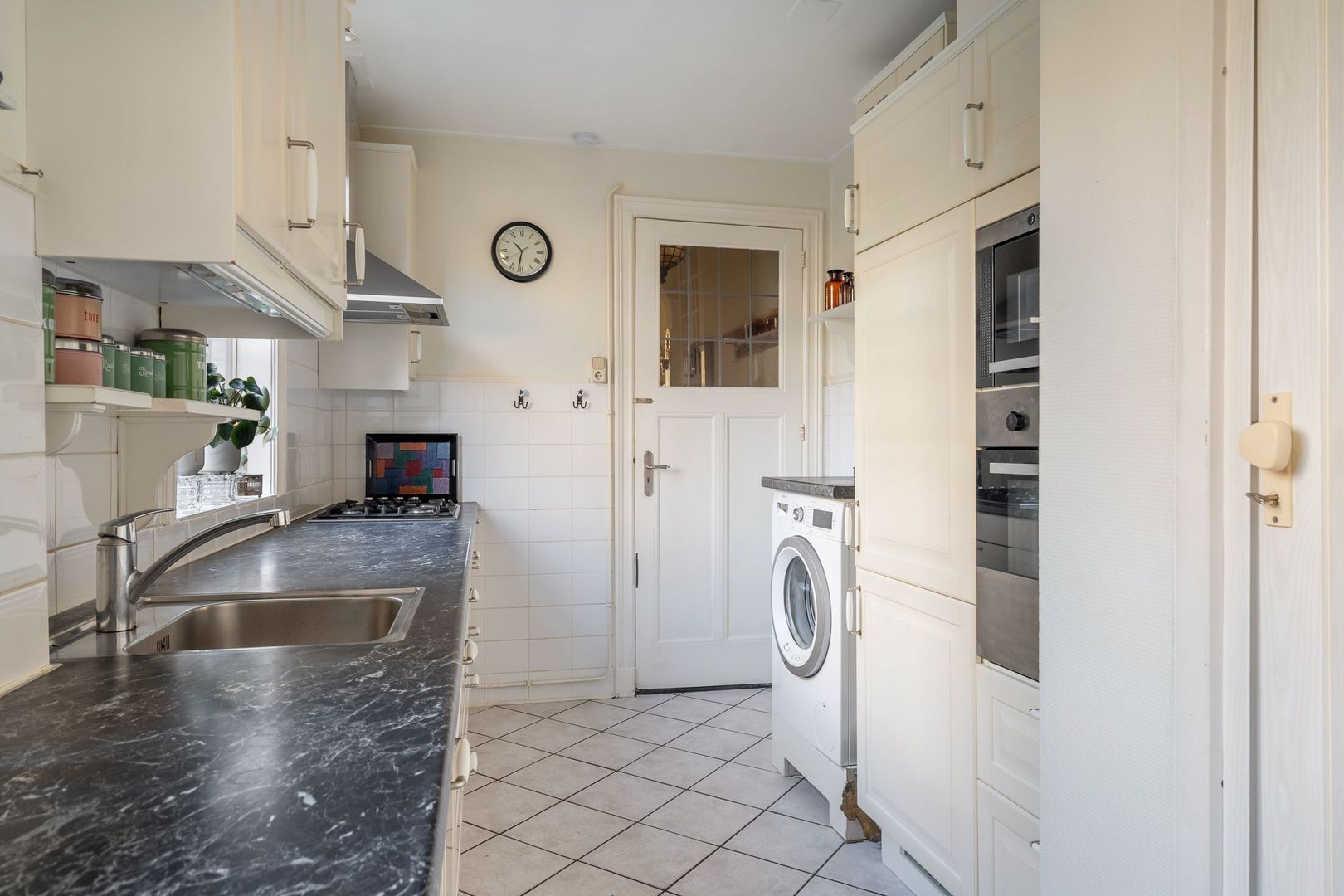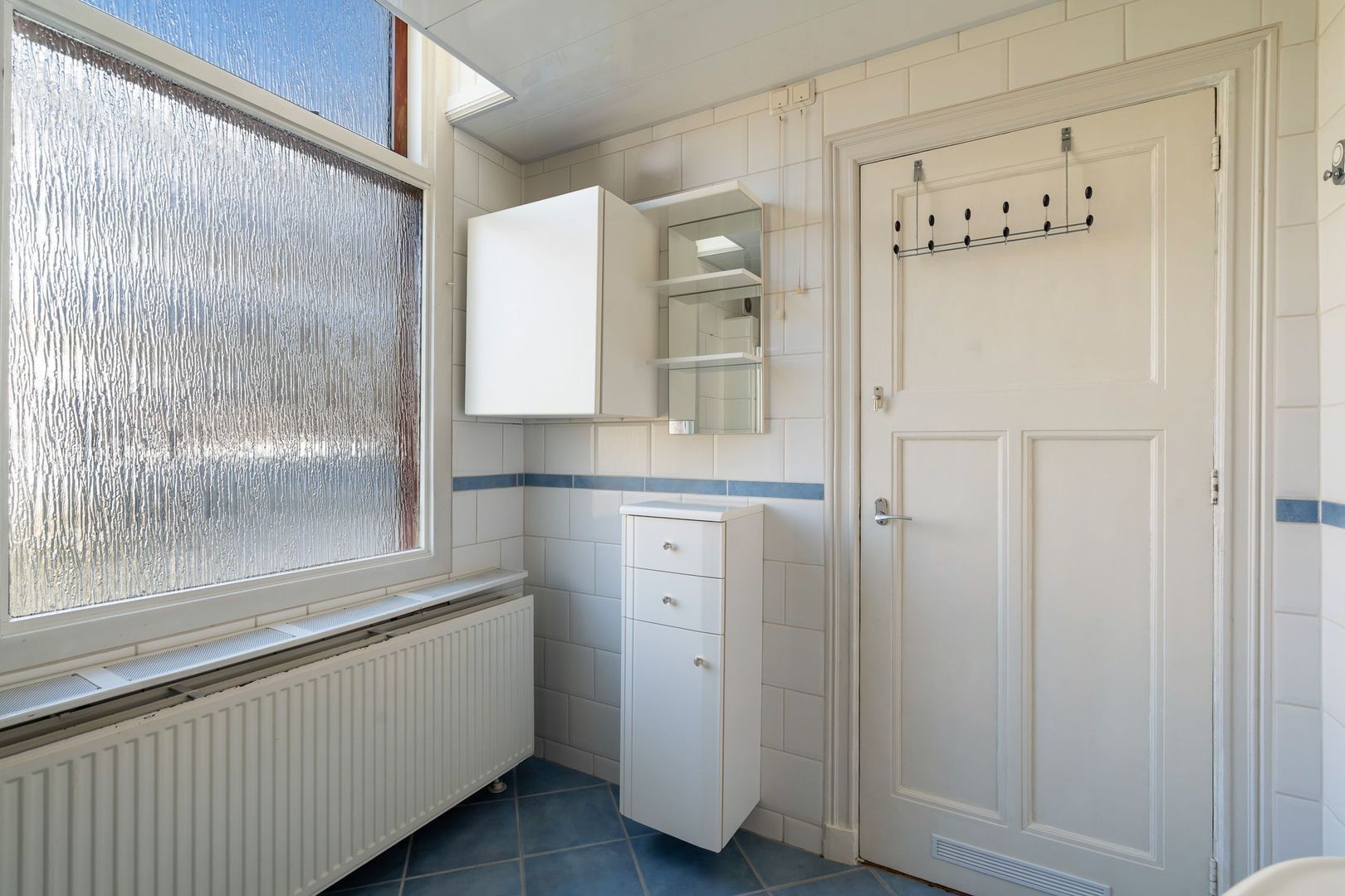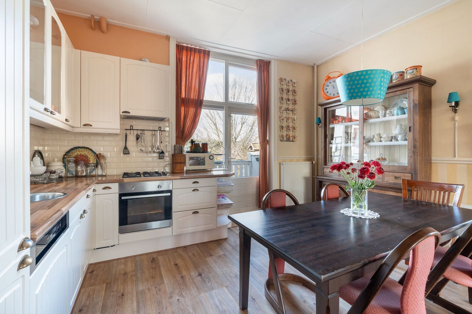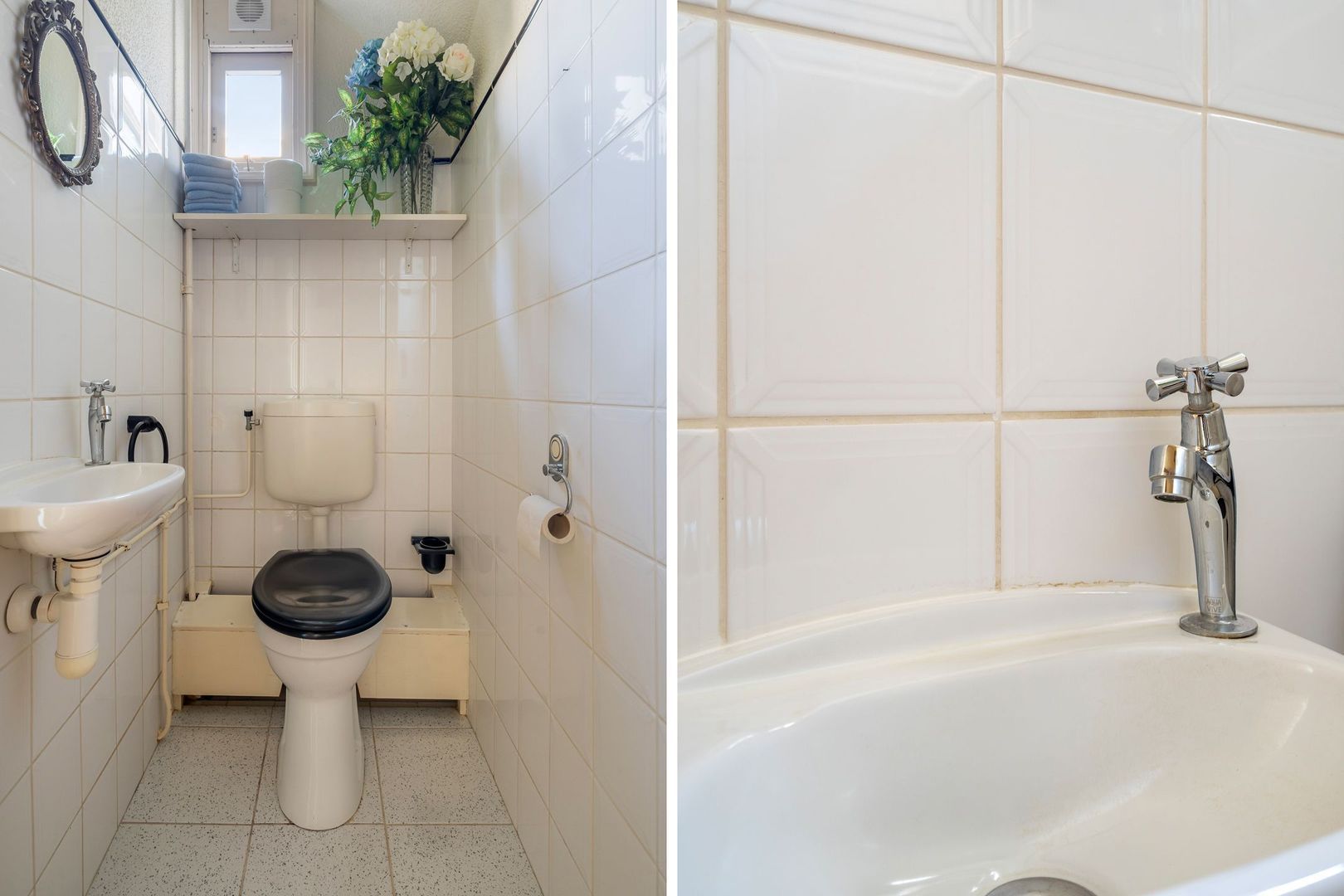 Ruime overloop met raam, vervolgens de tweede badkamer, bestaande uit douche, wastafelmeubel, systeemplafond, aansluiting voor wasmachine en een combinatie van wit en blauw tegelwerk. Daarna een toilet in witte uitvoering met fonteintje. Woonkamer met open keuken van in totaal 36 m². De Ikea-hoekkeuken is voorzien van de volgende apparatuur: vaatwasser, oven, 4-pits gaskookplaat, afzuigkap en koel-vriescombinatie. De woonkamer is lekker licht door de grote ramen en het zijraam. Op de vloer ligt een marmoleumvloer met eikenmotief. Openslaande deuren naar het achterterras van ca. 9 m² met westenligging en aan de voorzijde ook openslaande deuren naar het voorbalkon met vrij uitzicht over het plein en de singel. Voorslaapkamer van ruim 6 m² voorzien van het enige raam met enkel glas in de woning. Trapopgang naar de tweede verdieping.