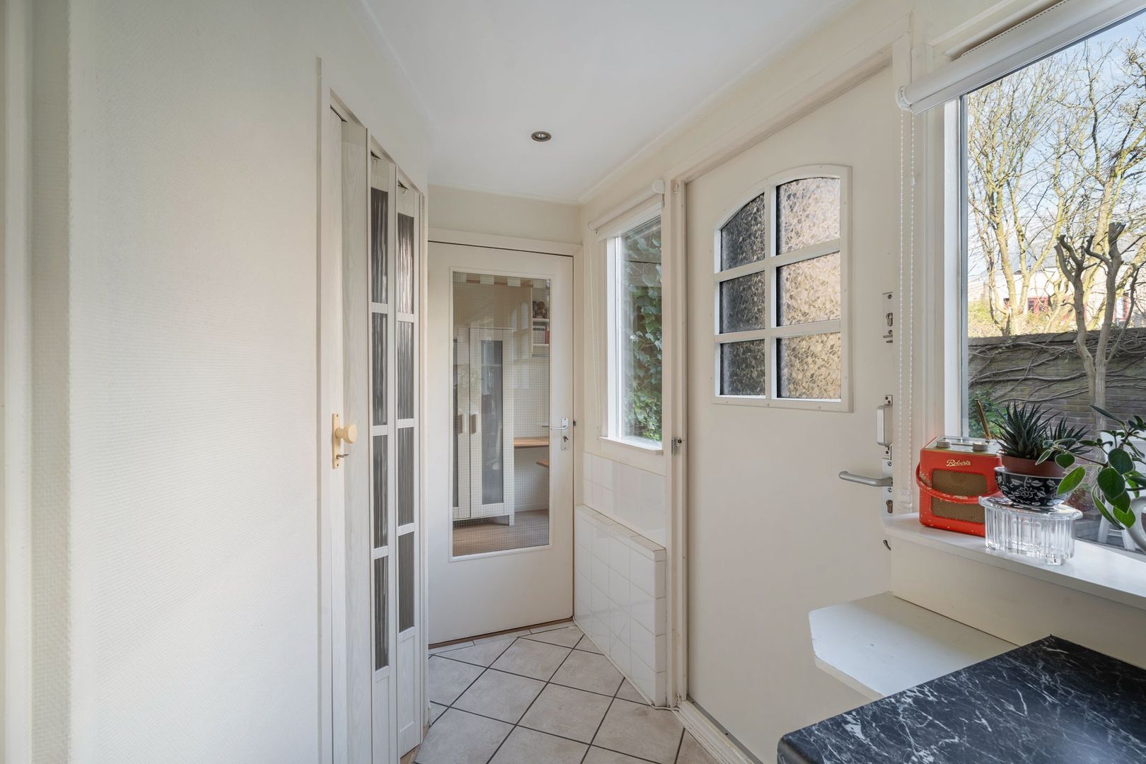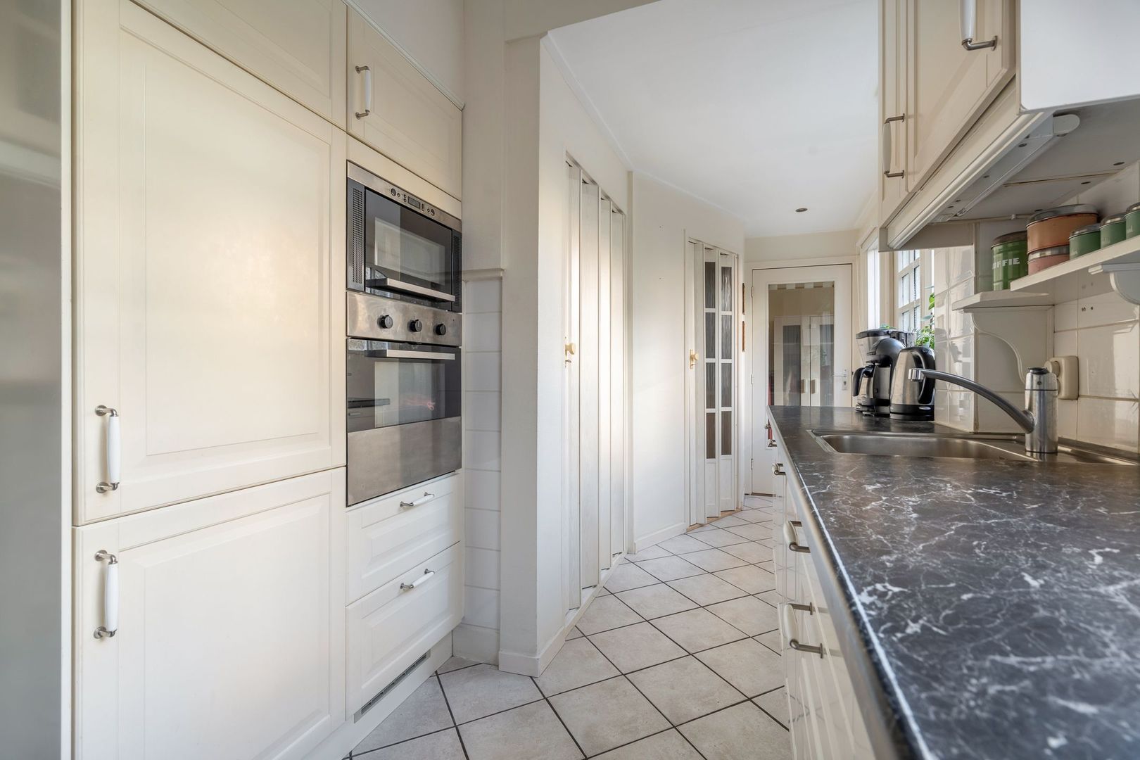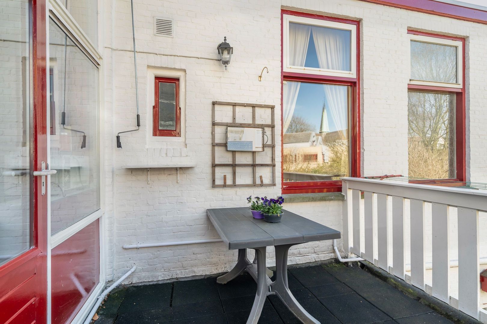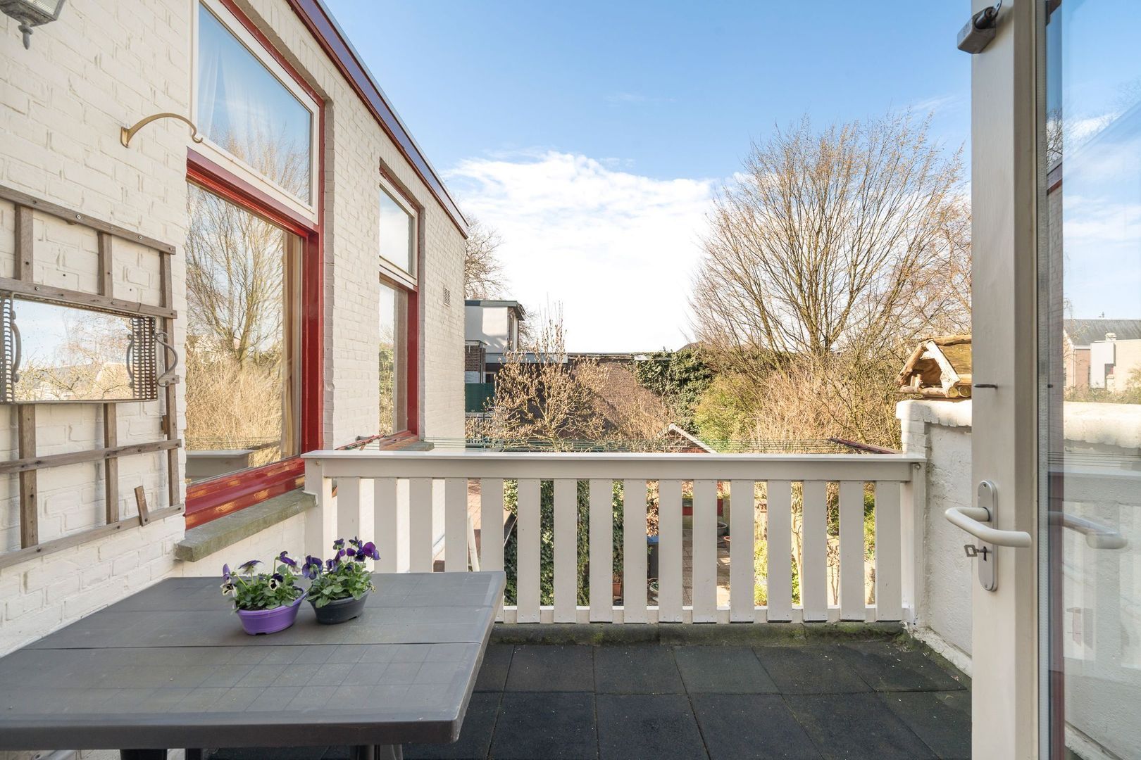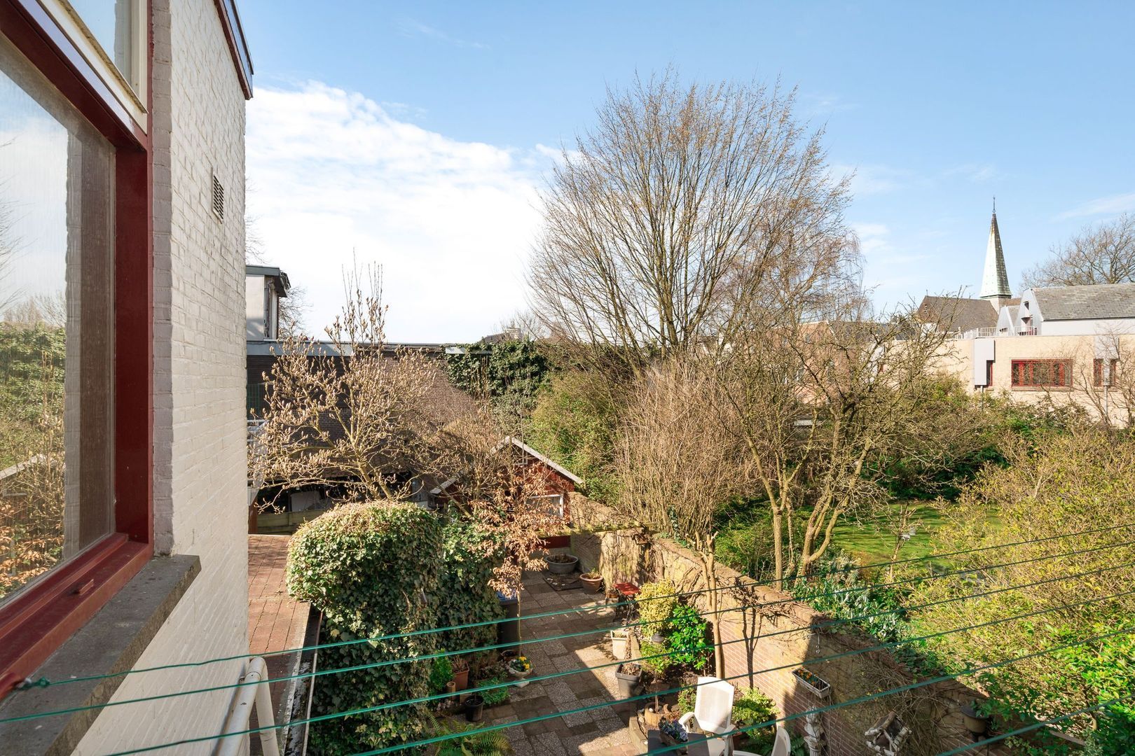 Ruime overloop met raam, vervolgens de tweede badkamer, bestaande uit douche, wastafelmeubel, systeemplafond, aansluiting voor wasmachine en een combinatie van wit en blauw tegelwerk. Daarna een toilet in witte uitvoering met fonteintje. Woonkamer met open keuken van in totaal 36 m². De Ikea-hoekkeuken is voorzien van de volgende apparatuur: vaatwasser, oven, 4-pits gaskookplaat, afzuigkap en koel-vriescombinatie. De woonkamer is lekker licht door de grote ramen en het zijraam. Op de vloer ligt een marmoleumvloer met eikenmotief. Openslaande deuren naar het achterterras van ca. 9 m² met westenligging en aan de voorzijde ook openslaande deuren naar het voorbalkon met vrij uitzicht over het plein en de singel. Voorslaapkamer van ruim 6 m² voorzien van het enige raam met enkel glas in de woning. Trapopgang naar de tweede verdieping.