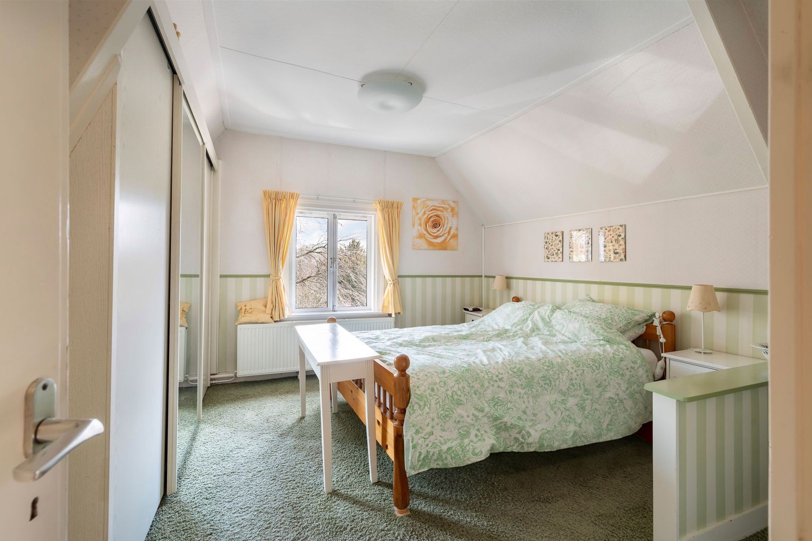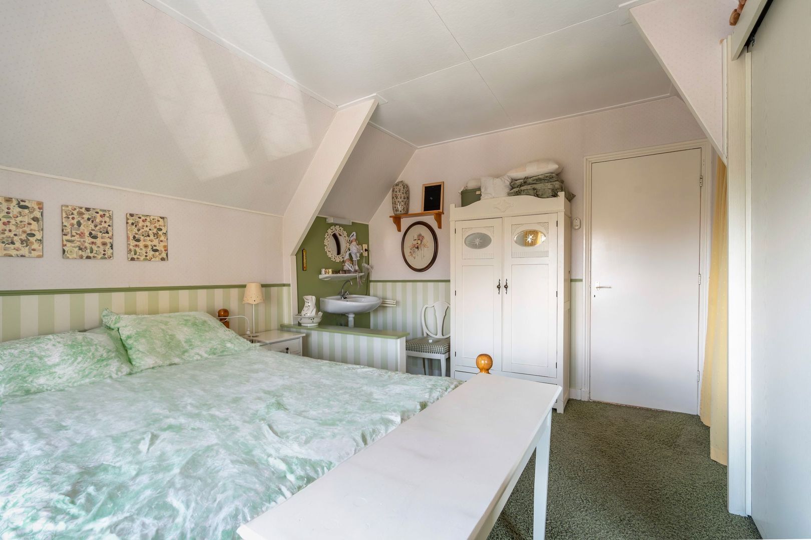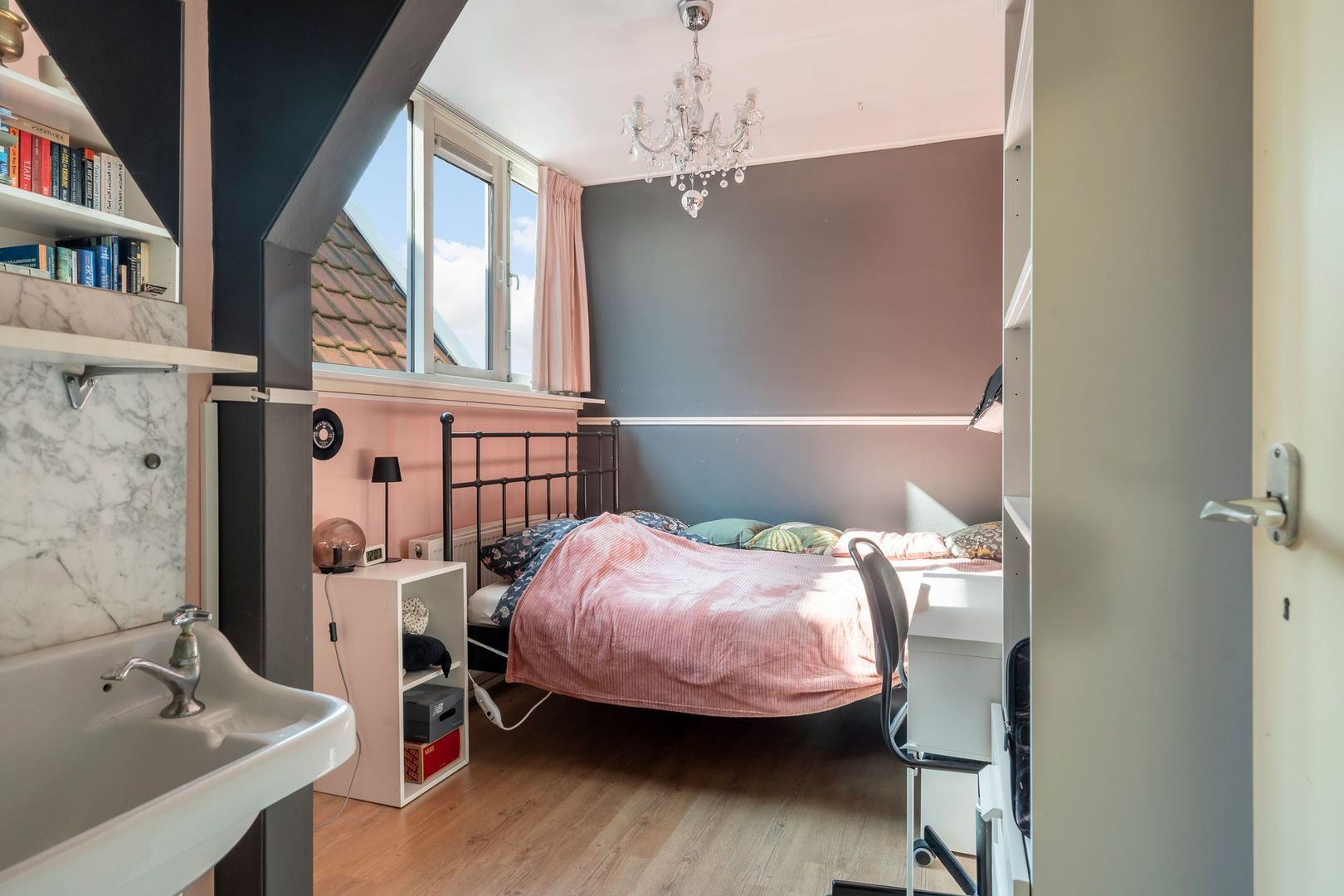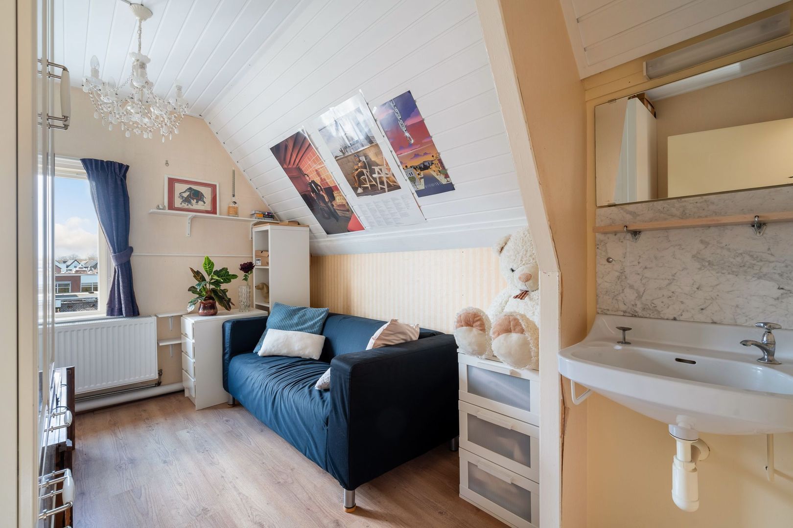 Overloop met dakraam en bergruimte, voorslaapkamer van 16 m² met wastafel, kastenwand en bergruimte in het schuine dakvlak. Aan de tuinzijde bevinden zich 2 slaapkamers, waarvan een van ruim 9 m² voorzien van een wastafel, en een slaapkamer van 9 m² met dakkapel, marmoleumvloerafwerking en ook voorzien van een wastafel.