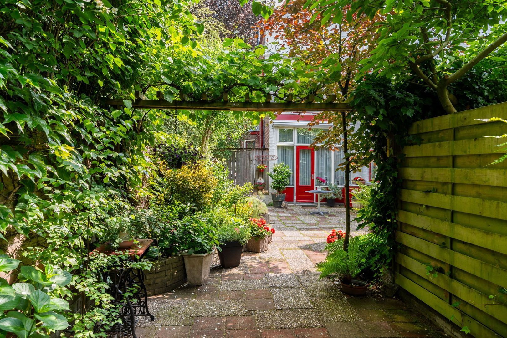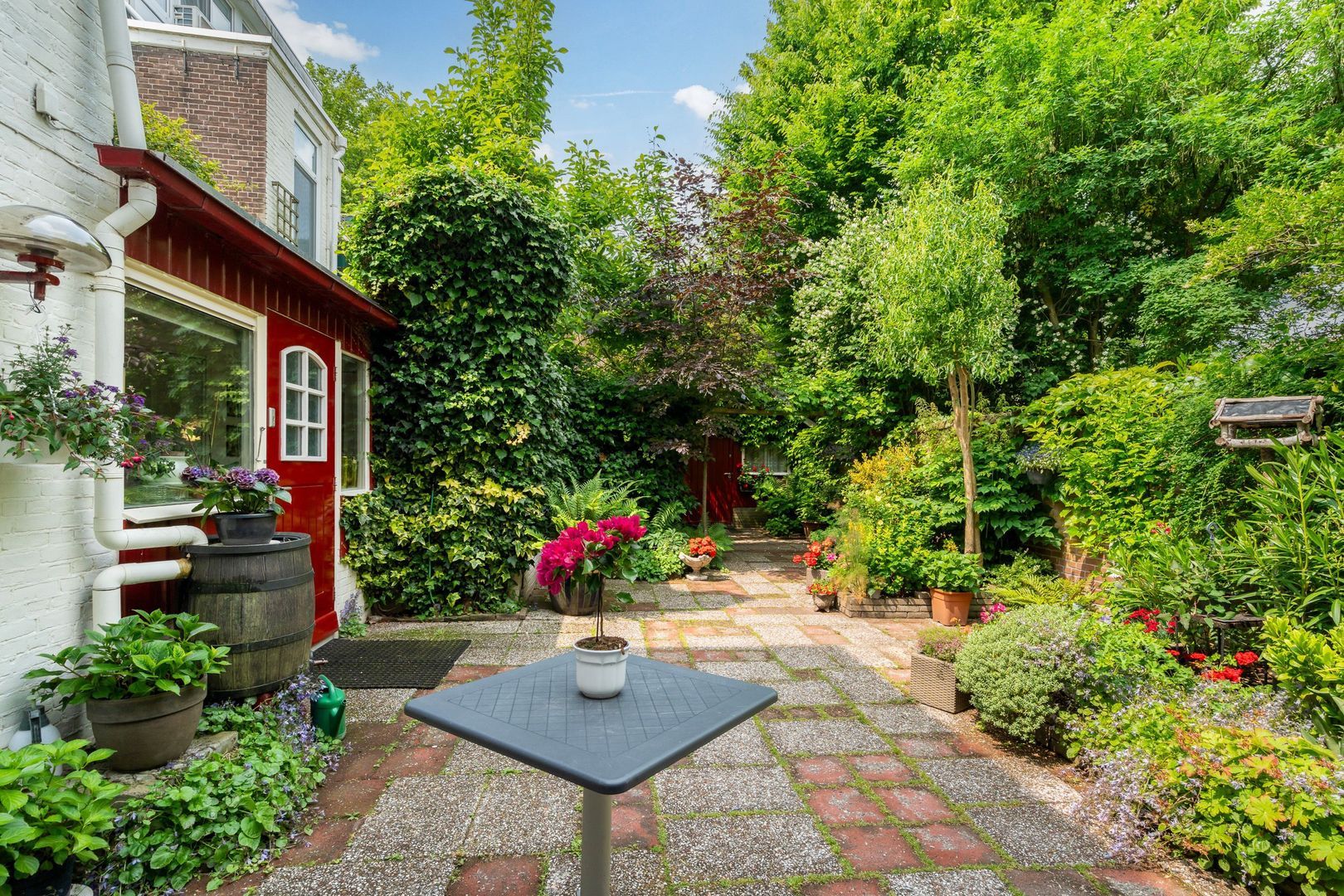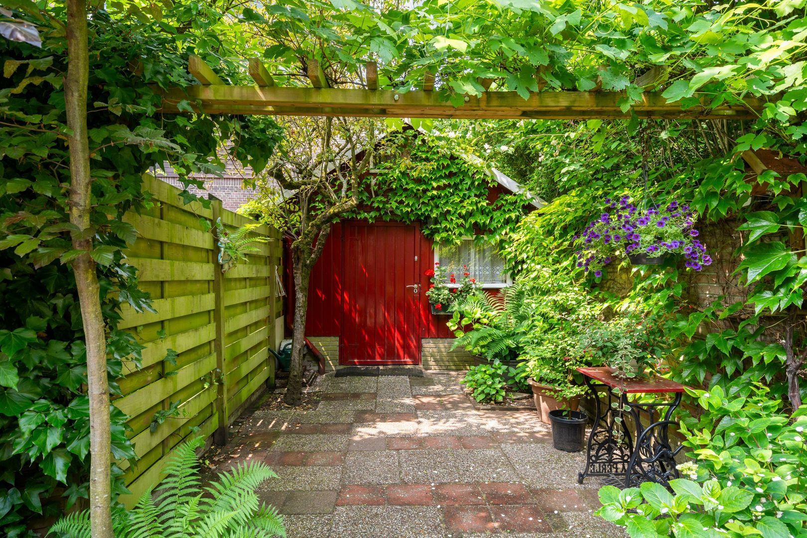 Fraai aangelegde achtertuin op het westen - 15 meter diep en 6,5 meter breed - met de hele dag zon, sierbestrating, blijvend groen, zijtuin met afgesloten poort die doorloopt in de voortuin, voorzien van sierbestrating en mooi stalen hekwerk. De grote schuur van ca. 25 m² is deels van steen en deels van hout, voorzien van een zadeldak met singles gedekt en elektra.