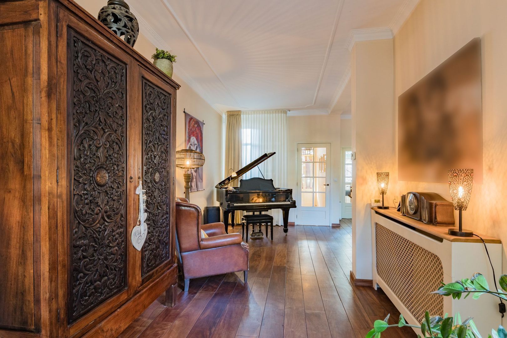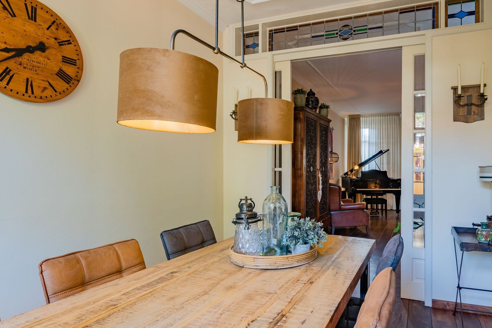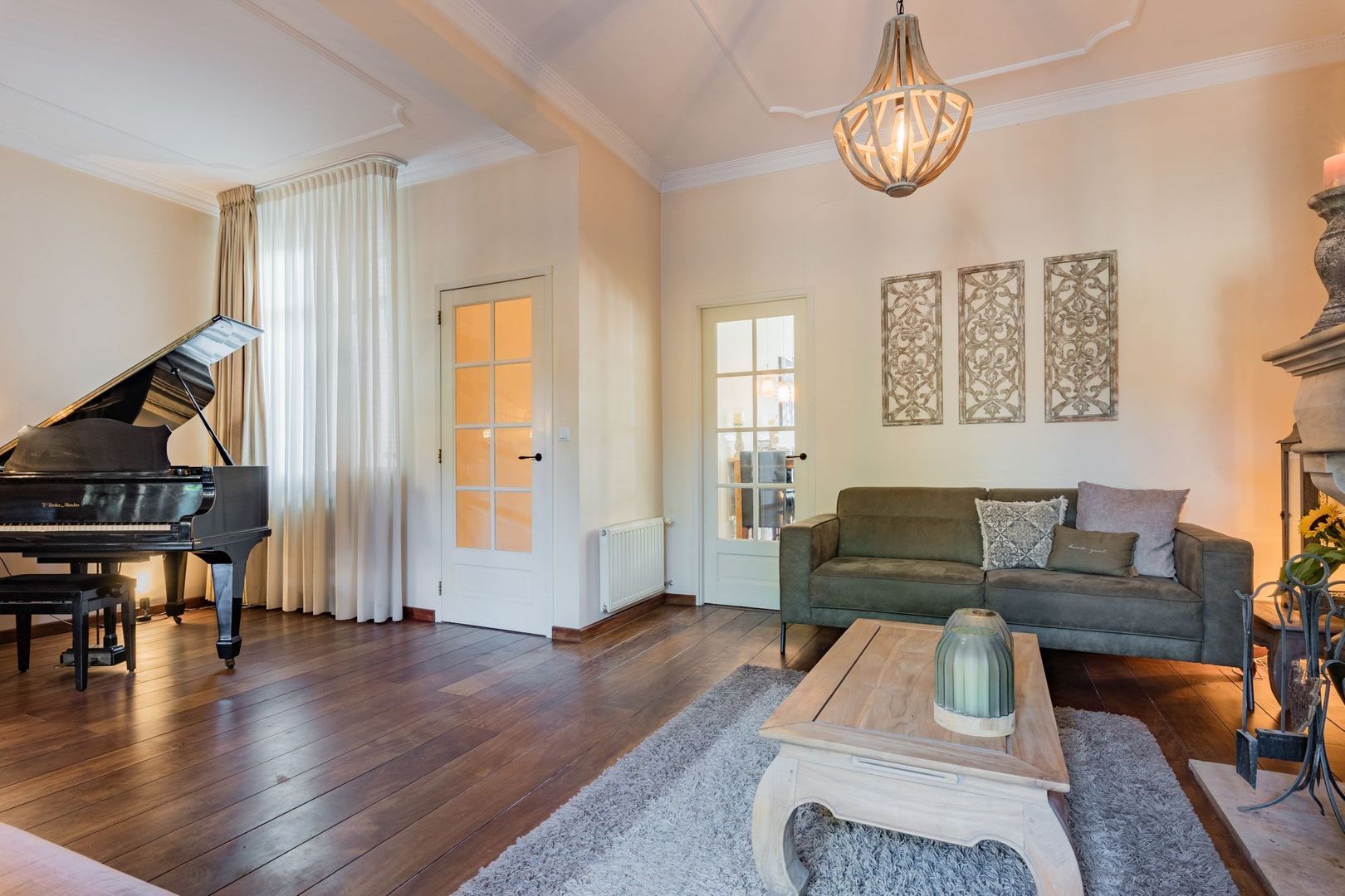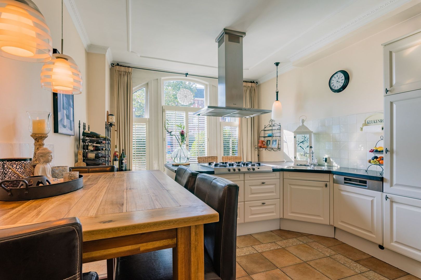 Entree, ruime hal met betegelde vloer, glas in lood en ornamenten plafond, meterkast, verdiepte trapkast, verzorgd toilet, mooie klassieke binnendeuren. Woonkamer van totaal 54 m2 met leuke speelse indeling met kamer-en-suite deuren met glas en lood, mooie massieve hardhouten vloerdelen vloer, kalkzandstenen schouw met openhaard, gestuct ruim 3m hoog plafond met fraaie ornamenten, aansluitend grote woonkeuken van 21 m2 voorzien van plavuizen met ruim opgezette keuken in U-vorm met kookschiereiland, 6 pits gaskookplaat, hardstenen aanrechtblad, rvs afzuigkap, vaatwasser, combi magnetron, apothekerskast en grote koelkast en rondom veel opbergruimte. Aan de voorzijde zijn de kozijnen voorzien van op maat gemaakte shutters. De gehele begane grond in voorzien van een constructieve betonnen (onder)vloer. Aan de zijkant van de woning bevind zich d.m.v. een sierhekwerk afgesloten gezamenlijk buitengebied met eigen overkapping welke als opstelplaats van fietsen gebruikt kan worden.