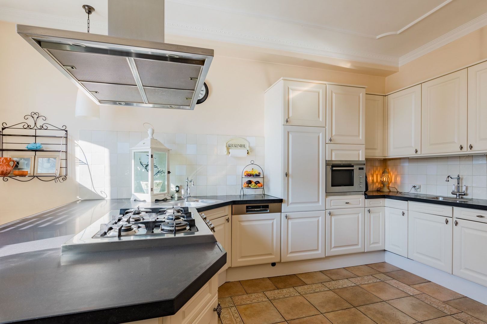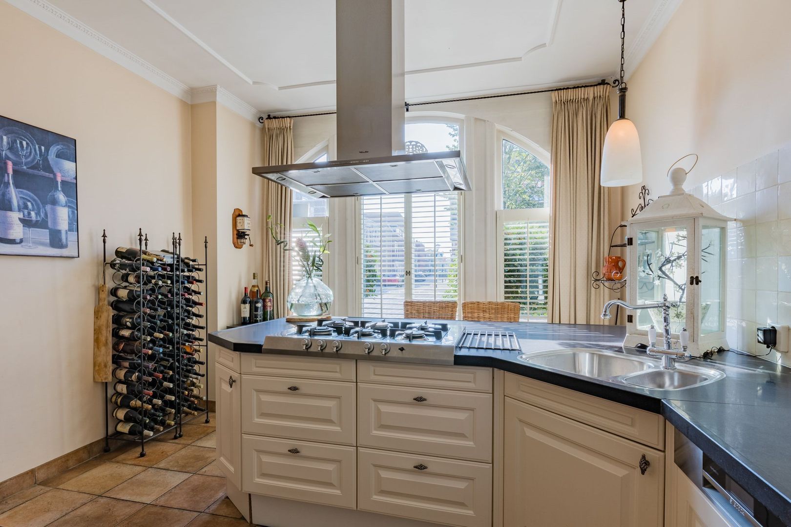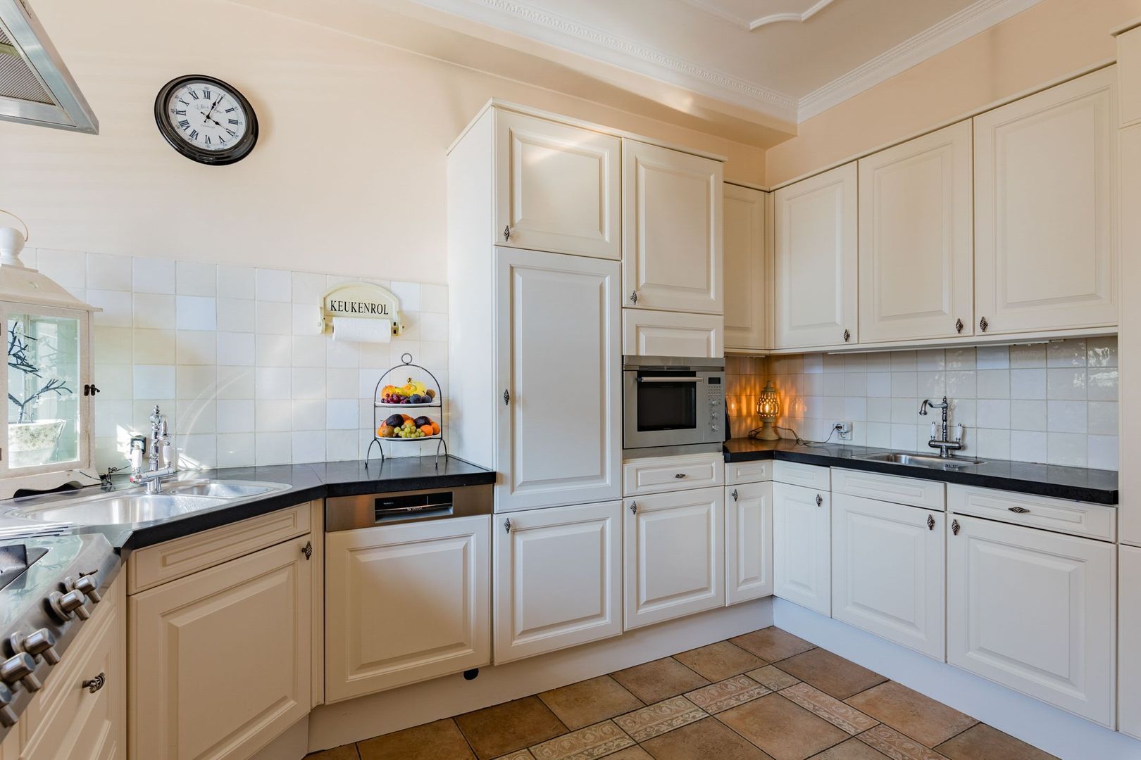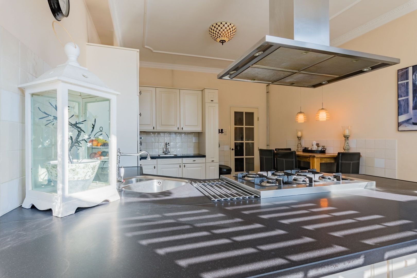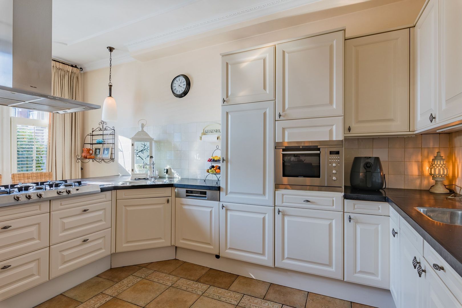 Entree, ruime hal met betegelde vloer, glas in lood en ornamenten plafond, meterkast, verdiepte trapkast, verzorgd toilet, mooie klassieke binnendeuren. Woonkamer van totaal 54 m2 met leuke speelse indeling met kamer-en-suite deuren met glas en lood, mooie massieve hardhouten vloerdelen vloer, kalkzandstenen schouw met openhaard, gestuct ruim 3m hoog plafond met fraaie ornamenten, aansluitend grote woonkeuken van 21 m2 voorzien van plavuizen met ruim opgezette keuken in U-vorm met kookschiereiland, 6 pits gaskookplaat, hardstenen aanrechtblad, rvs afzuigkap, vaatwasser, combi magnetron, apothekerskast en grote koelkast en rondom veel opbergruimte. Aan de voorzijde zijn de kozijnen voorzien van op maat gemaakte shutters. De gehele begane grond in voorzien van een constructieve betonnen (onder)vloer. Aan de zijkant van de woning bevind zich d.m.v. een sierhekwerk afgesloten gezamenlijk buitengebied met eigen overkapping welke als opstelplaats van fietsen gebruikt kan worden.
