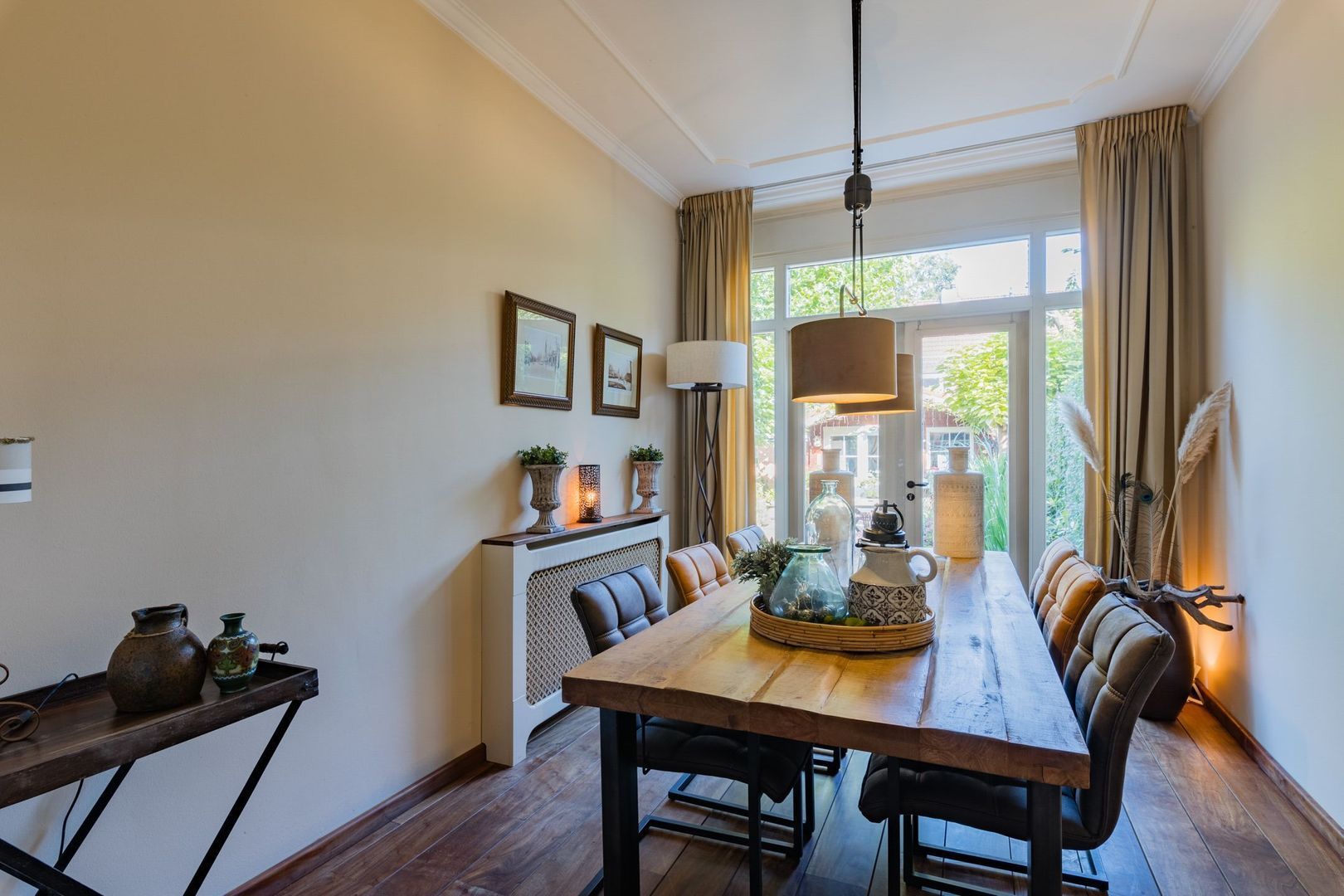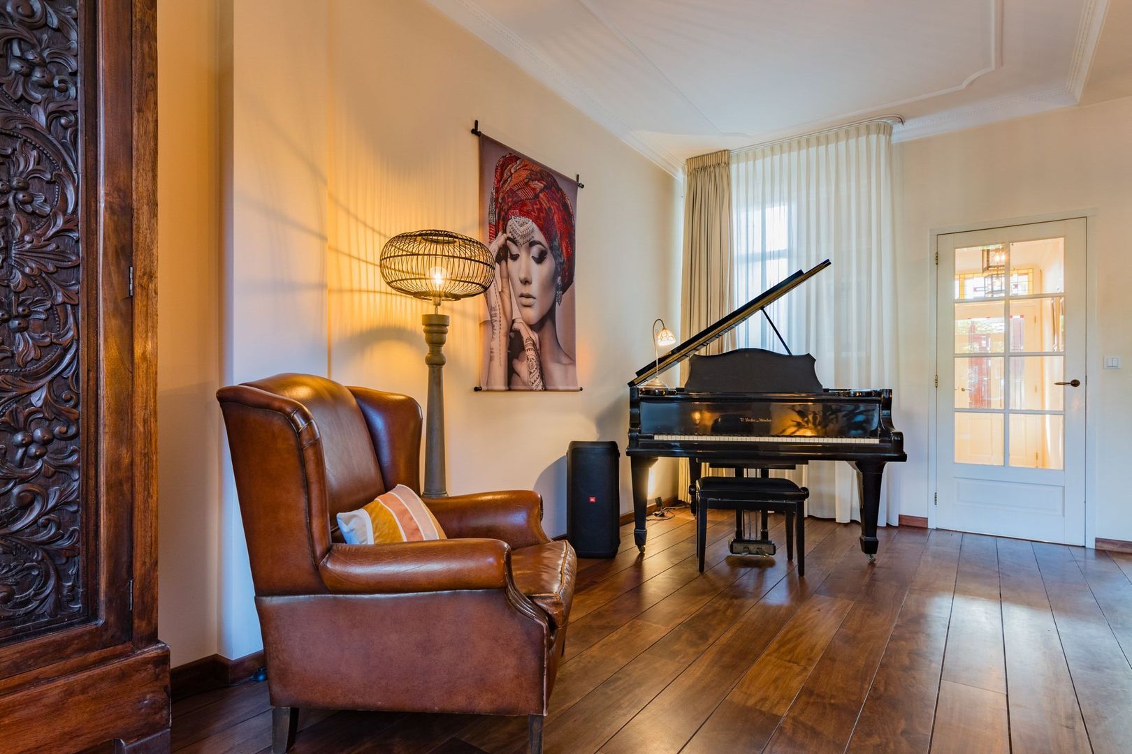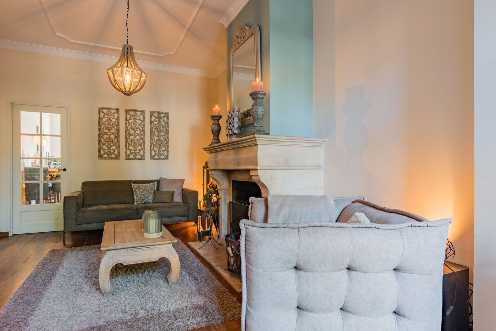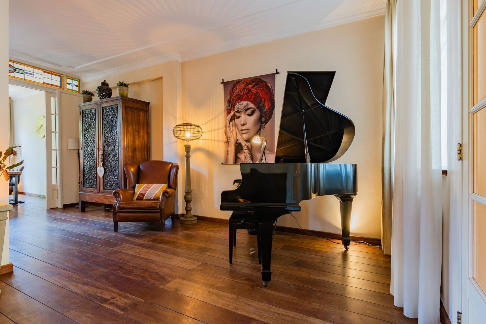 Entree, ruime hal met betegelde vloer, glas in lood en ornamenten plafond, meterkast, verdiepte trapkast, verzorgd toilet, mooie klassieke binnendeuren. Woonkamer van totaal 54 m2 met leuke speelse indeling met kamer-en-suite deuren met glas en lood, mooie massieve hardhouten vloerdelen vloer, kalkzandstenen schouw met openhaard, gestuct ruim 3m hoog plafond met fraaie ornamenten, aansluitend grote woonkeuken van 21 m2 voorzien van plavuizen met ruim opgezette keuken in U-vorm met kookschiereiland, 6 pits gaskookplaat, hardstenen aanrechtblad, rvs afzuigkap, vaatwasser, combi magnetron, apothekerskast en grote koelkast en rondom veel opbergruimte. Aan de voorzijde zijn de kozijnen voorzien van op maat gemaakte shutters. De gehele begane grond in voorzien van een constructieve betonnen (onder)vloer. Aan de zijkant van de woning bevind zich d.m.v. een sierhekwerk afgesloten gezamenlijk buitengebied met eigen overkapping welke als opstelplaats van fietsen gebruikt kan worden.