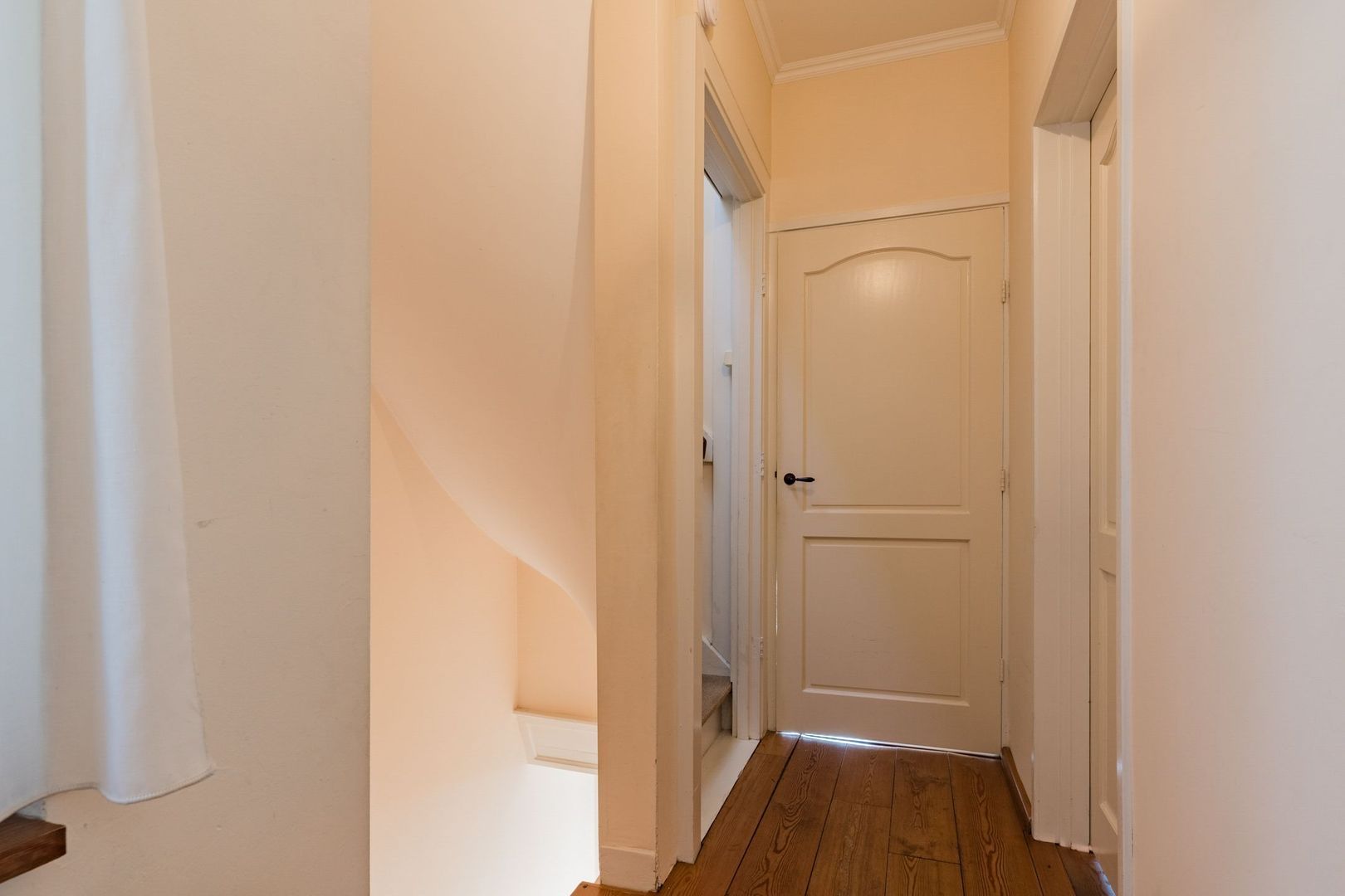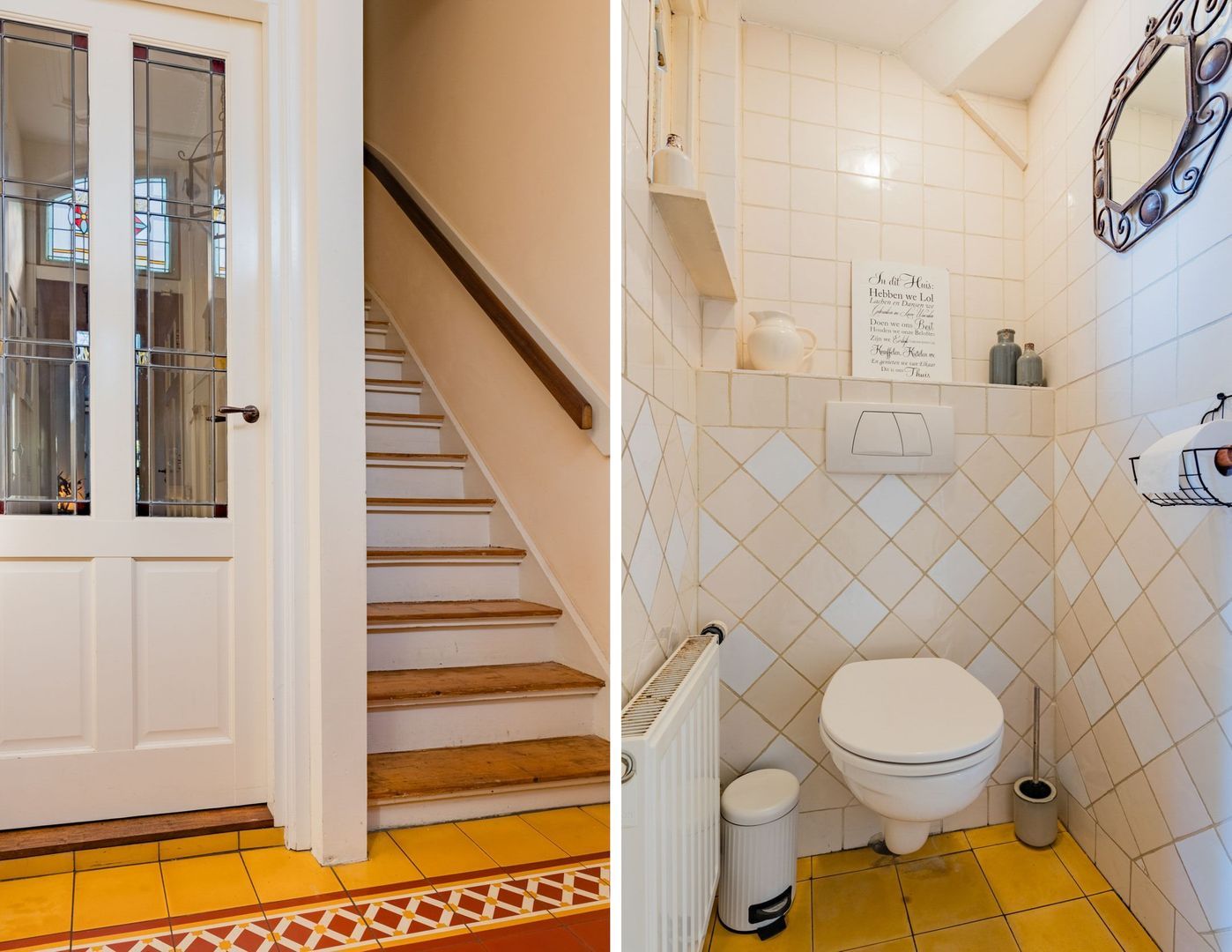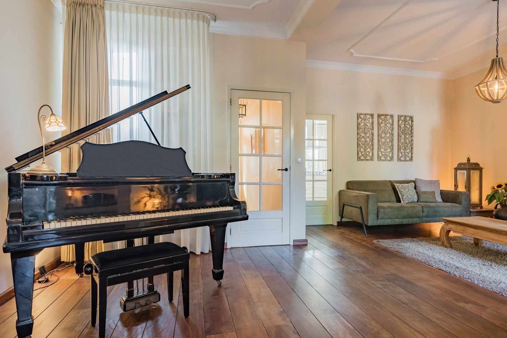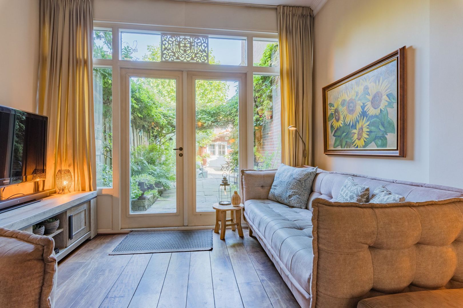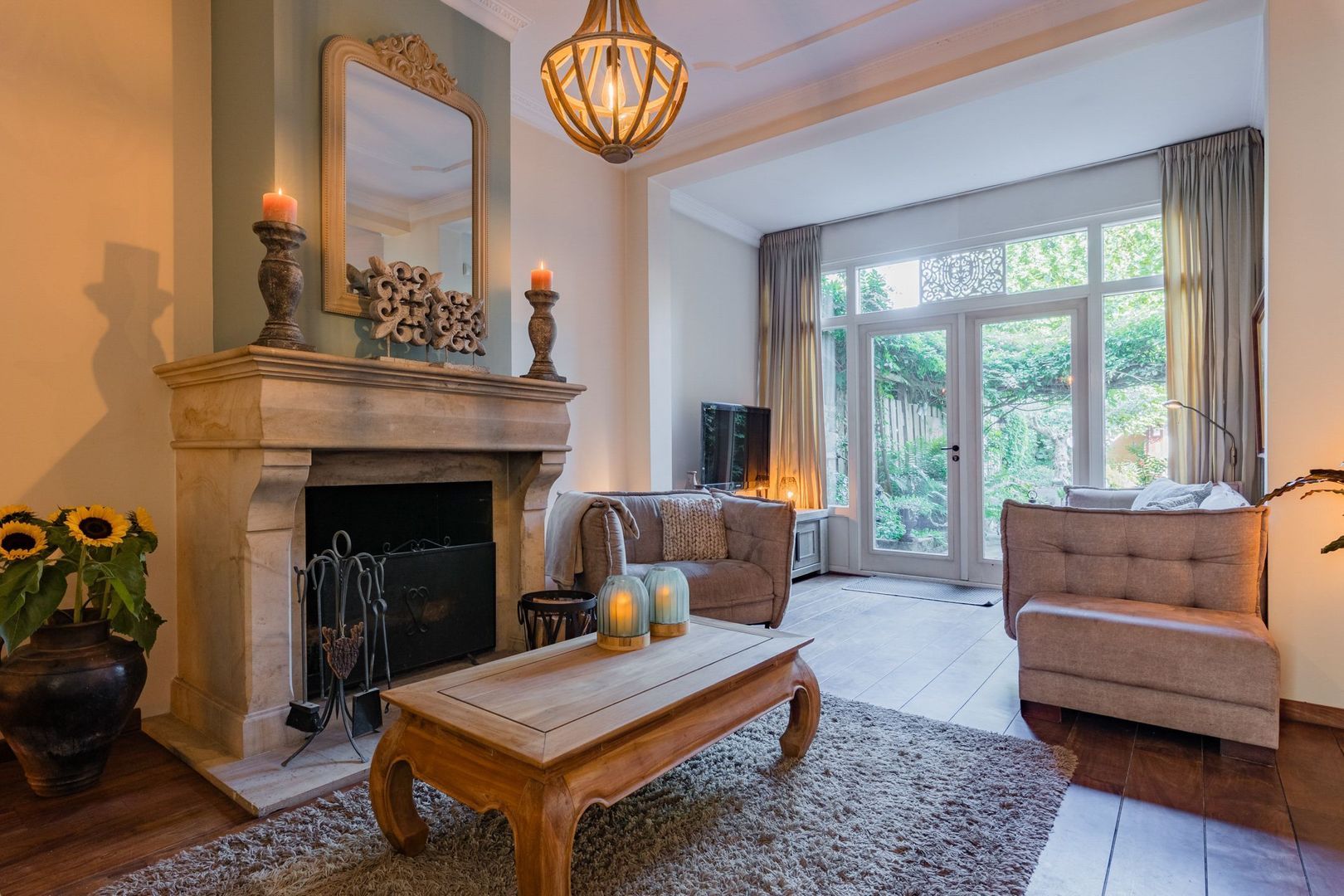 Entree, ruime hal met betegelde vloer, glas in lood en ornamenten plafond, meterkast, verdiepte trapkast, verzorgd toilet, mooie klassieke binnendeuren. Woonkamer van totaal 54 m2 met leuke speelse indeling met kamer-en-suite deuren met glas en lood, mooie massieve hardhouten vloerdelen vloer, kalkzandstenen schouw met openhaard, gestuct ruim 3m hoog plafond met fraaie ornamenten, aansluitend grote woonkeuken van 21 m2 voorzien van plavuizen met ruim opgezette keuken in U-vorm met kookschiereiland, 6 pits gaskookplaat, hardstenen aanrechtblad, rvs afzuigkap, vaatwasser, combi magnetron, apothekerskast en grote koelkast en rondom veel opbergruimte. Aan de voorzijde zijn de kozijnen voorzien van op maat gemaakte shutters. De gehele begane grond in voorzien van een constructieve betonnen (onder)vloer. Aan de zijkant van de woning bevind zich d.m.v. een sierhekwerk afgesloten gezamenlijk buitengebied met eigen overkapping welke als opstelplaats van fietsen gebruikt kan worden.
