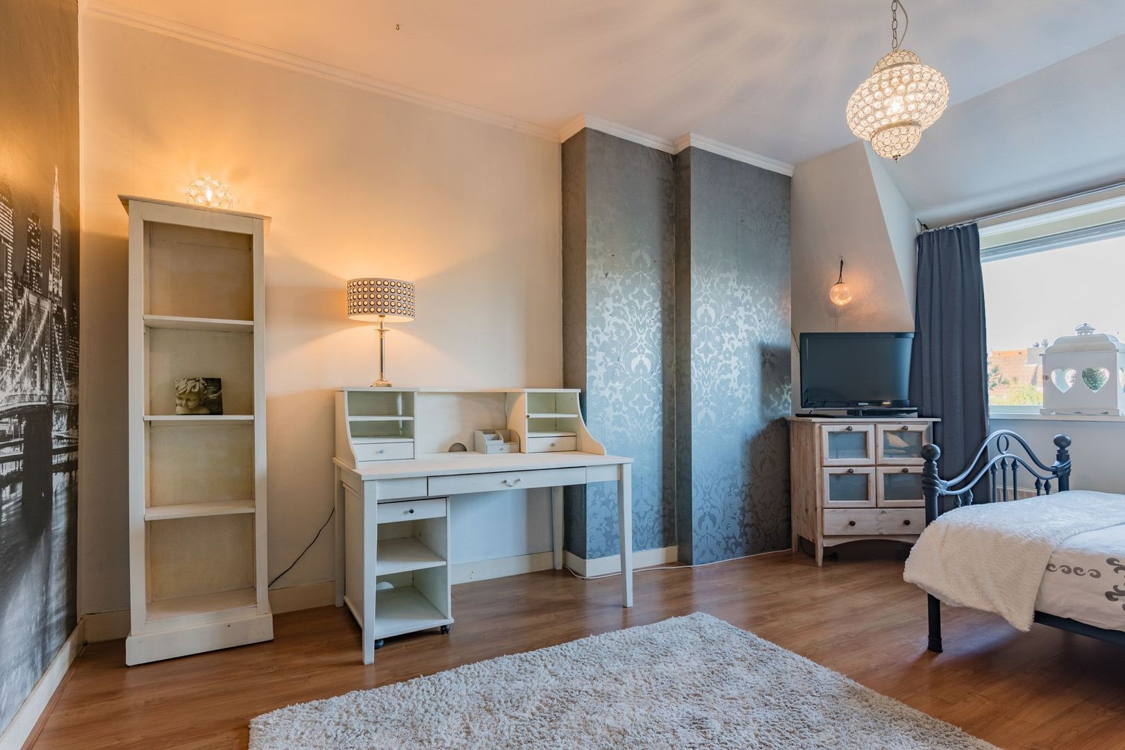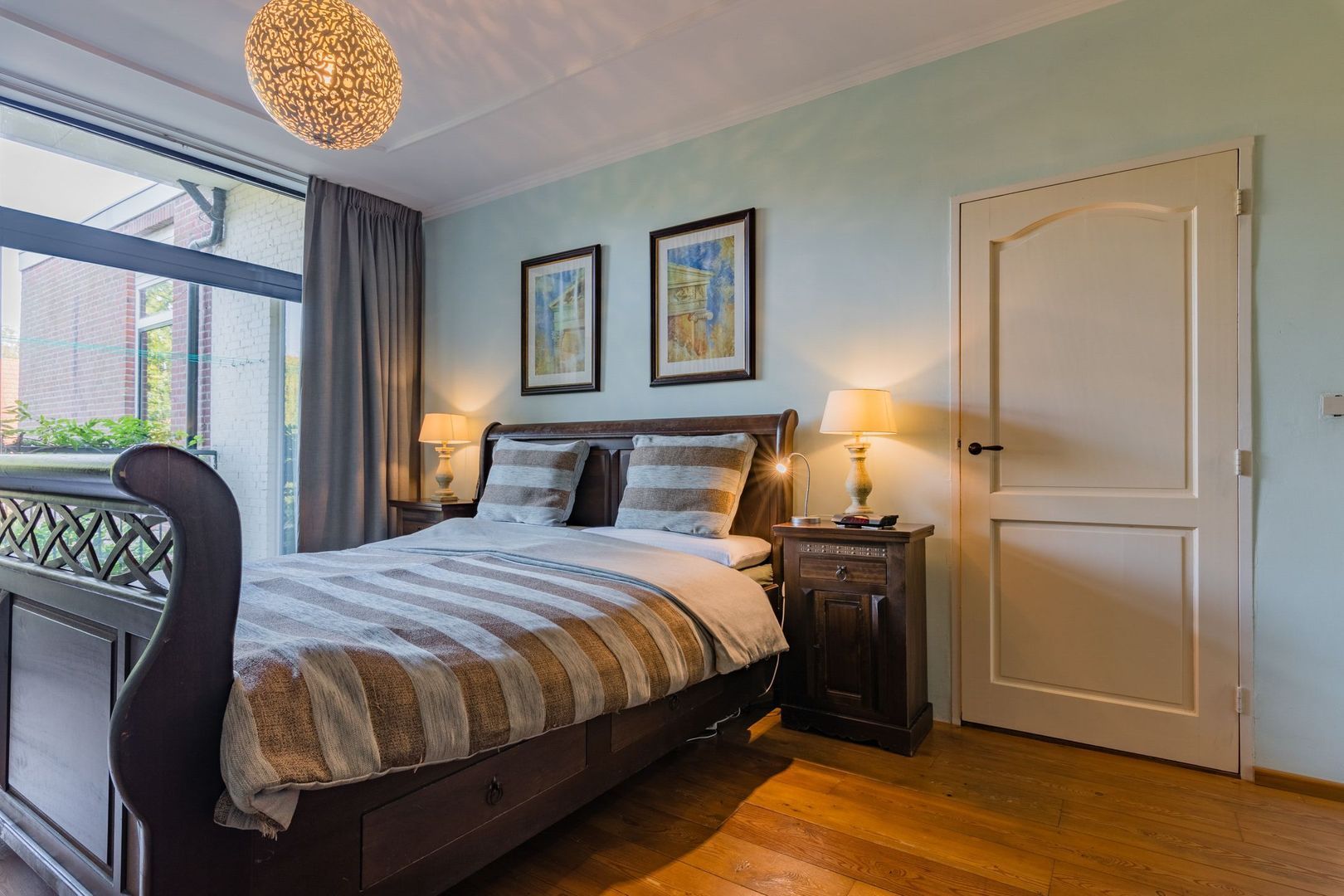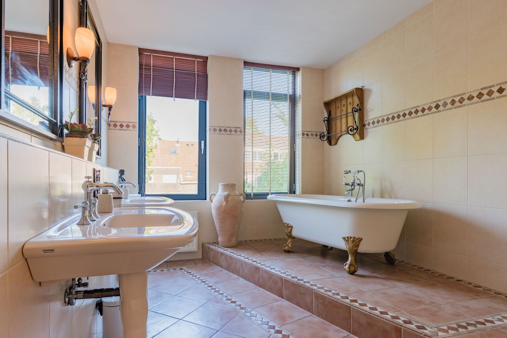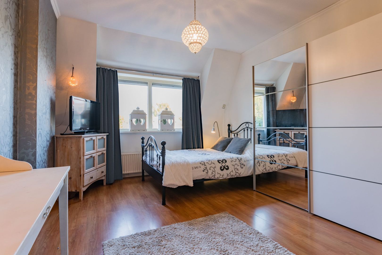 Mooie trap opgang, ruime overloop met grenen vloerdelen, voorzijde (inloop)kastenkamer tot aan plafond van 6 m2 met houten vloerdelen, voorzijde slaap-werkkamer met fraai uitzicht van 14 m2 met laminaatvloer en lambrisering, toegang naar besloten balkon van bijna 4 m2 voorzien van een gietvloer, authentiek sierhekwerk , markies en aluminium schuifpui. Aan de achterzijde de hoofdslaapkamer van 20 m2, met gestuct plafond, aluminium schuifpui naar inpandig balkon van 7 m2 met gietvloer en mooi uitzicht over de tuin. Technische-, werkruimte van 6 m2 met aansluiting wasmachine, laminaat, cv opstelling en veel bergruimte, overloop met kastruimte en aansluitend in achterste deel de zeer royale badkamer van 15 m2 met veel licht door de 3 ramen, vrijstaand ligbad “op pootjes”, dubbele wastafel, royale douchecabine, terracotta tegelwerk en hangend toilet.