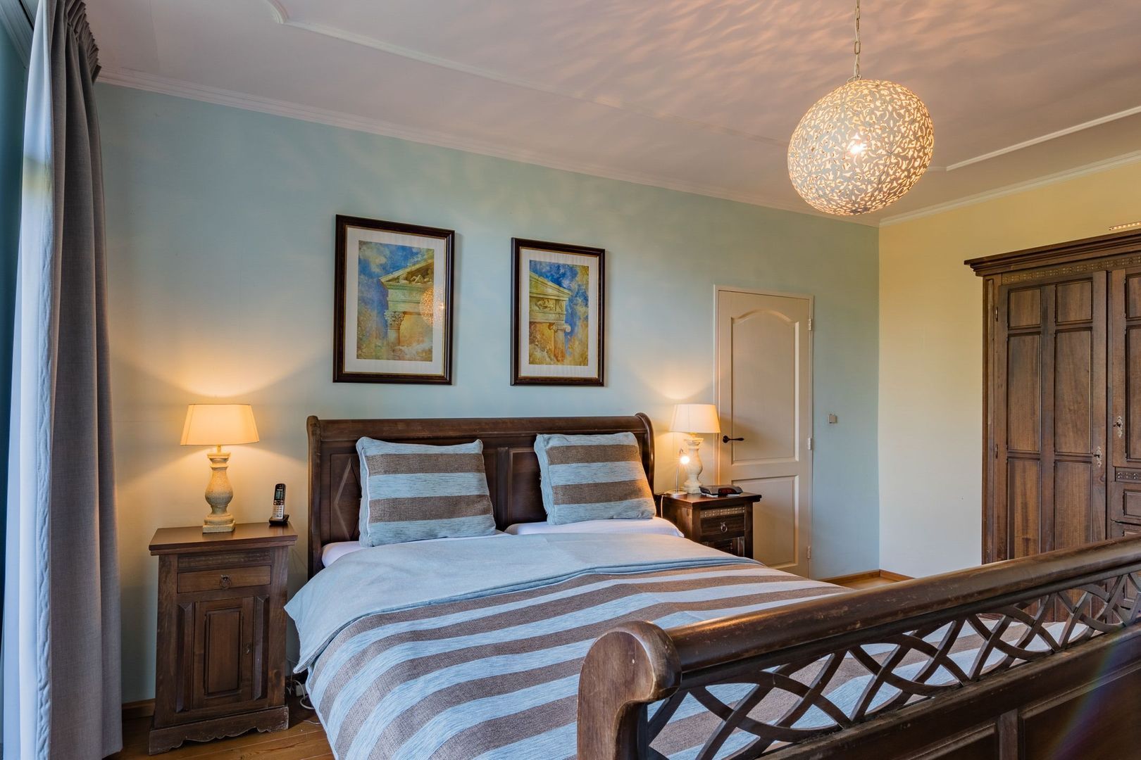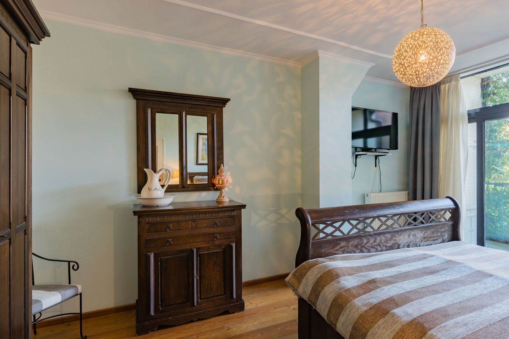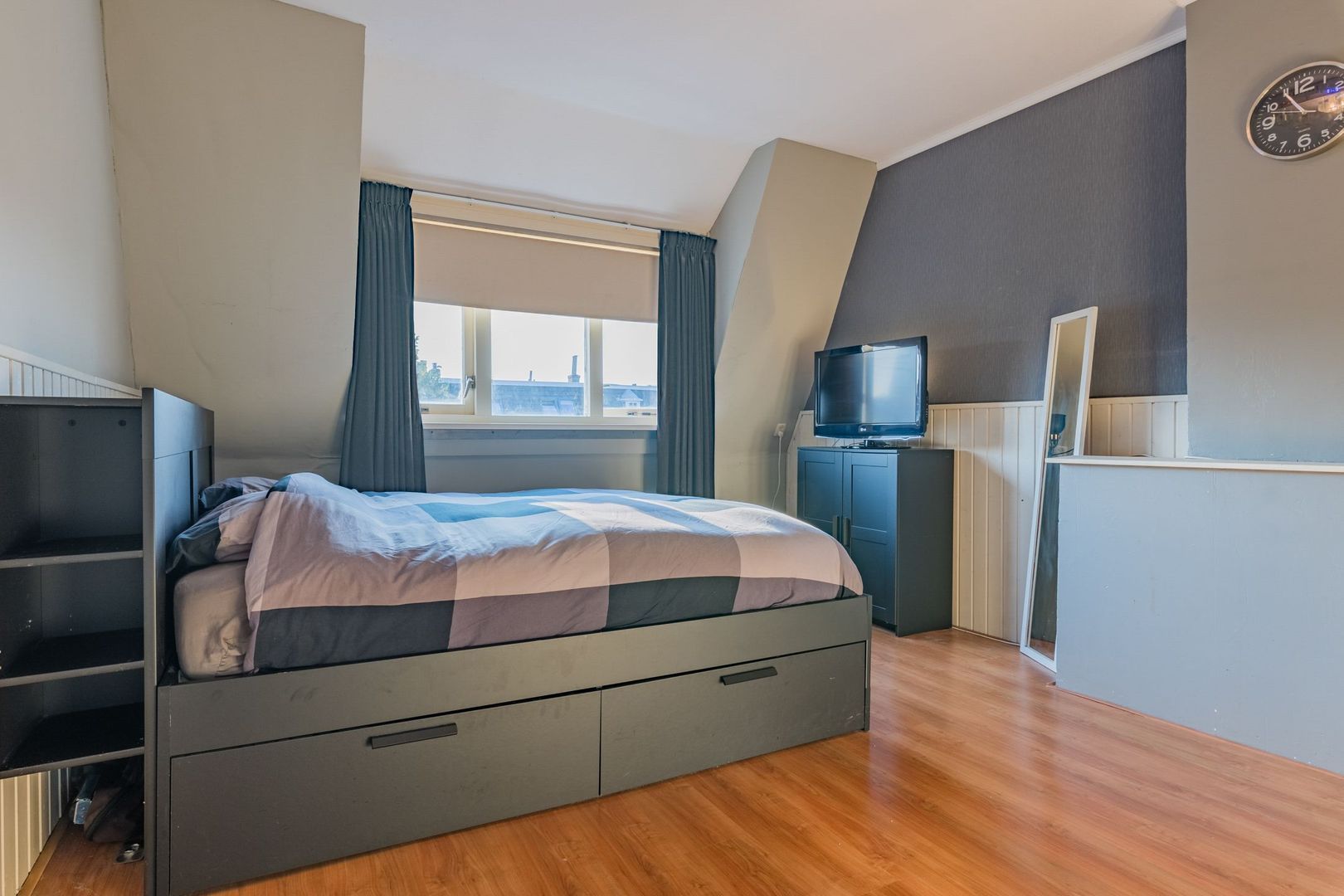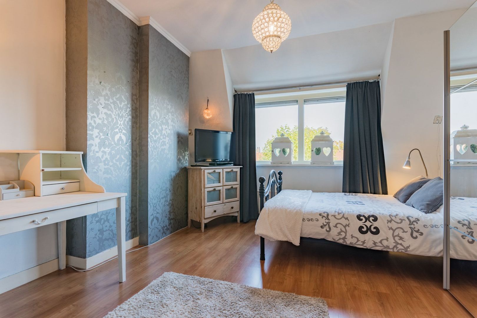 Mooie trap opgang, ruime overloop met grenen vloerdelen, voorzijde (inloop)kastenkamer tot aan plafond van 6 m2 met houten vloerdelen, voorzijde slaap-werkkamer met fraai uitzicht van 14 m2 met laminaatvloer en lambrisering, toegang naar besloten balkon van bijna 4 m2 voorzien van een gietvloer, authentiek sierhekwerk , markies en aluminium schuifpui. Aan de achterzijde de hoofdslaapkamer van 20 m2, met gestuct plafond, aluminium schuifpui naar inpandig balkon van 7 m2 met gietvloer en mooi uitzicht over de tuin. Technische-, werkruimte van 6 m2 met aansluiting wasmachine, laminaat, cv opstelling en veel bergruimte, overloop met kastruimte en aansluitend in achterste deel de zeer royale badkamer van 15 m2 met veel licht door de 3 ramen, vrijstaand ligbad “op pootjes”, dubbele wastafel, royale douchecabine, terracotta tegelwerk en hangend toilet.