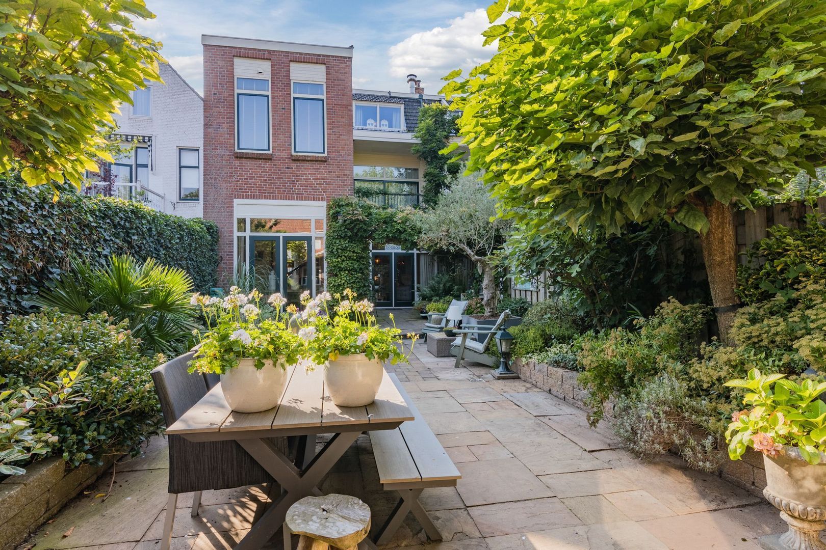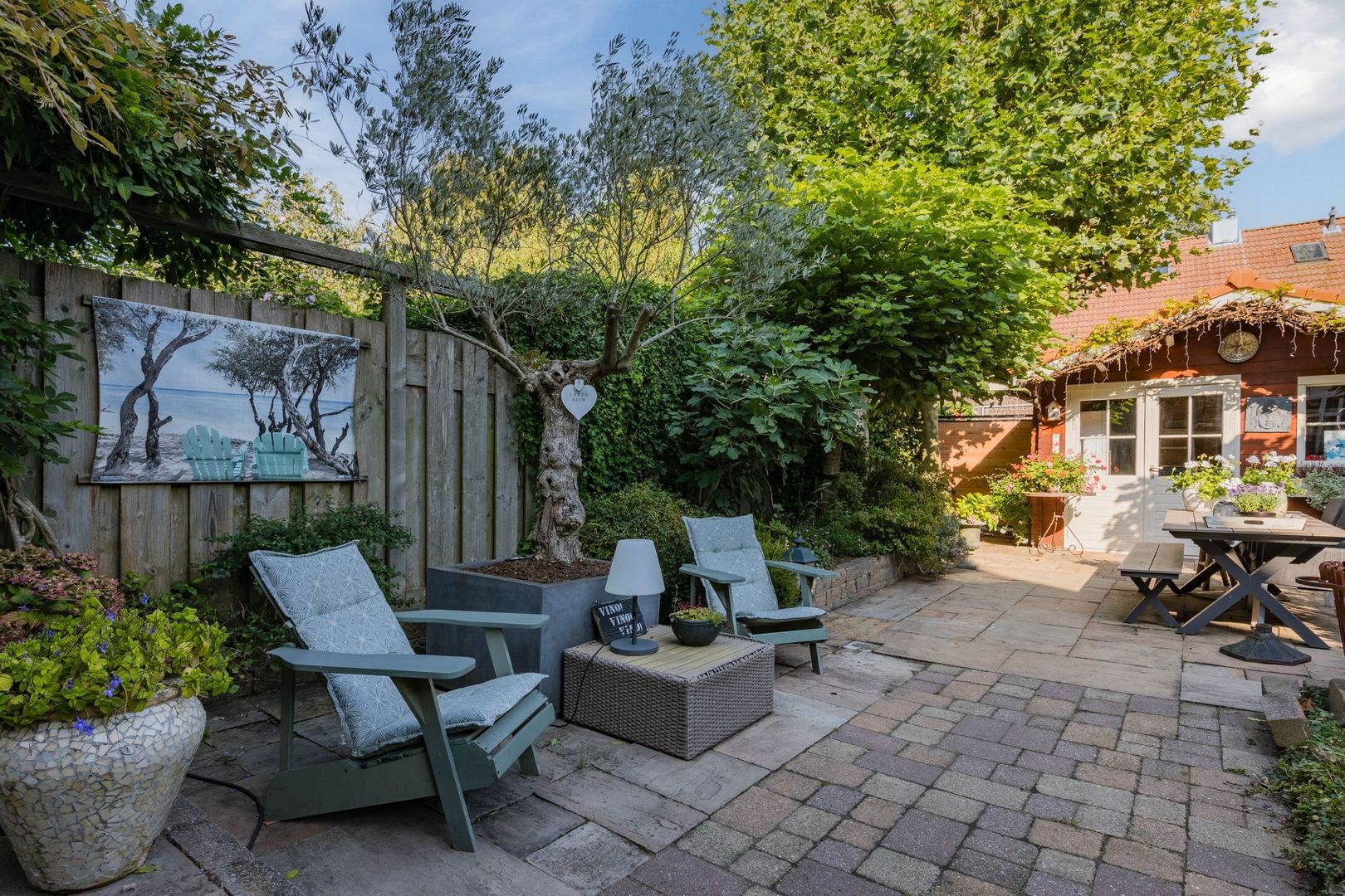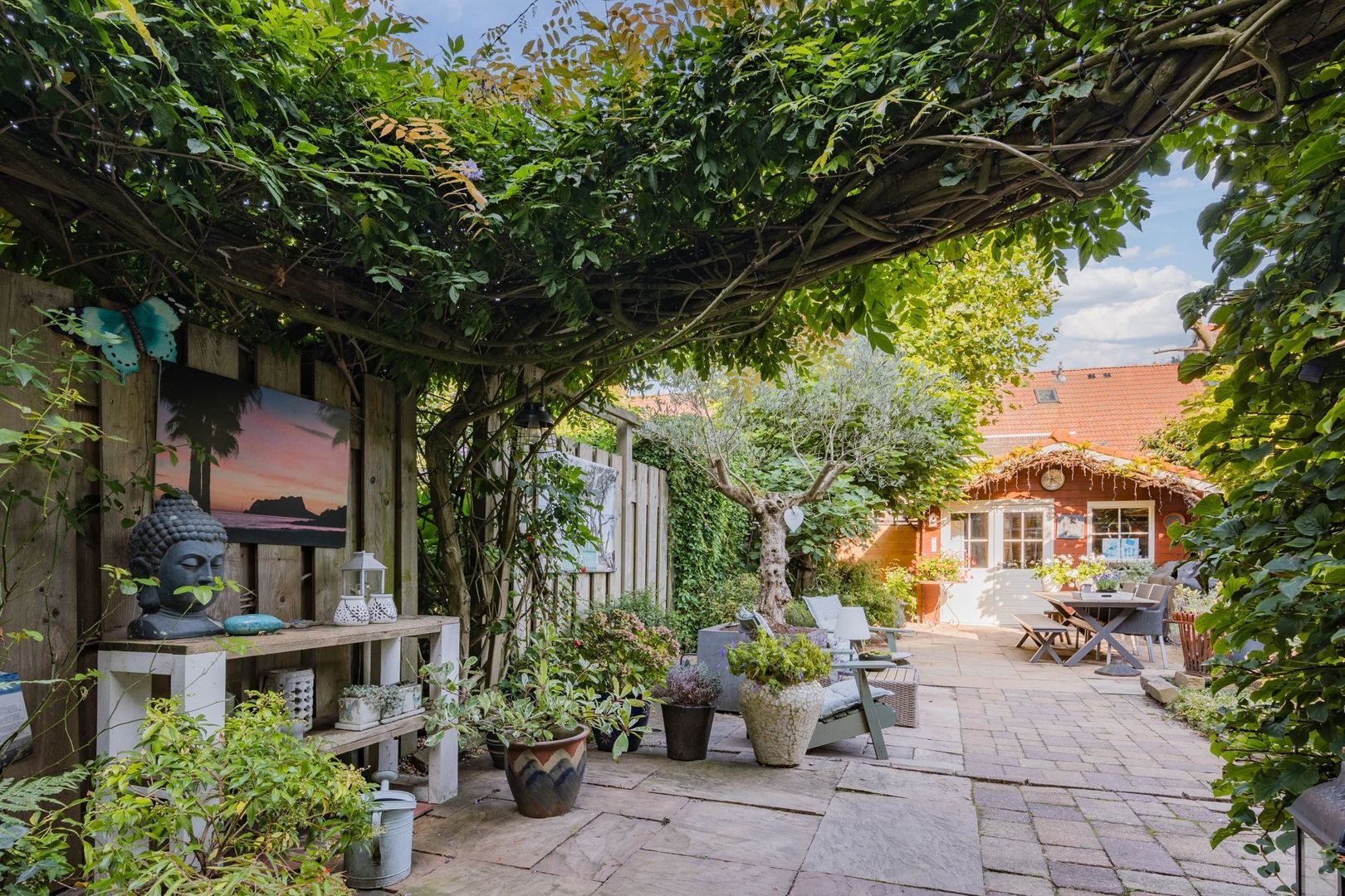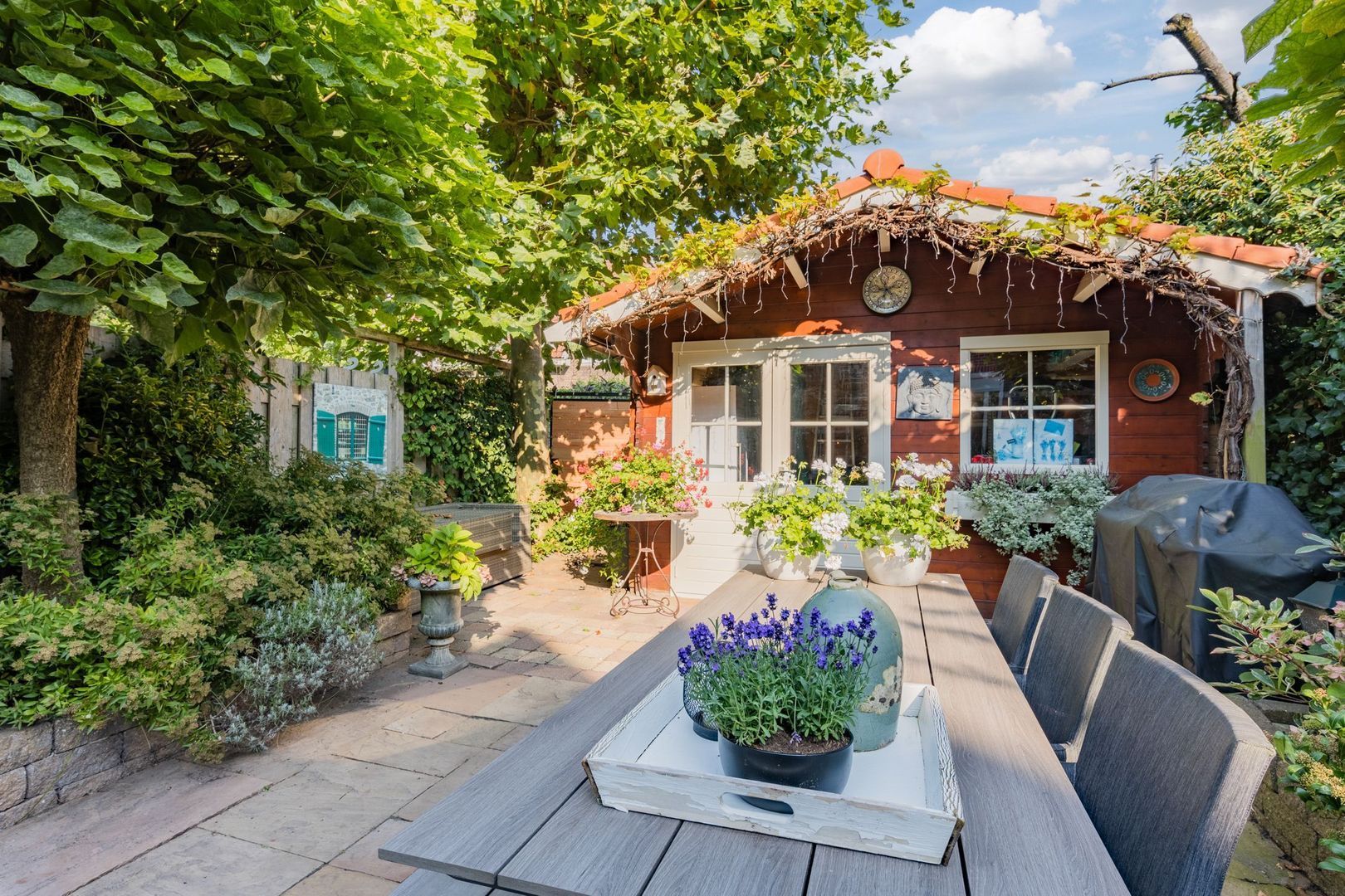 Schitterend aangelegde beschutte achtertuin met mediterrane accenten op het zuidoosten van ca. 20 meter diep en 7 meter breed met heel de dag de zon, natuurstenen tegels, blijvend groen, diverse terrassen en zitjes. Er is buitenverlichting en een buitenkraan aanwezig.