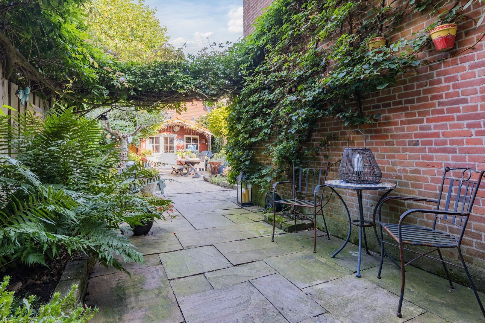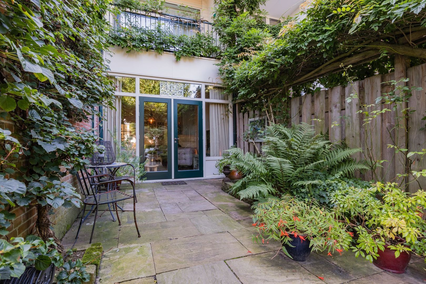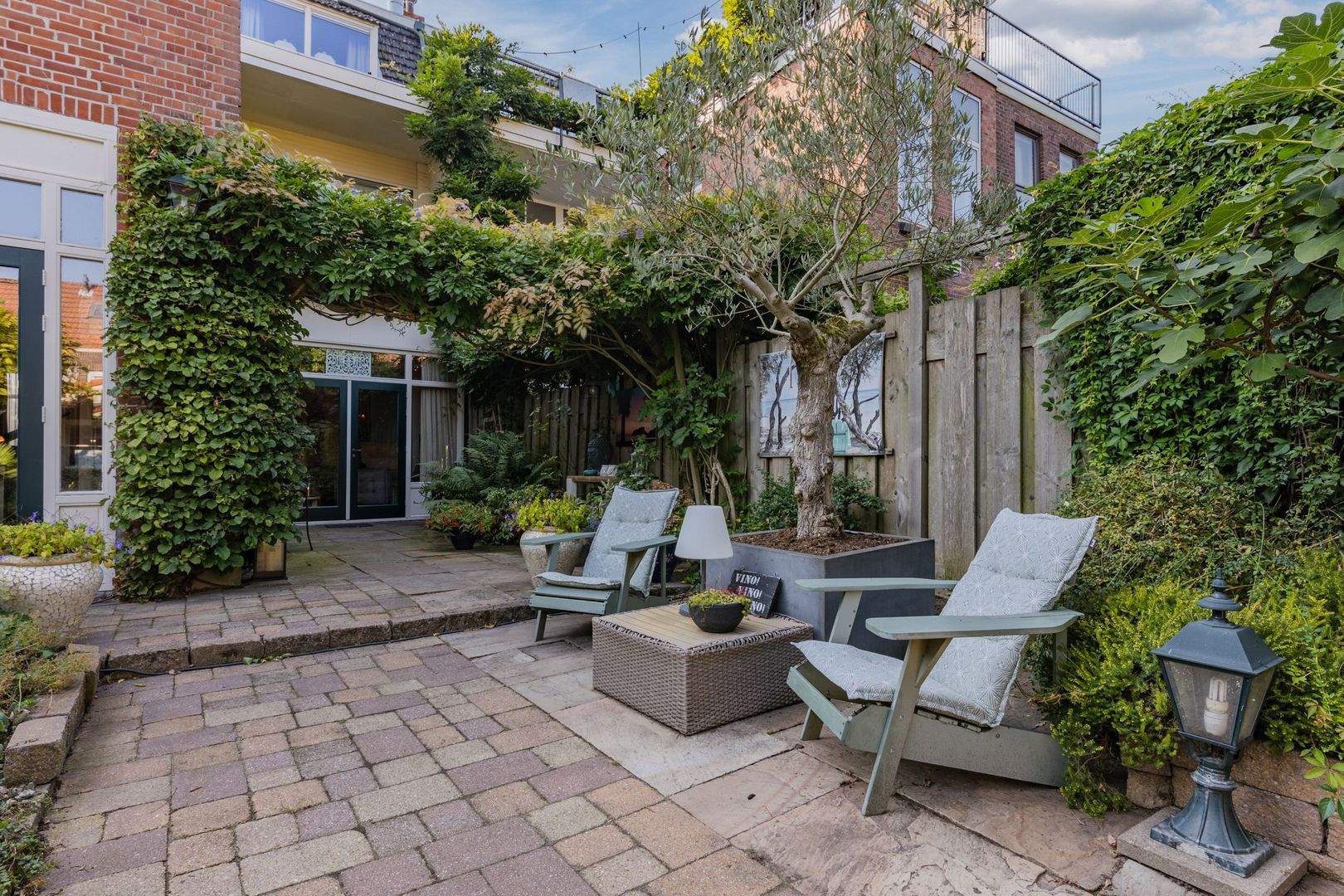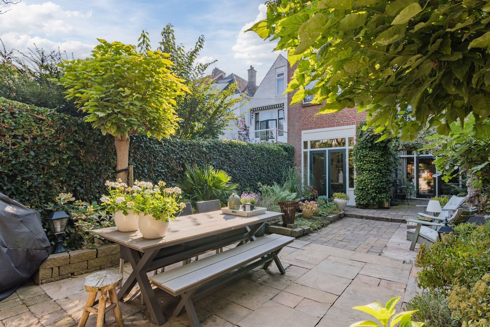 Schitterend aangelegde beschutte achtertuin met mediterrane accenten op het zuidoosten van ca. 20 meter diep en 7 meter breed met heel de dag de zon, natuurstenen tegels, blijvend groen, diverse terrassen en zitjes. Er is buitenverlichting en een buitenkraan aanwezig.