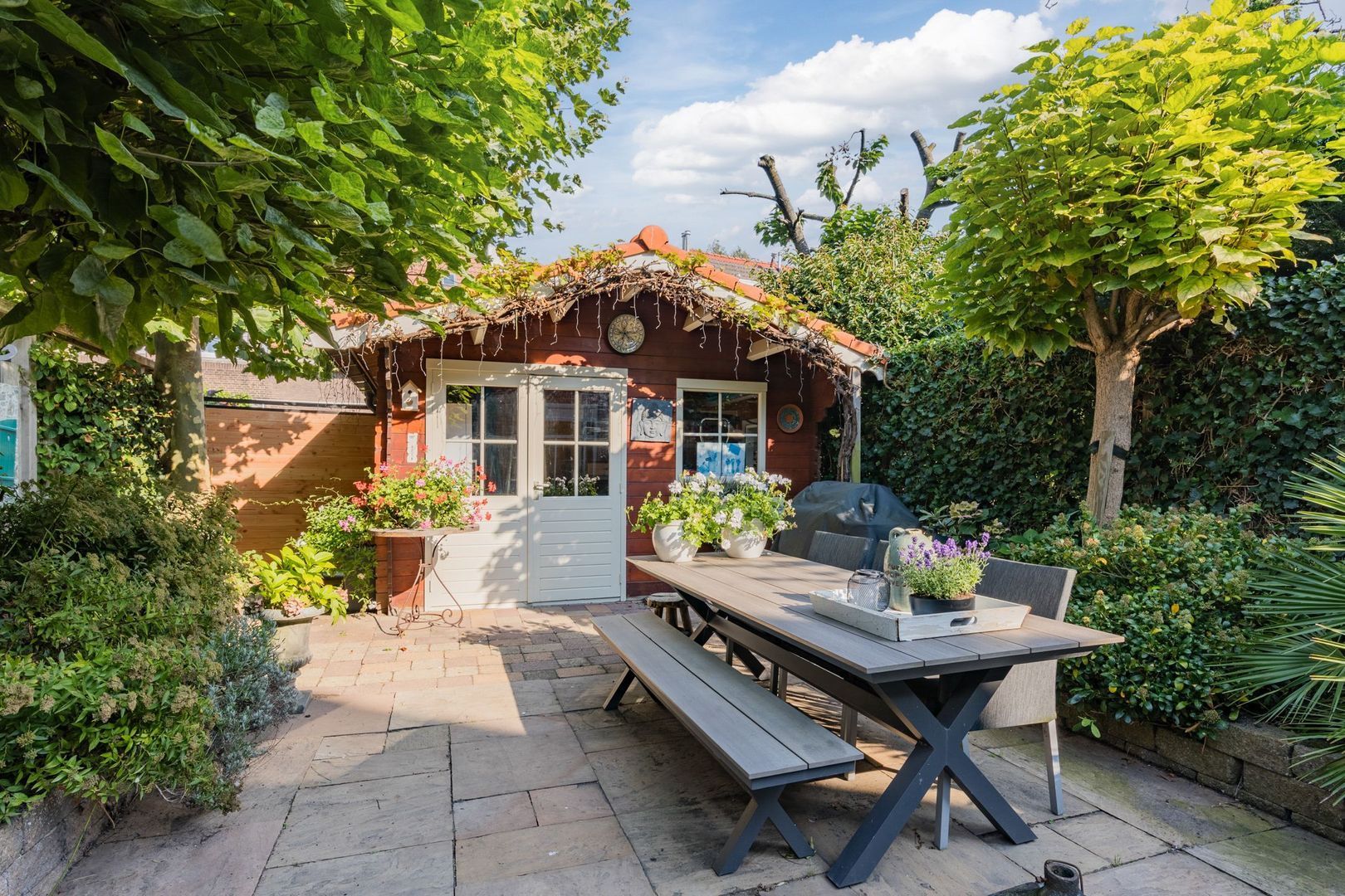 De tuin is bereikbaar via openslaande deuren van uit de woonkamer en via openslaande deuren vanuit het eetkamer gedeelte, daarnaast is er een achterom. Grote houten chalet berging van 10 m2 voorzien van elektra en een pannendak.