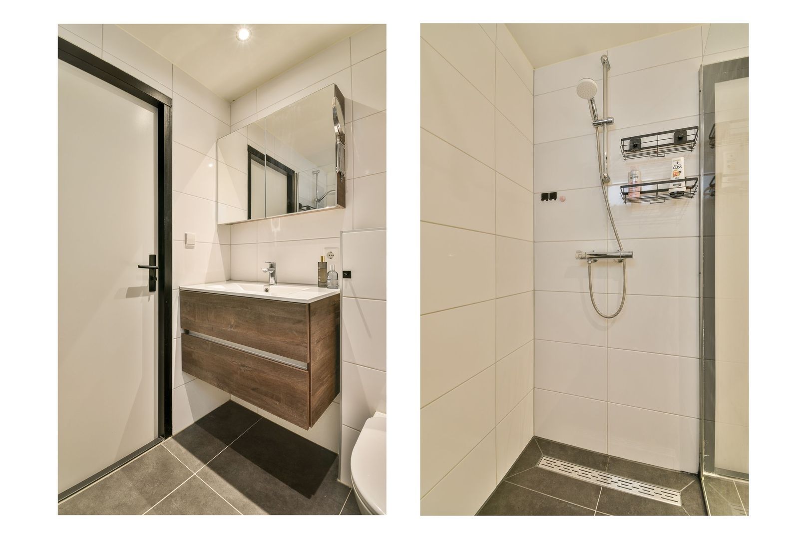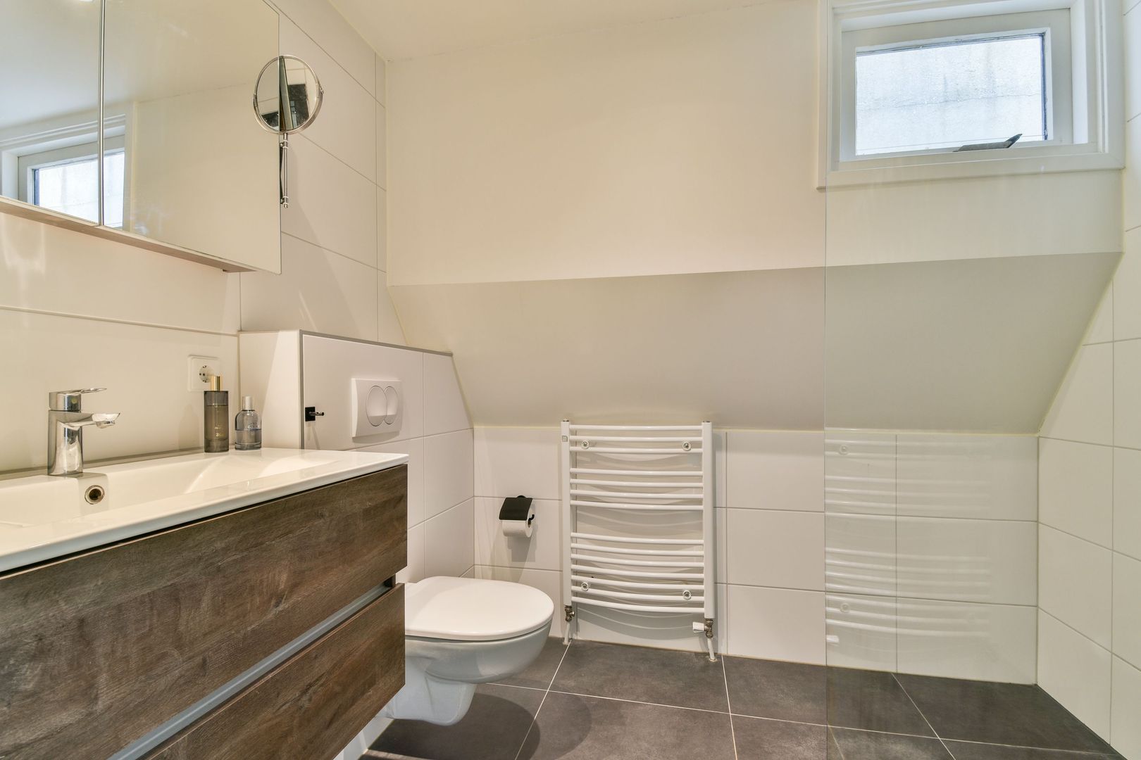 Tussen de slaapkamers in vindt u de moderne badkamer met fraaie betegeling, inloopdouche, 2e toilet en wastafel in handig meubel.