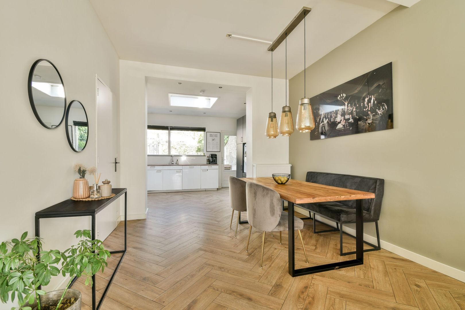 De gehele woonkamer is voorzien van een fraaie visgraat laminaatvloer.