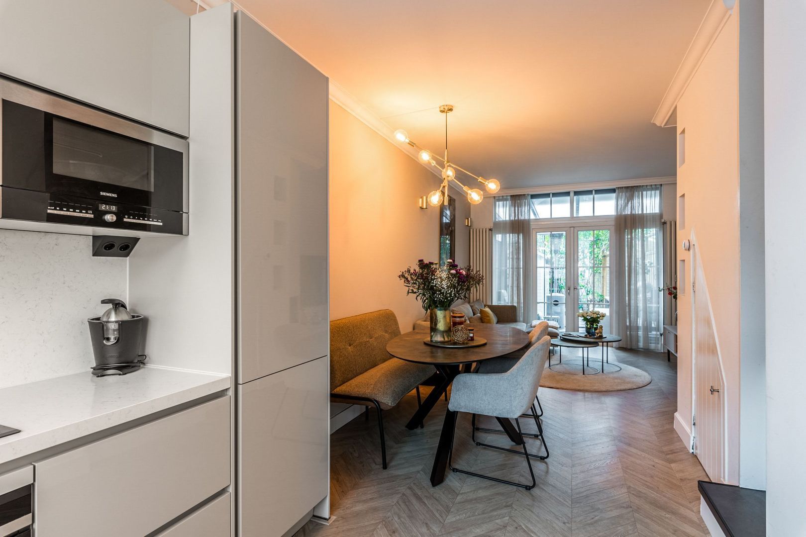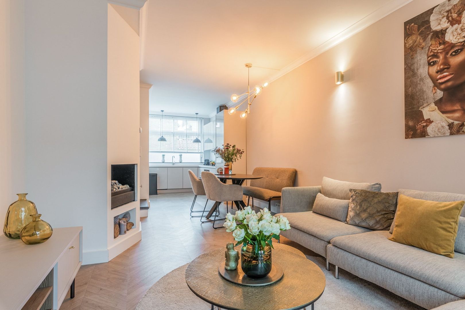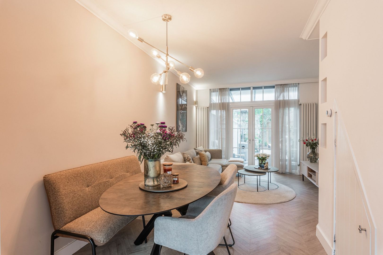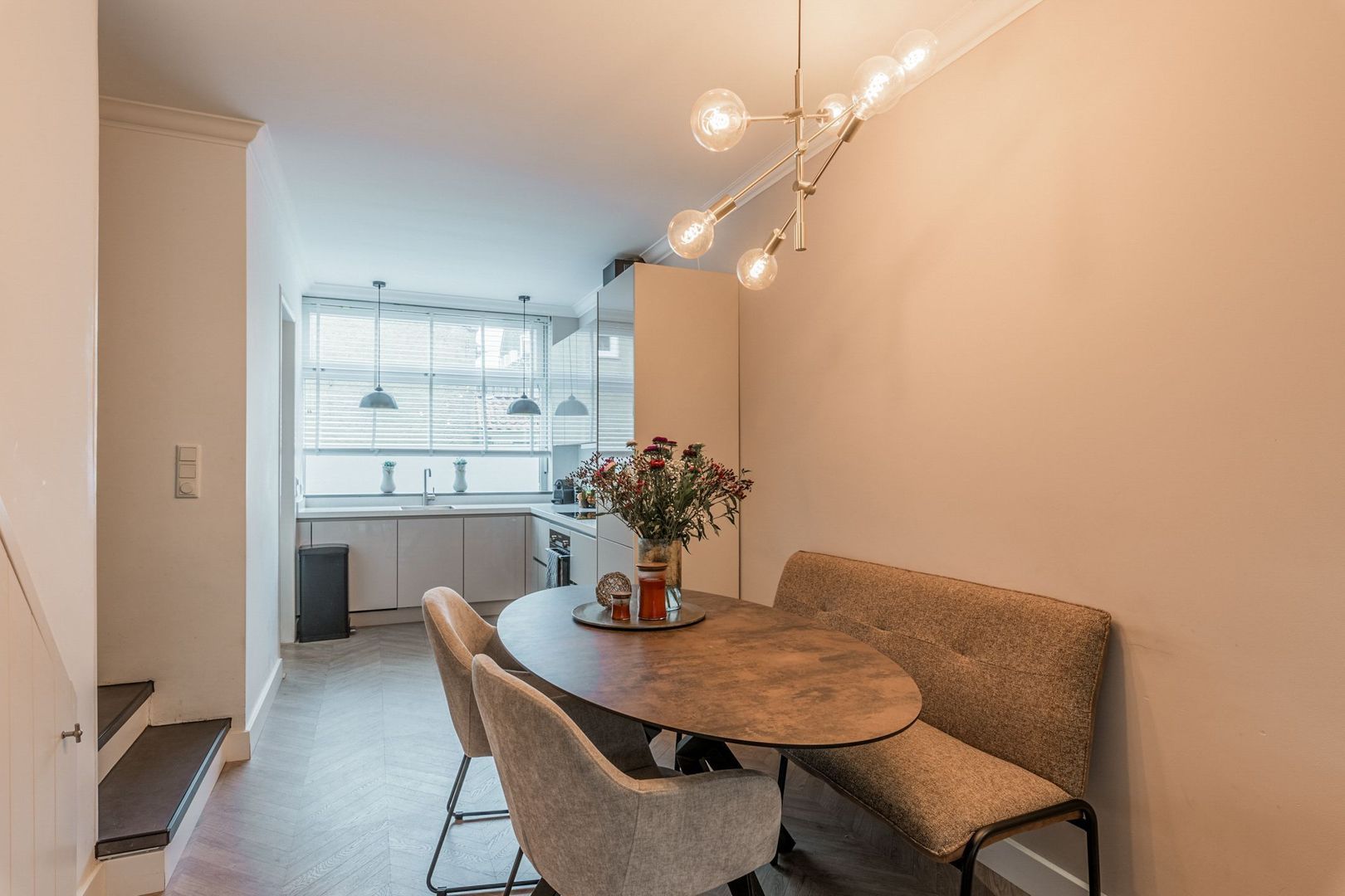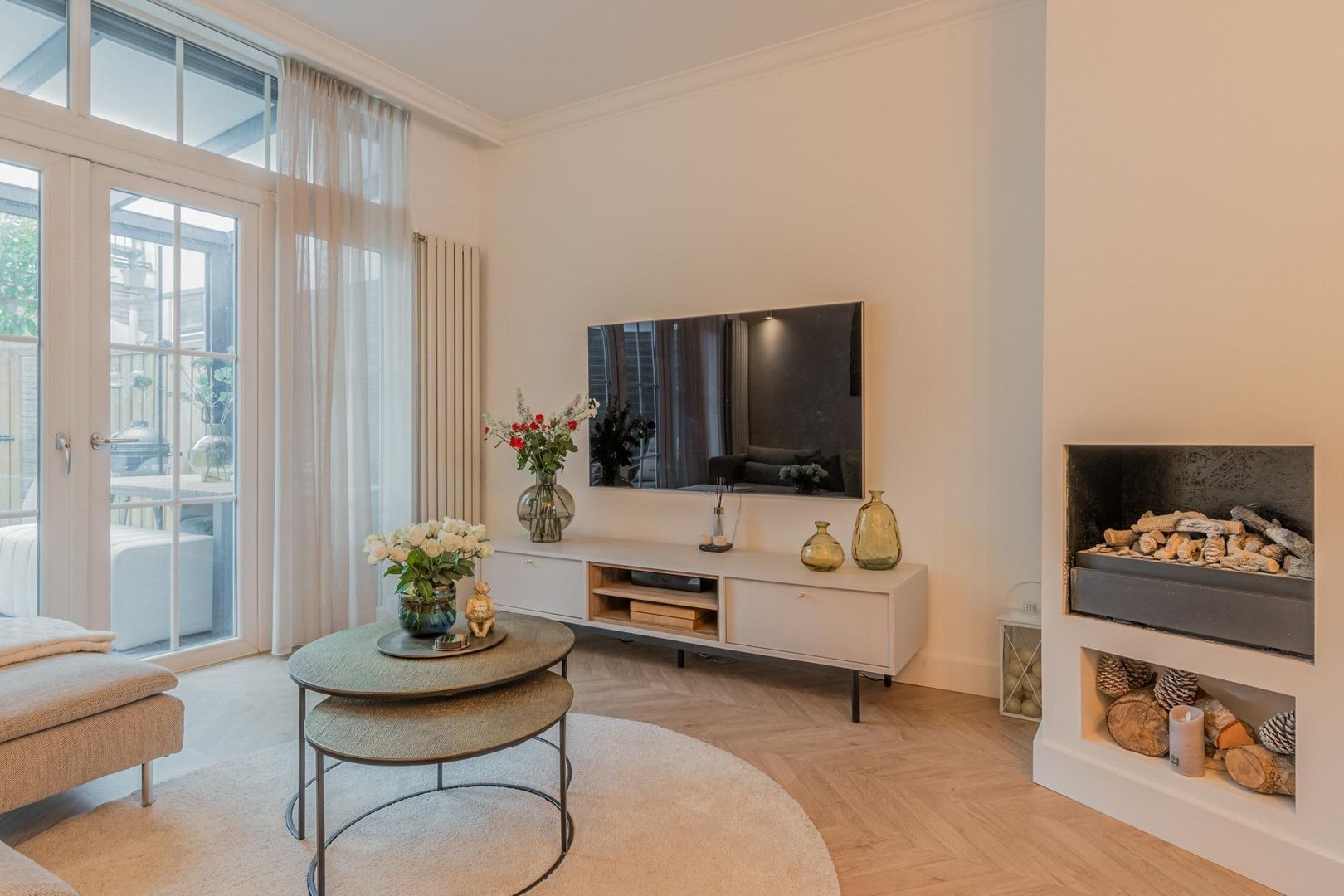 De woonkamer is strak afgewerkt met gestucte wanden, plafondlijsten, twee wandradiatoren en onder de trap is naast de trapkast een elektrische sfeerhaard geplaatst. Ook ligt er een moderne houtlook laminaatvloer in visgraat.