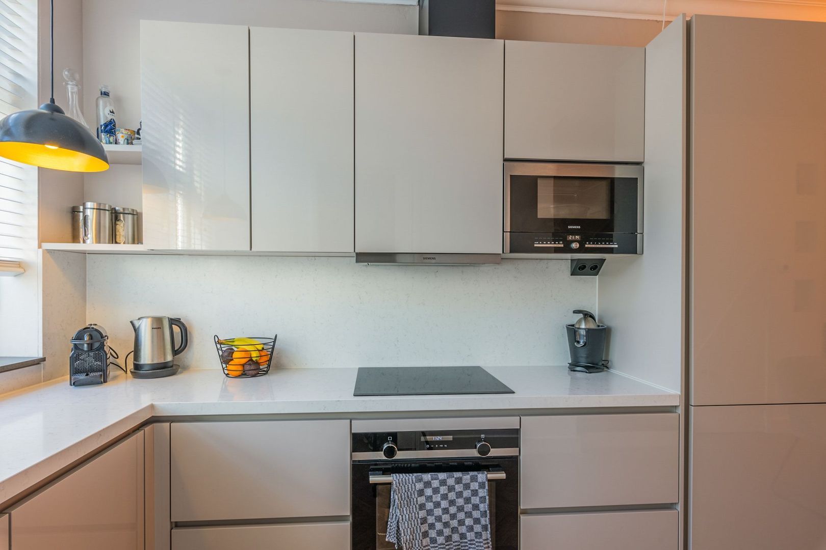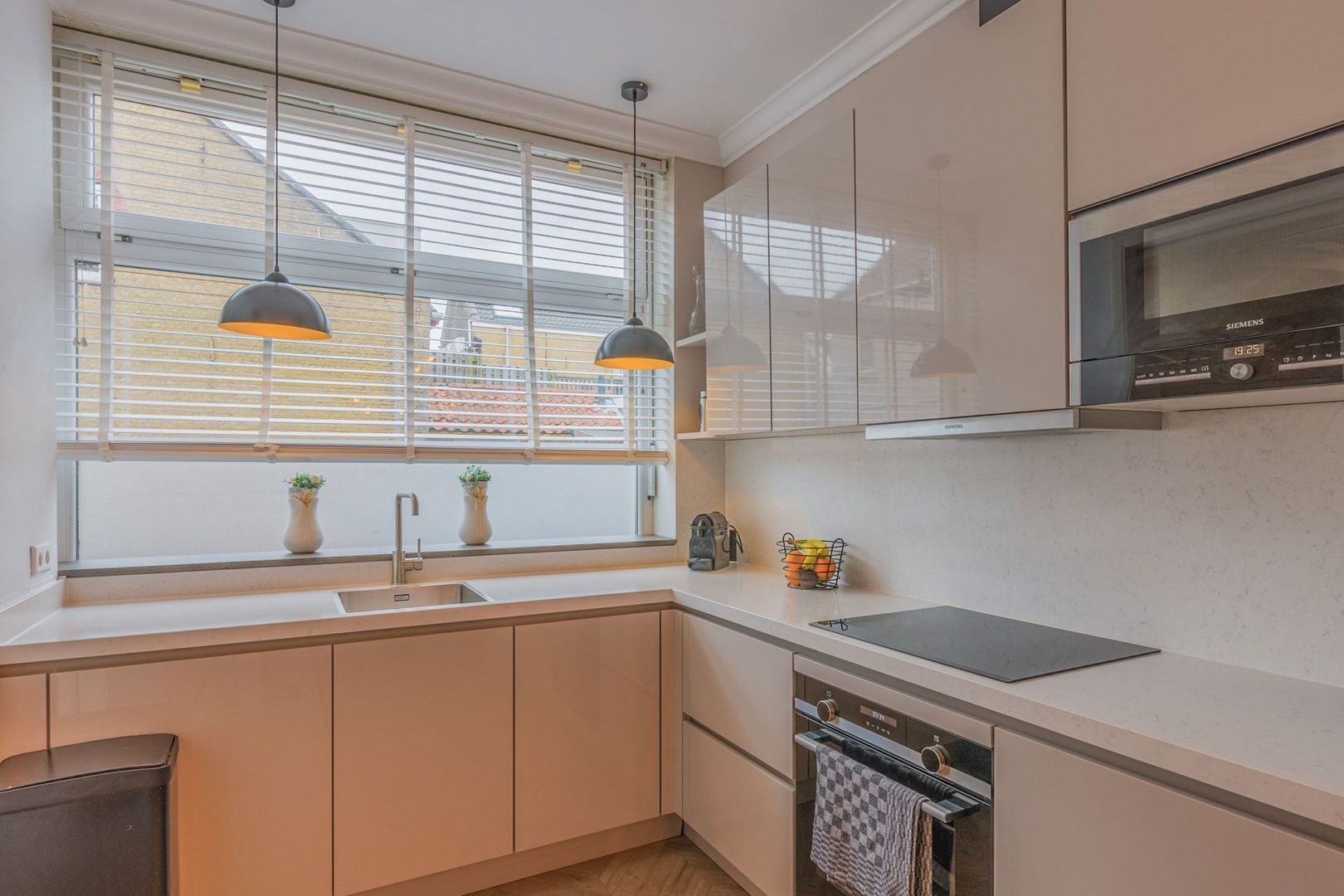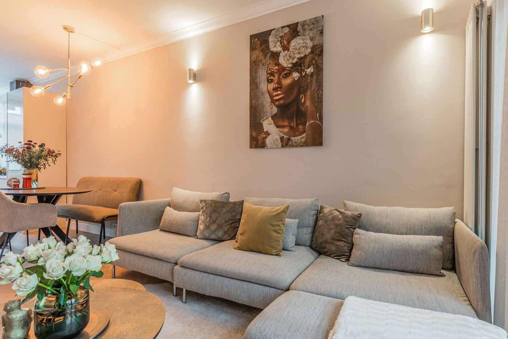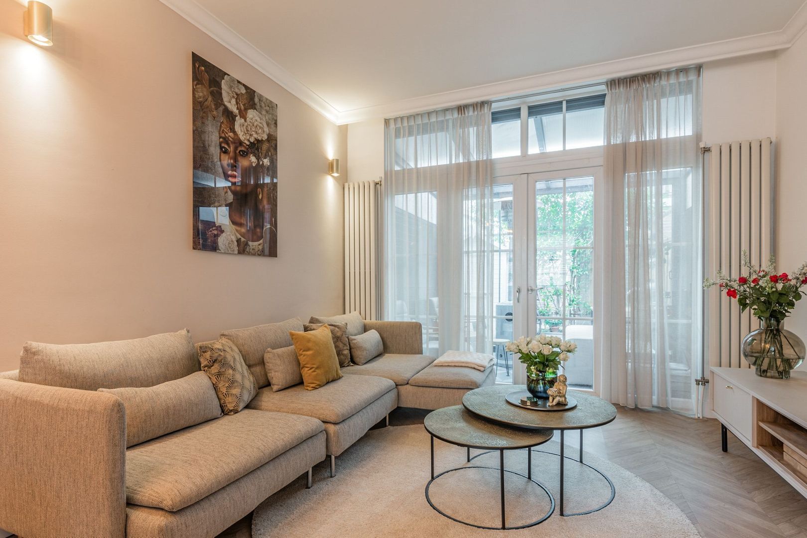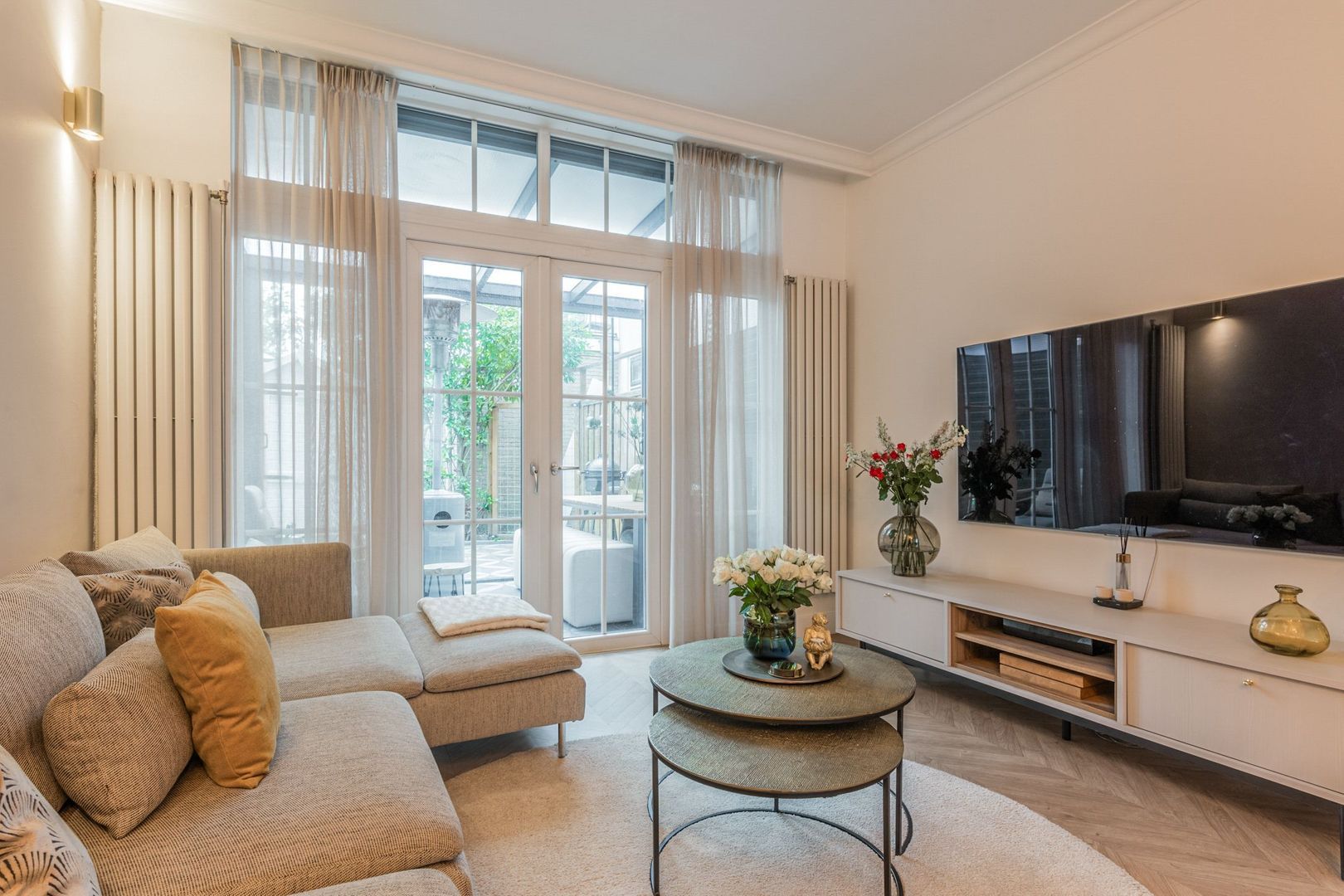 De woonkamer is strak afgewerkt met gestucte wanden, plafondlijsten, twee wandradiatoren en onder de trap is naast de trapkast een elektrische sfeerhaard geplaatst. Ook ligt er een moderne houtlook laminaatvloer in visgraat.
