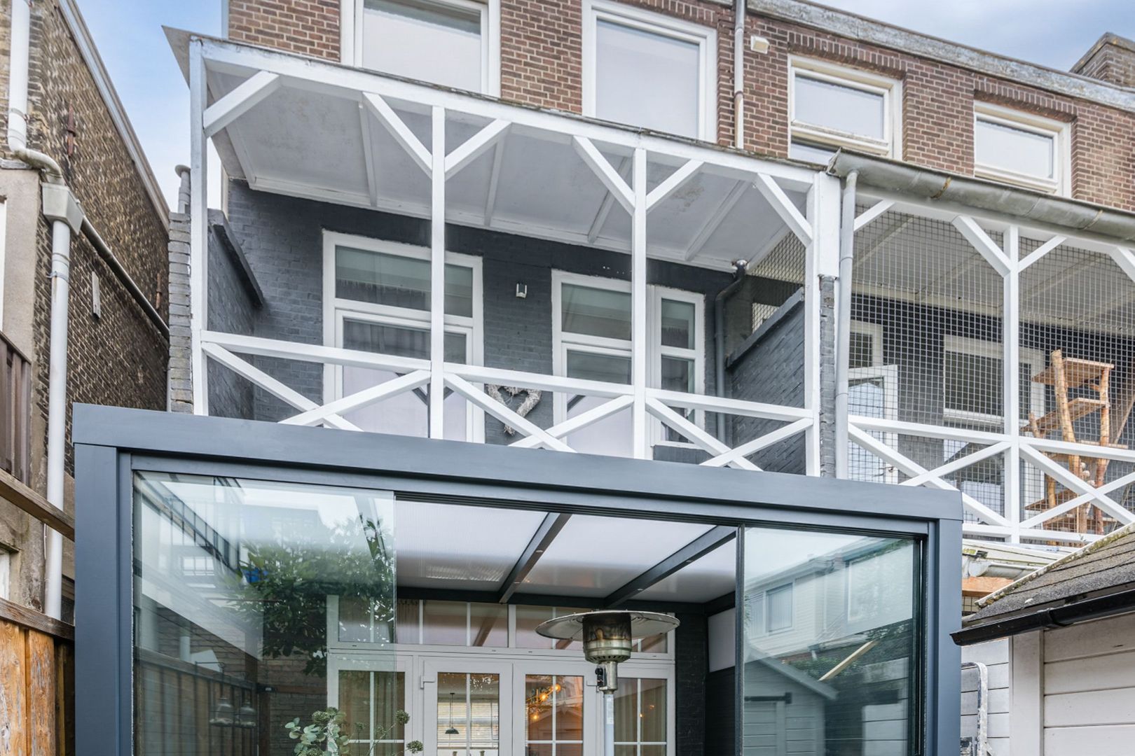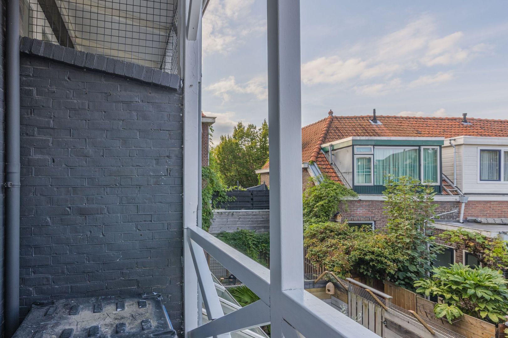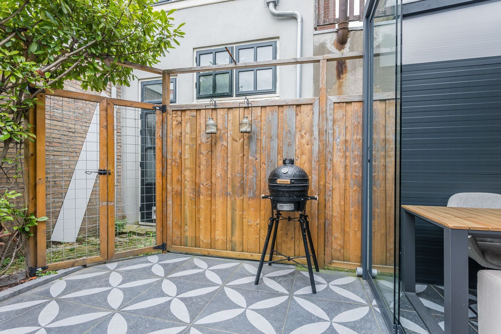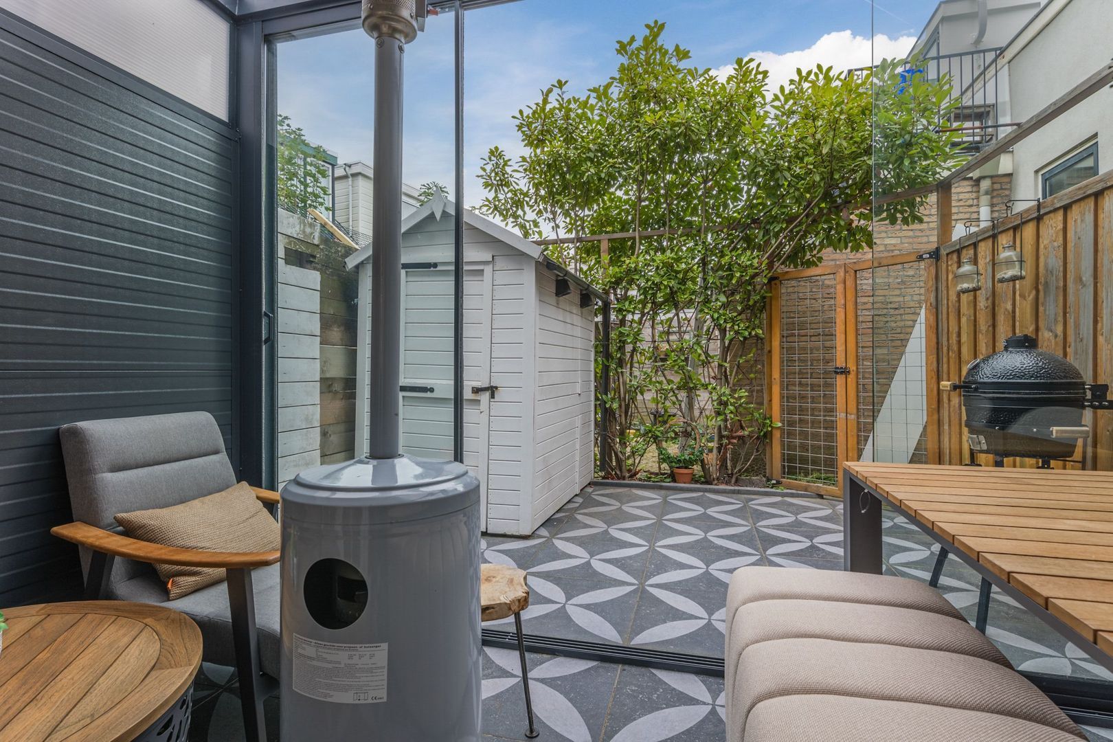 De aan de serre grenzende tuin is eveneens betegeld en in de tuin staat een kleine berging. Daarnaast is er een poort naar de zijsteeg.