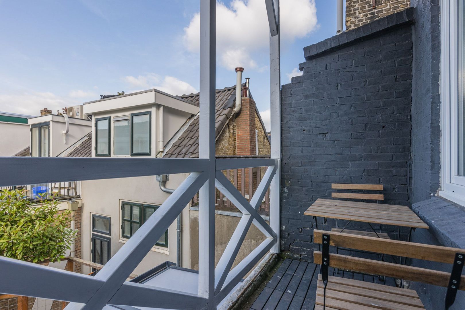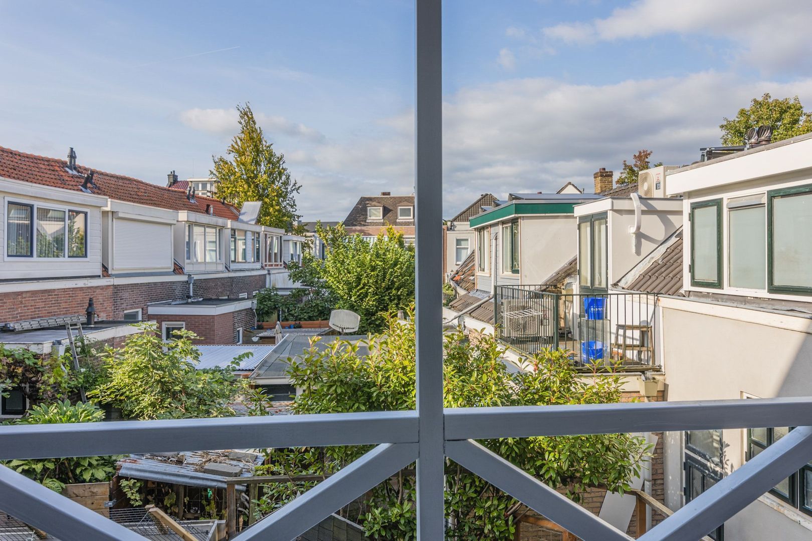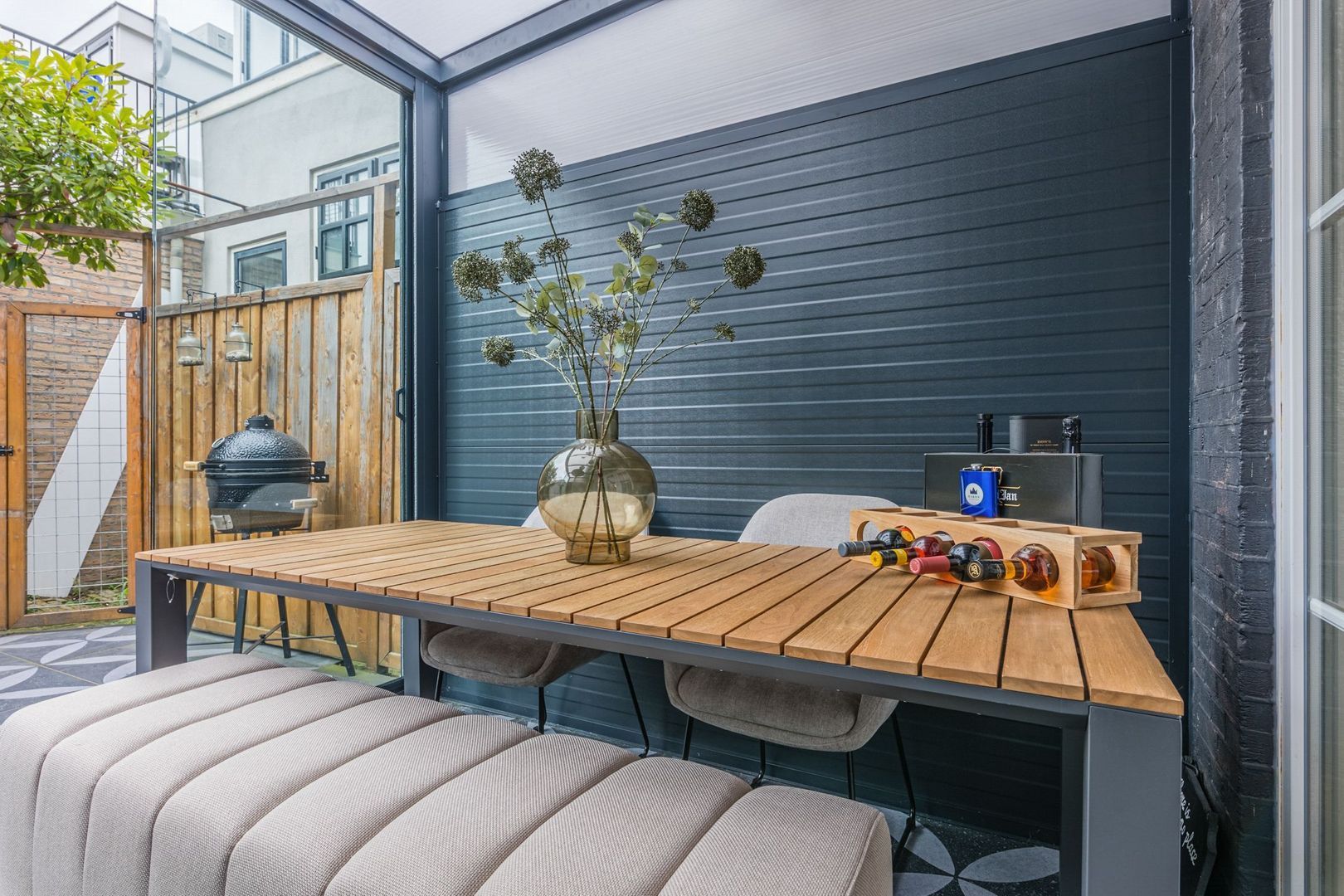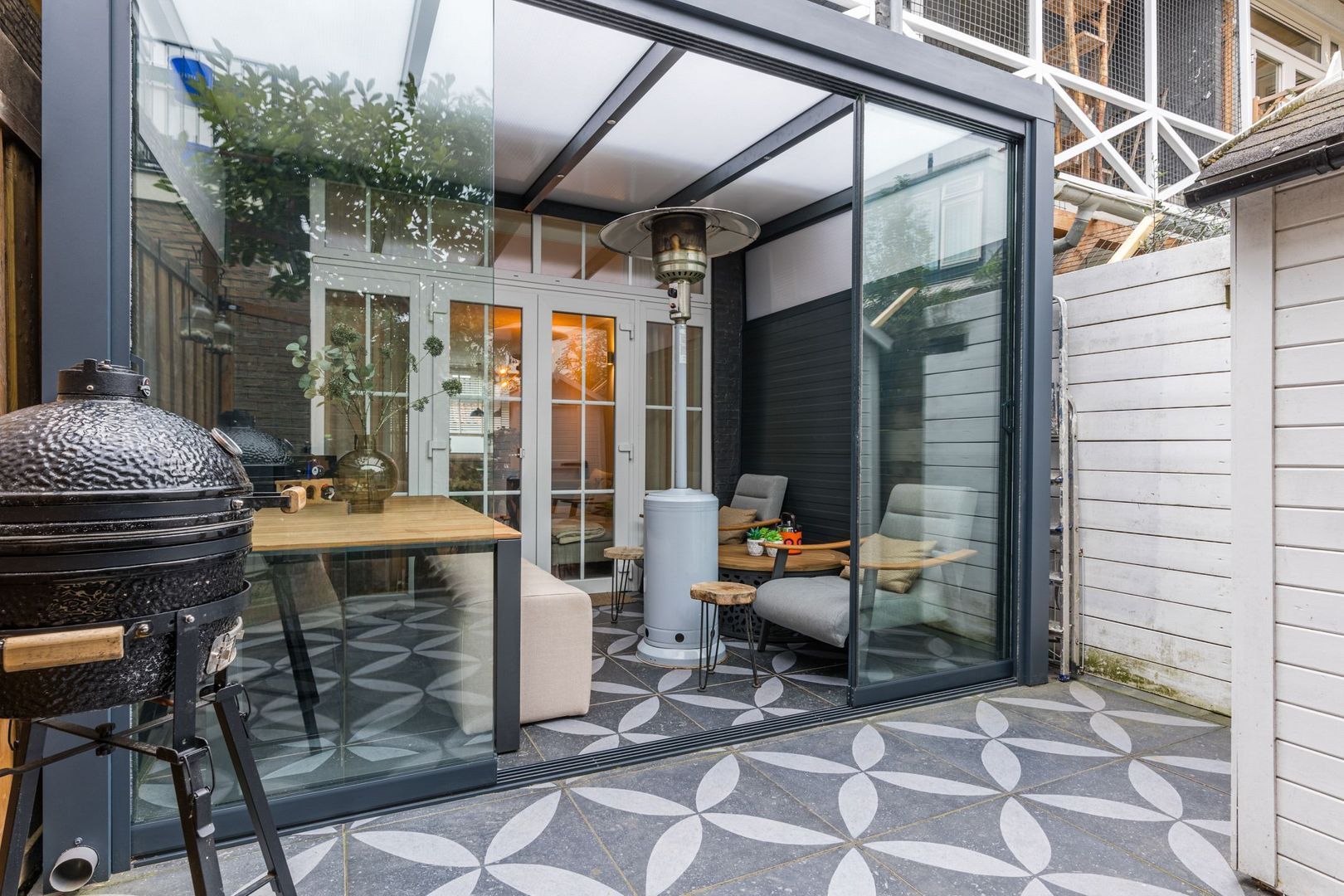 De aan de serre grenzende tuin is eveneens betegeld en in de tuin staat een kleine berging. Daarnaast is er een poort naar de zijsteeg.