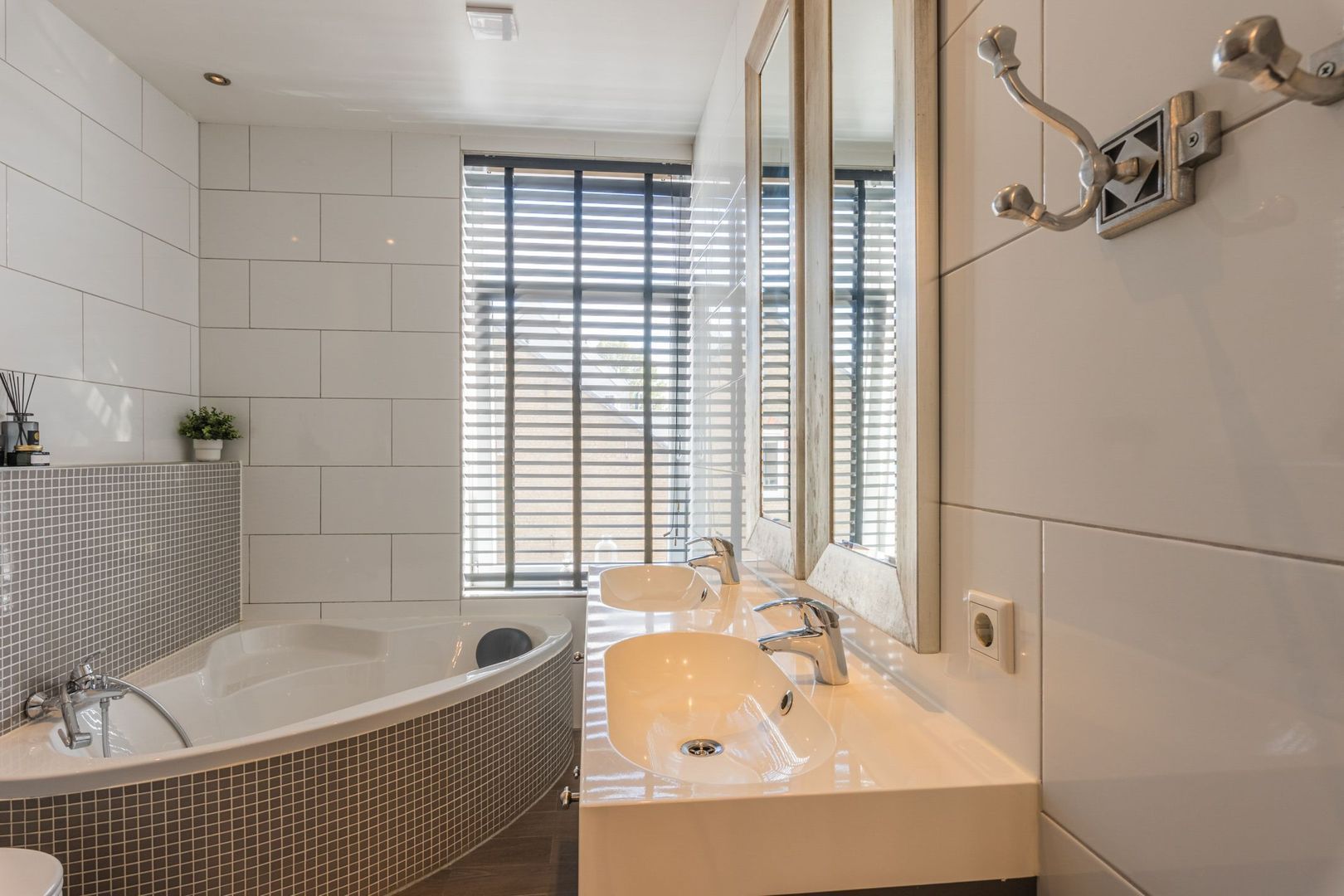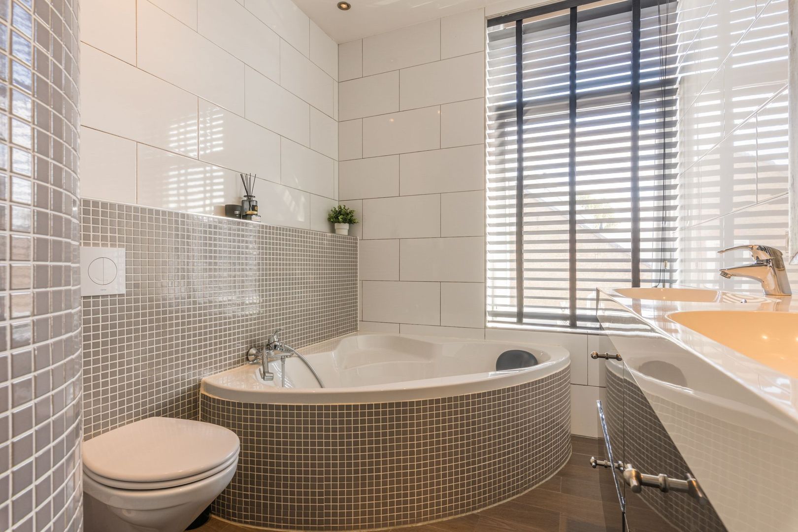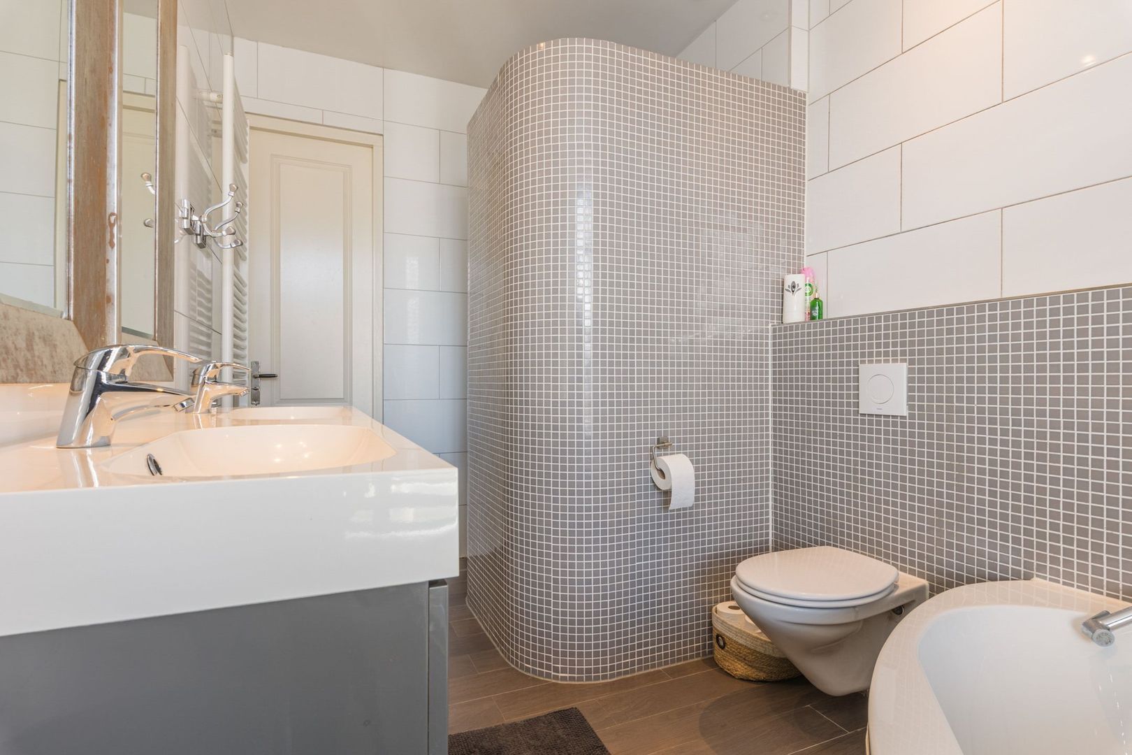 en uitgevoerd met een ruim hoekligbad, zwevend toilet, een dubbel wastafelmeubel, een designradiator en een inloopdouche afgescheiden door een rond weglopende muur. Het plafond is voorzien van inbouwspots en een electrische ventilator.