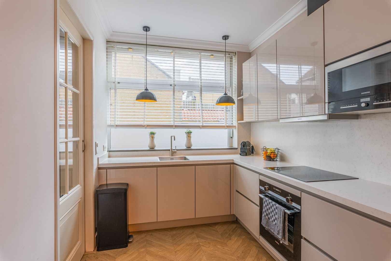 Entree, hal met meterkast. Gedeeltelijk betegelde toiletruimte met een zwevend closet en inbouwspots. Via de hal toegang tot de woonkamer met aan voorzijde de open keuken met leuk zicht over het straatje. De woonkamer en keuken zijn totaal ca. 27 m2 groot. De keuken is voorzien van een modern keukenblok in hoekopstelling uit 2023 met spoelbak, inductie kookplaat, afzuigplint, oven, magnetron, koelkast, vriezer en vaatwasser.