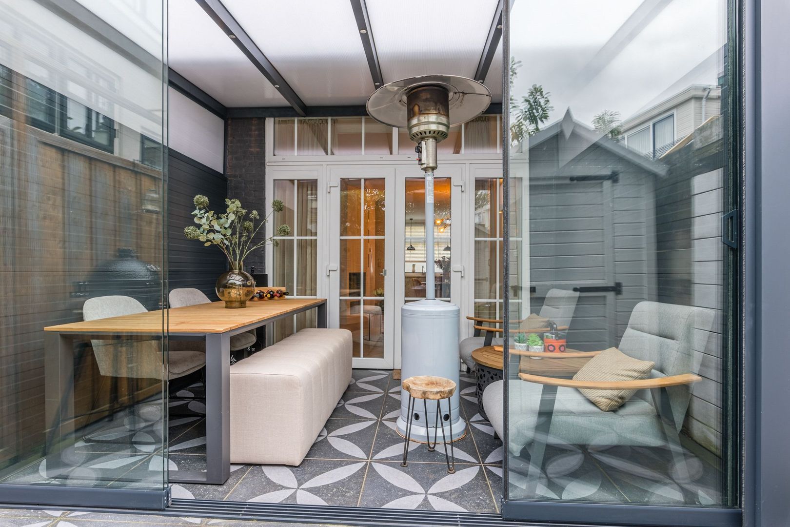 Openslaande deuren vanuit de woonkamer geven toegang tot de aluminium serre van ongeveer 9 m2 met inbouwspots en betegelde vloer. Aan de tuinzijde is de serre ook met schuifdeuren af te sluiten. Zo kan de serre zowel een binnen- als buitenfunctie hebben.