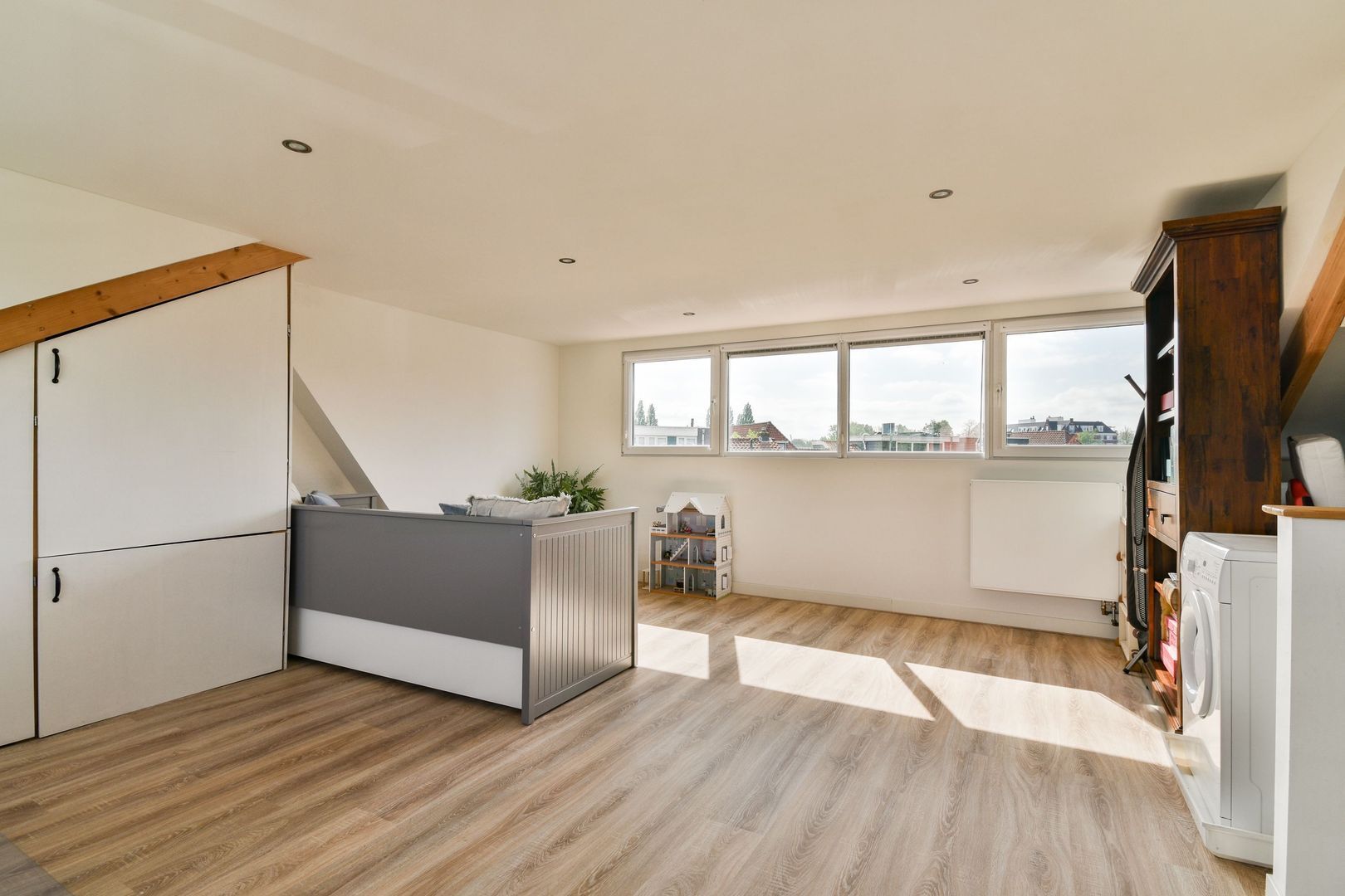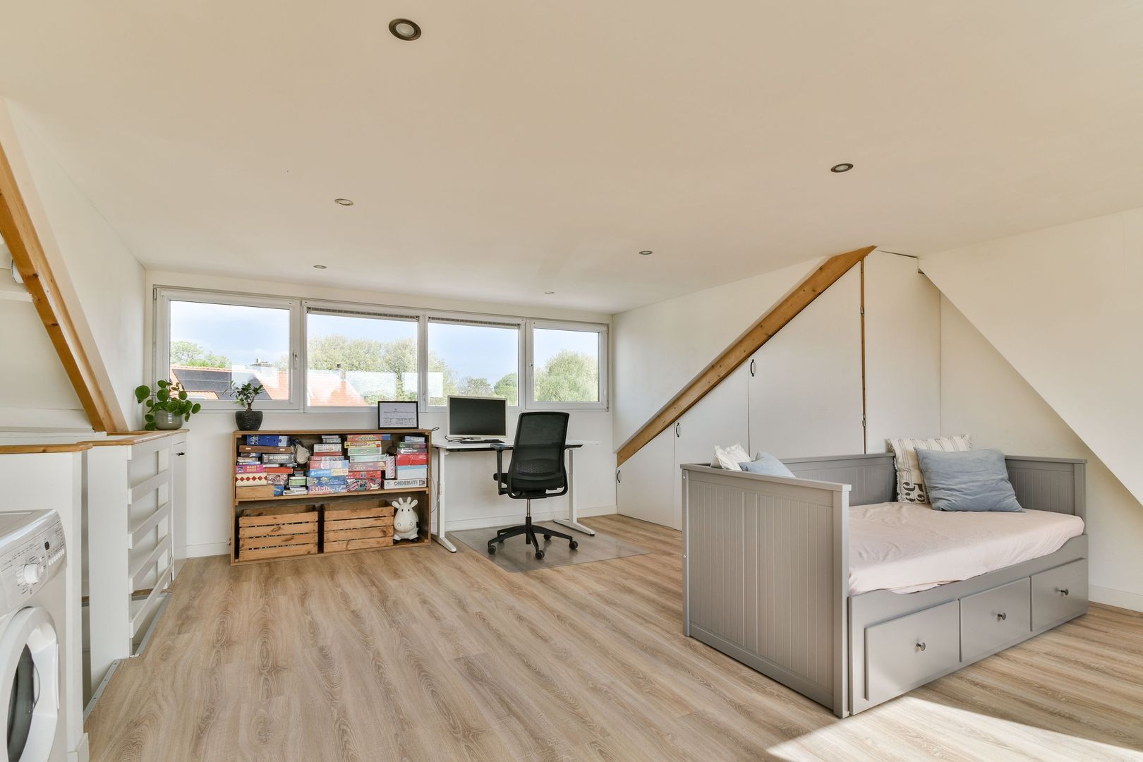 Grote open zolder van 28 m2 met aan de voor- en achterzijde een grote kunststof dakkapel met HR++ dubbel glas, gestuukt plafond met ingebouwde verlichting. Er is bergruimte in de schuine schotten, aansluiting wasmachine, CV-ketel opstelling.