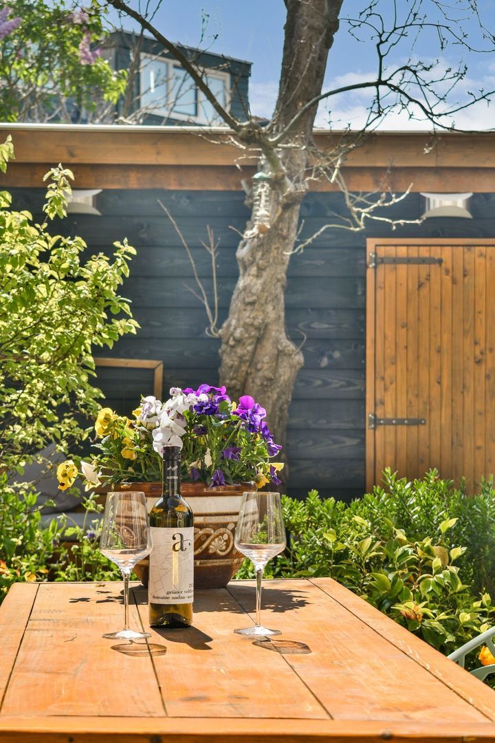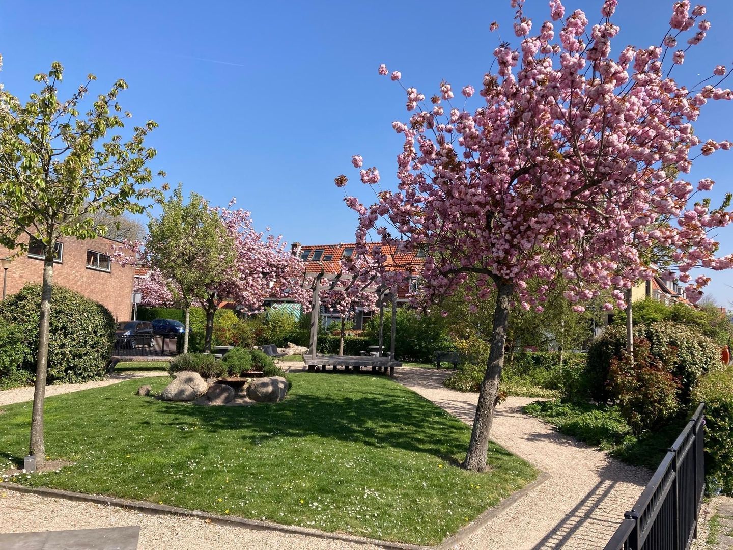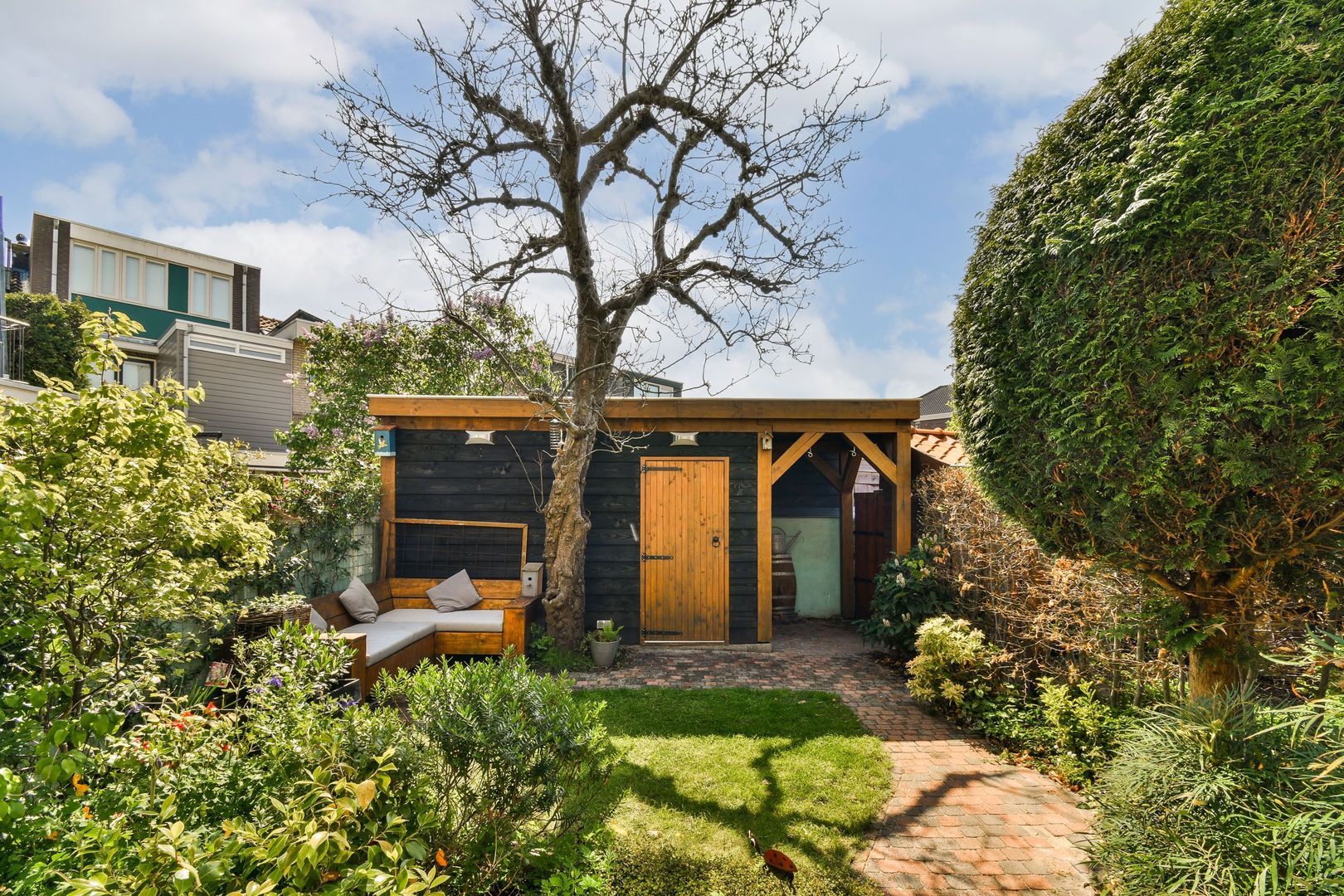 Zonnige, leuk aangelegde achtertuin op het zuiden met veel groen, en een grote schuur van Douglas en Eikenhout van 9 m2 voorzien van betonvloer en elektra.
