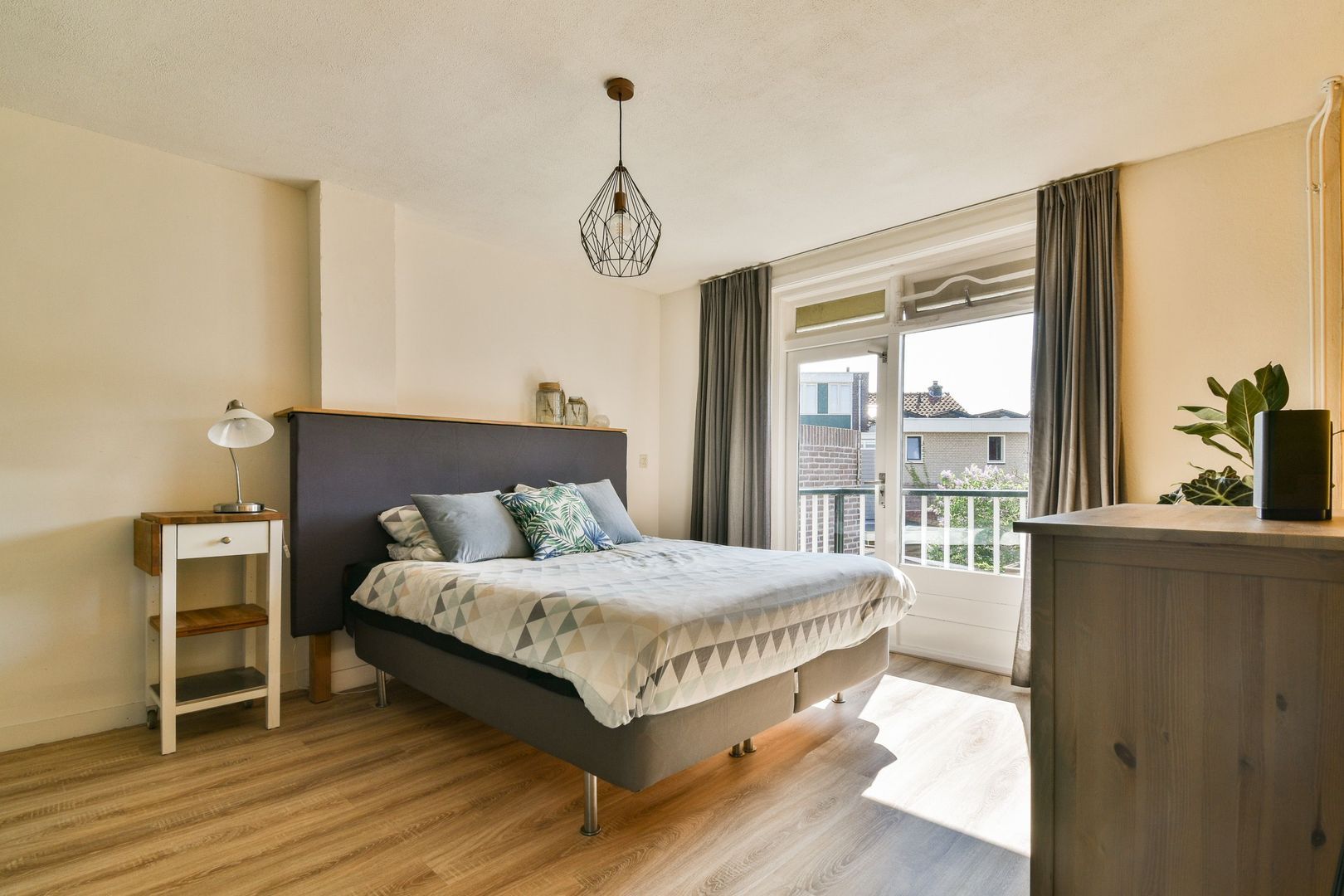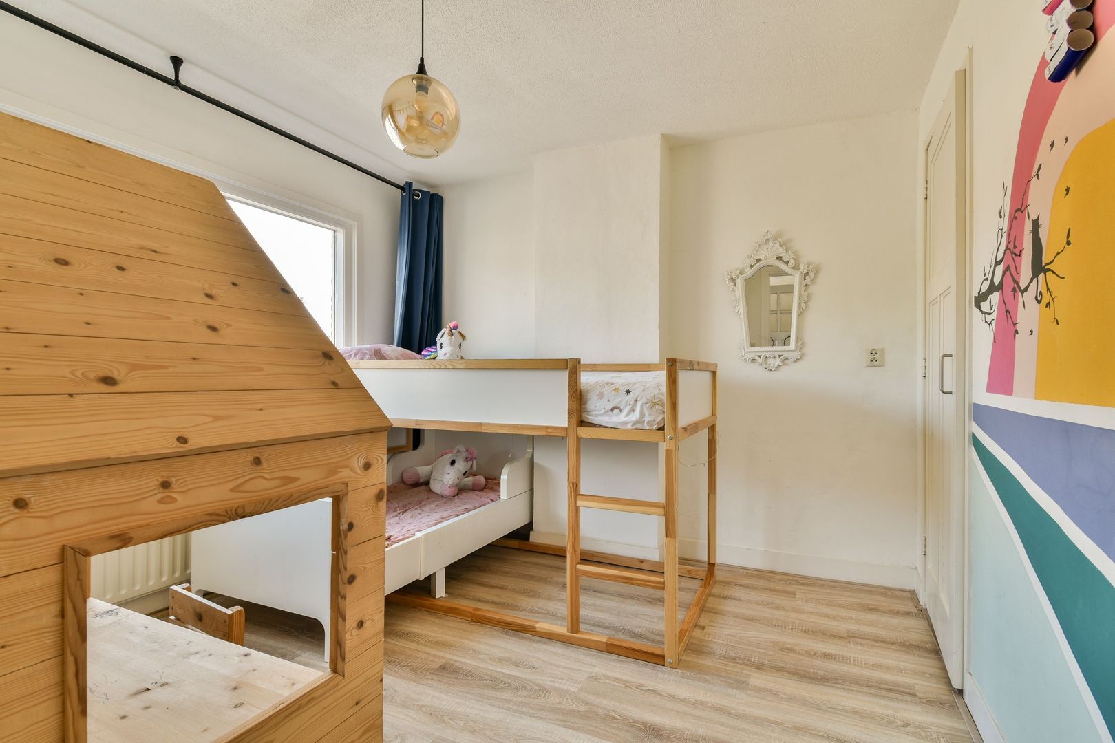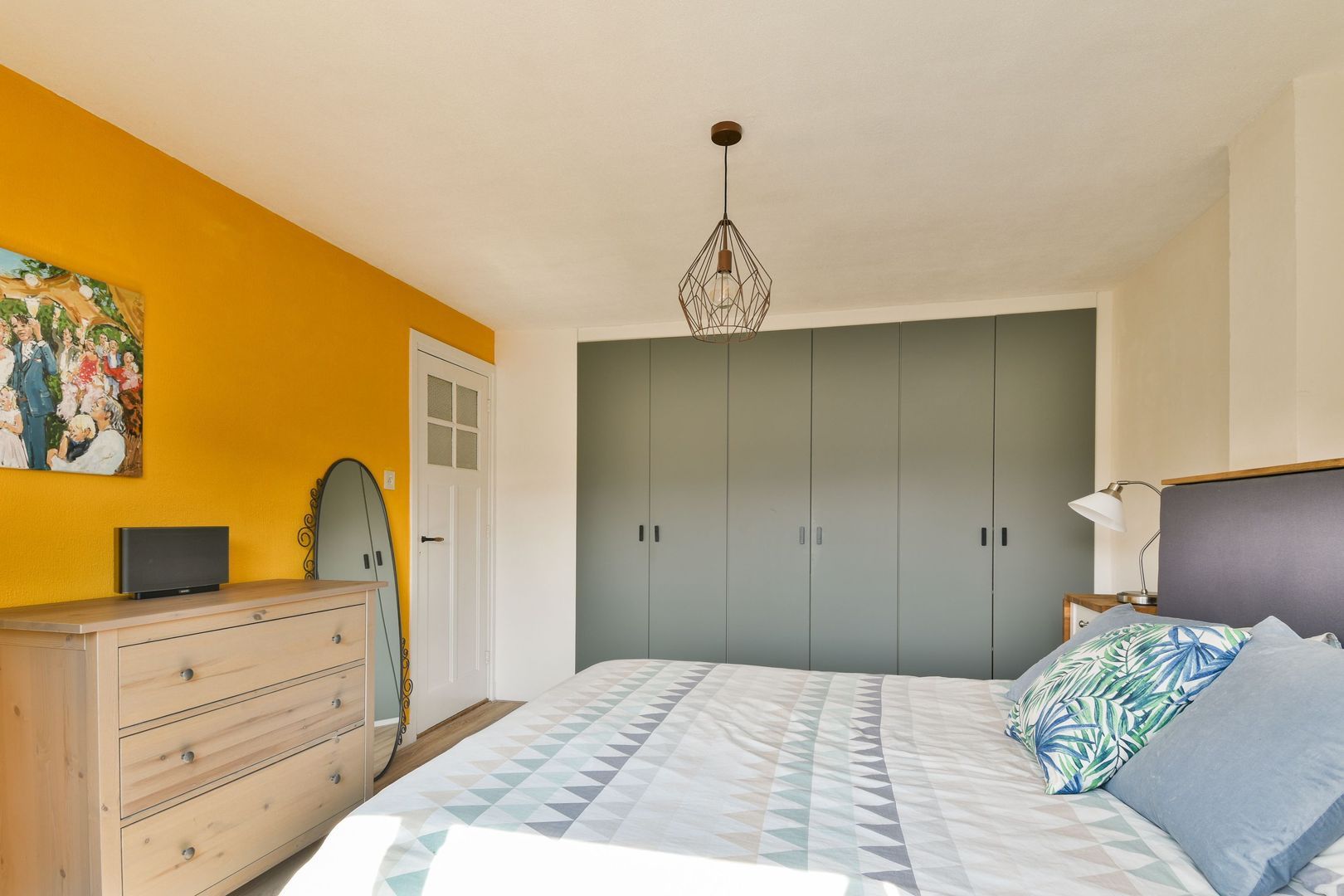 Voorslaapkamer van 11 m2 met laminaatvloer, vaste kast en vrij uitzicht.