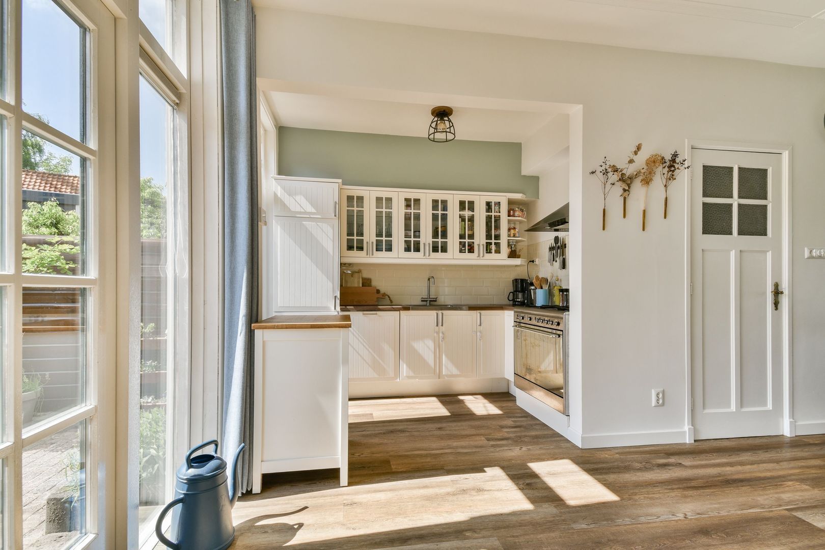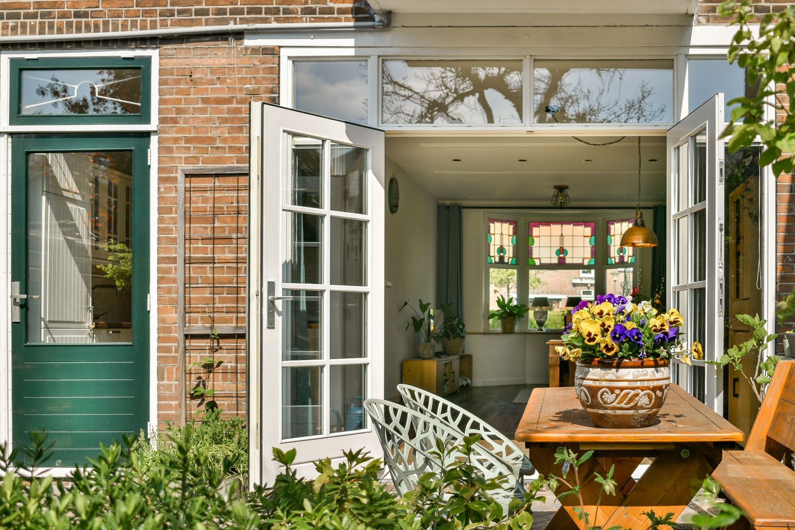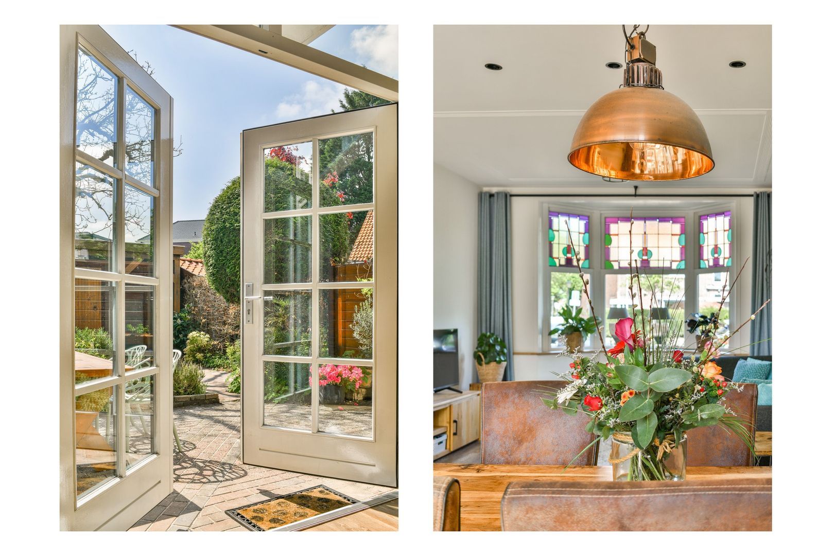 • Kozijnen deels in hout uitgevoerd, geheel dubbel glas en deels HR++-glas, glas-in-loodramen voorzien van