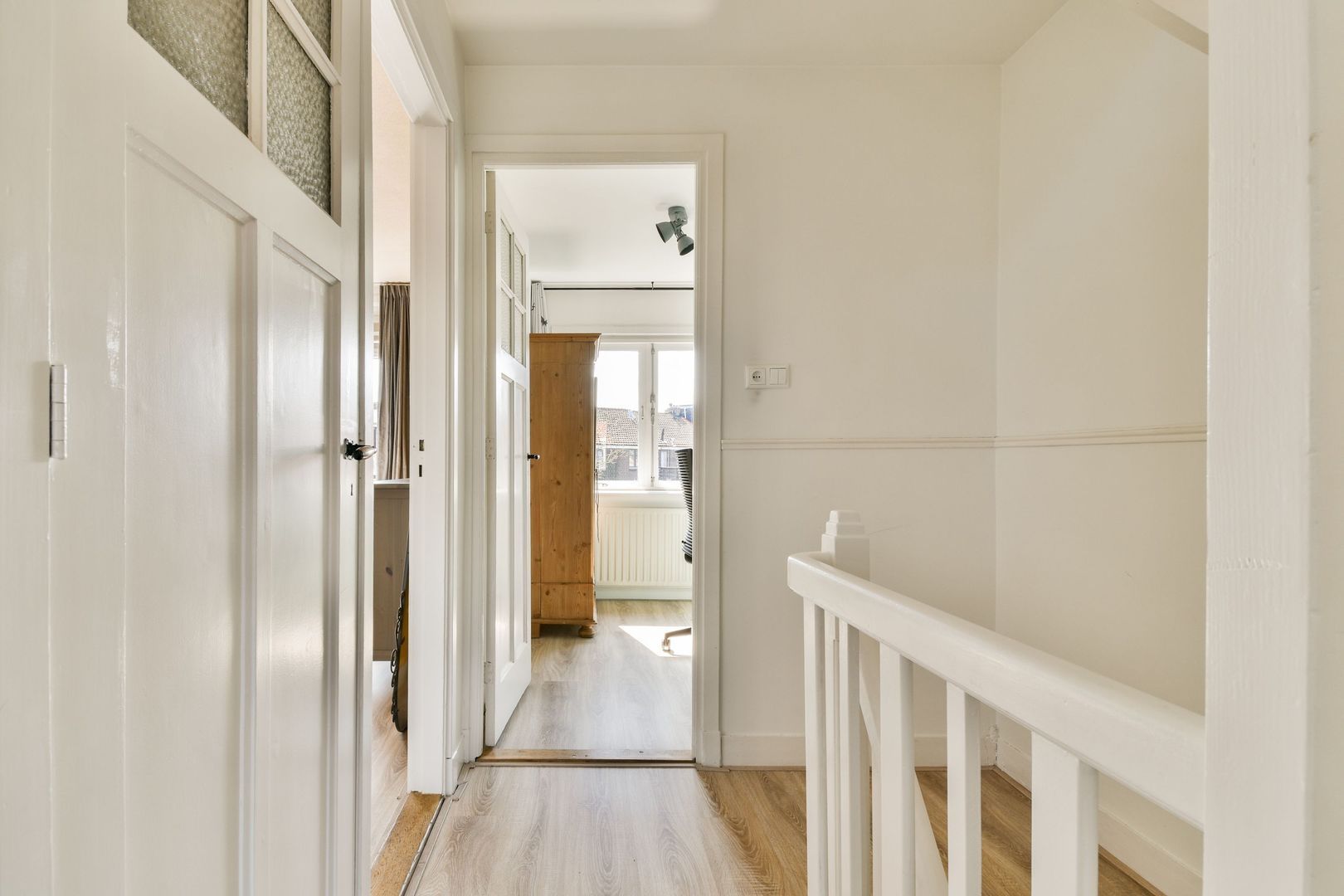 Overloop met vaste kast en toegang tot alle vertrekken op de verdieping. De gehele verdieping is voorzien van een laminaatvloer en authentieke paneeldeuren.