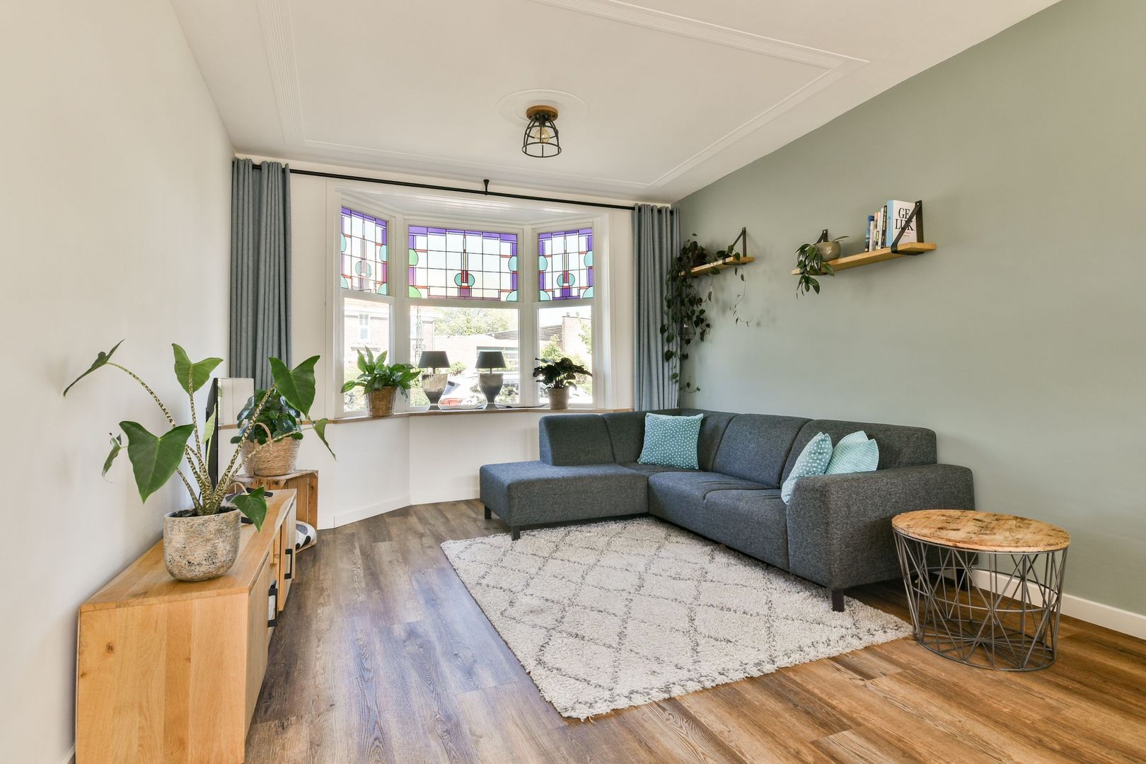 Royale woonkamer van 36 m2 met mooie pvc-vloer met vloerverwarming, gestuukt plafond met originele ornamenten en ingebouwde verlichting, erker met sfeervolle glas-in-loodramen, openslaande deuren naar de tuin.