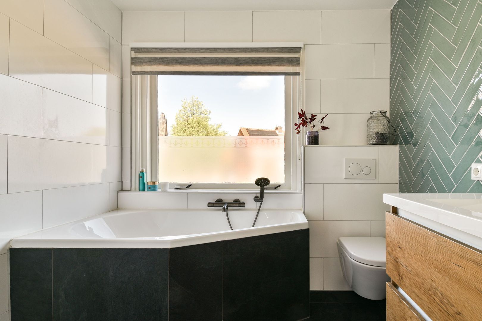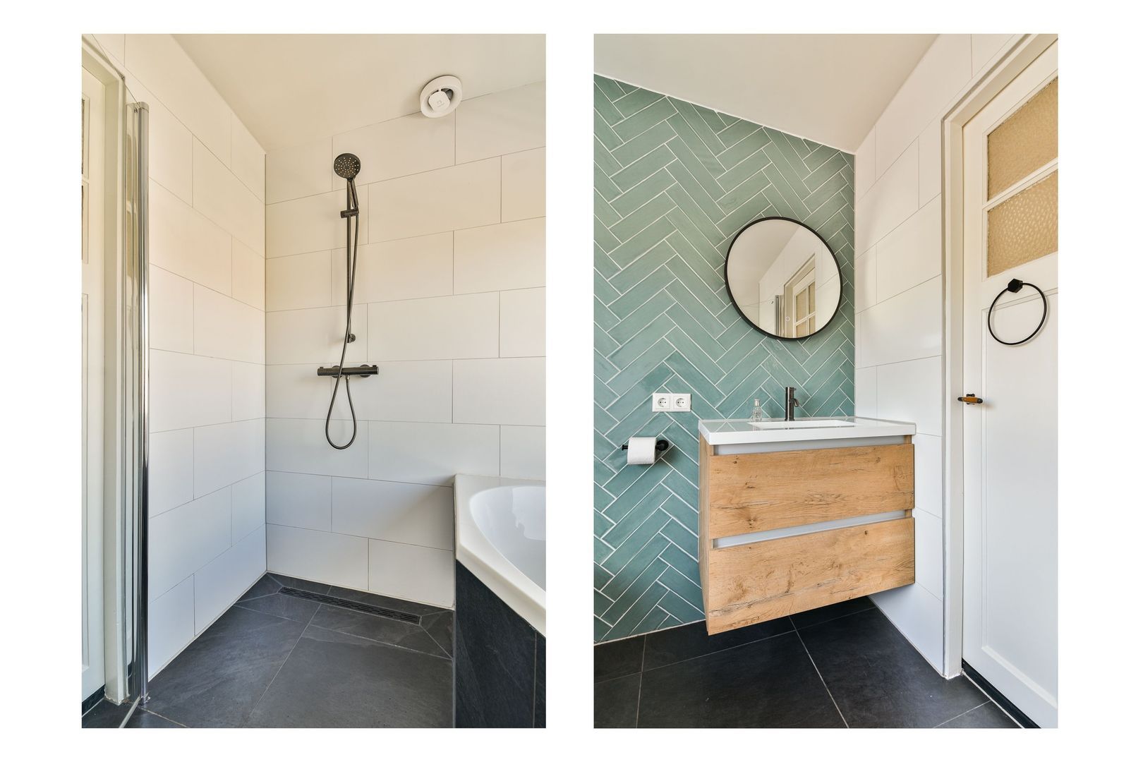 Recent vernieuwde badkamer met modern tegelwerk, inloopdouche met watergoot, comfortabel ligbad, wastafelmeubel en hangend 2e toilet. Daglicht in de badkamer en lekker comfortabele vloerverwarming.