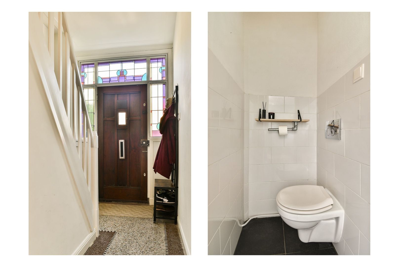 Entree met hal met authentieke terrazzovloer, meterkast, trap-/kelderkast, verzorgde toiletruimte met zwevend toilet en witte wandtegel.