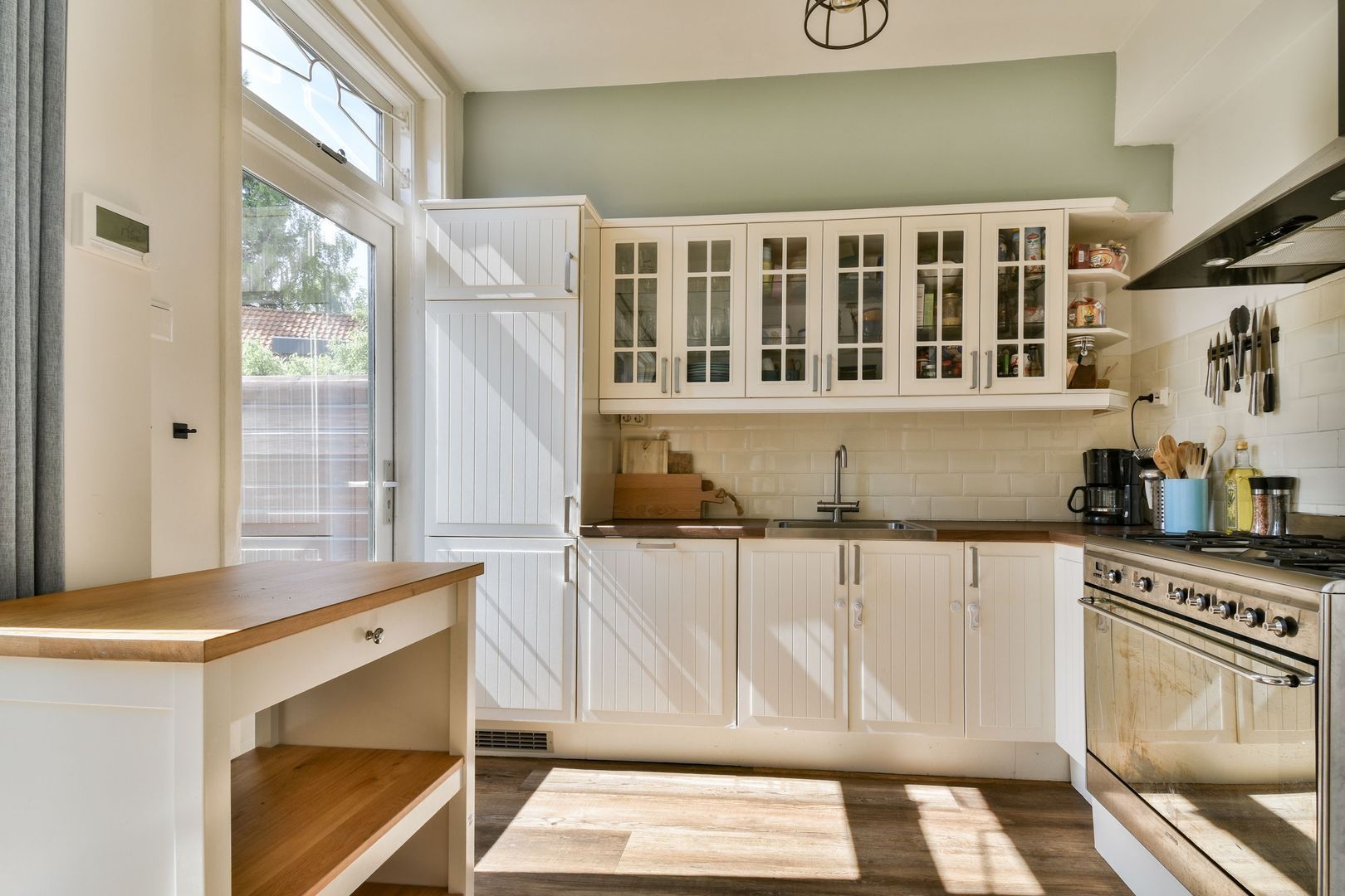 Moderne keuken in hoekopstelling met betegelde achterwand, veel kastruimte en de volgende apparatuur: vaatwasser, brede RVS oven met 5 pits-gasfornuis, afzuigkap, heetwaterkraan en koel-/vrieskast, extra deur naar de zonnige tuin.